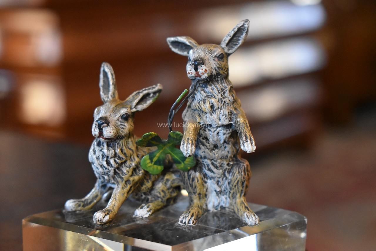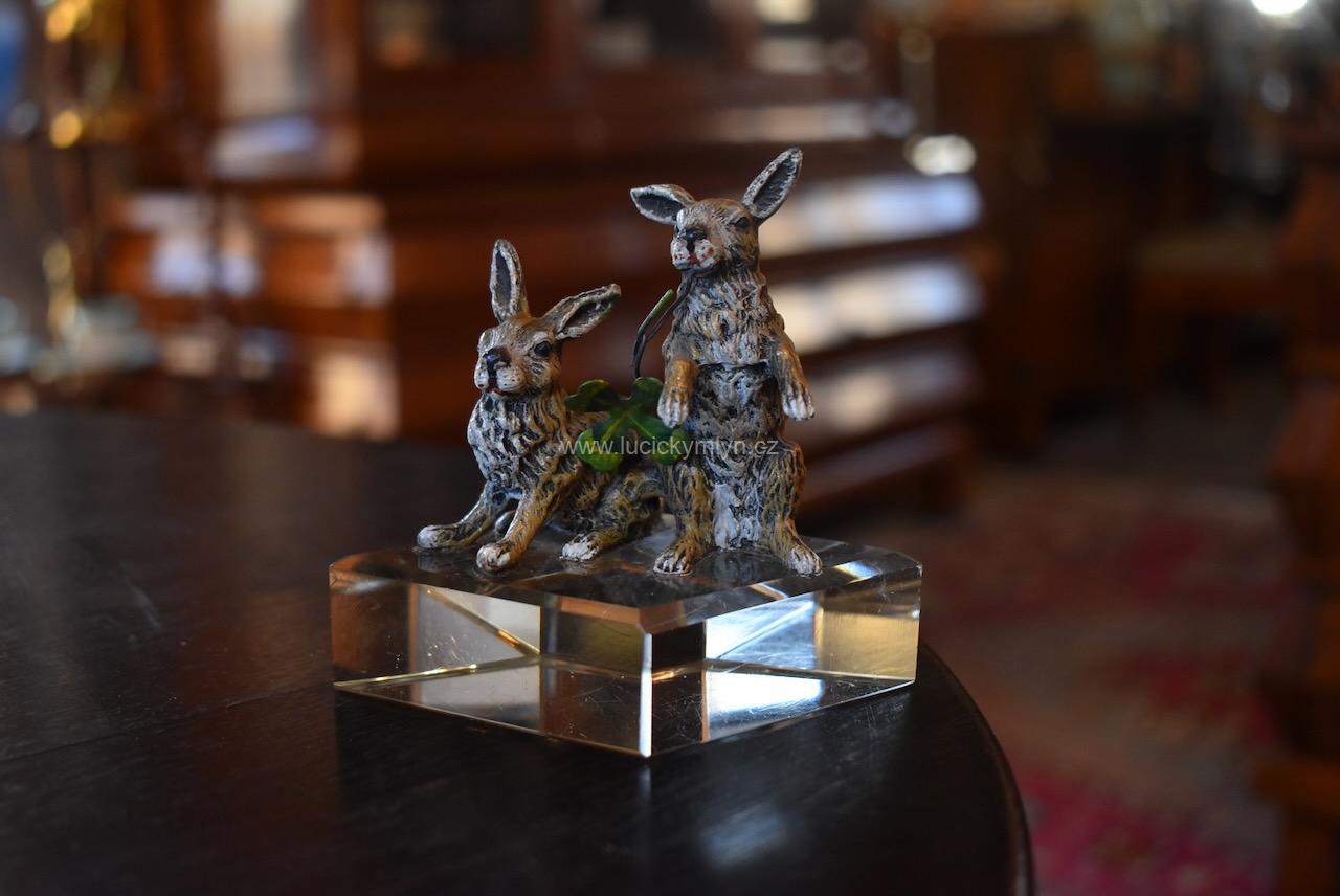 Starožitné těžítko pro štěstí s figurkami zajíců a čtyřlístkem – umělecky litá cínová slitina na podstavě z broušeného skla