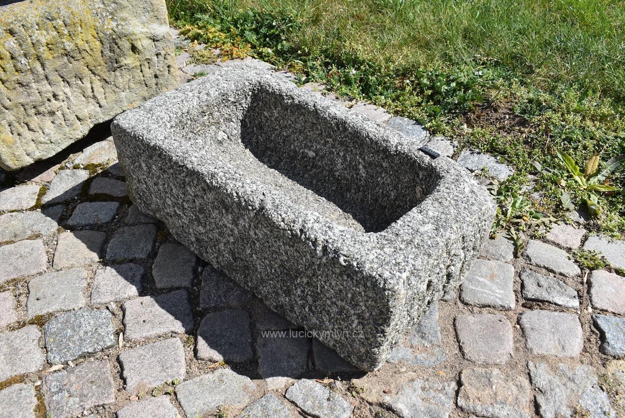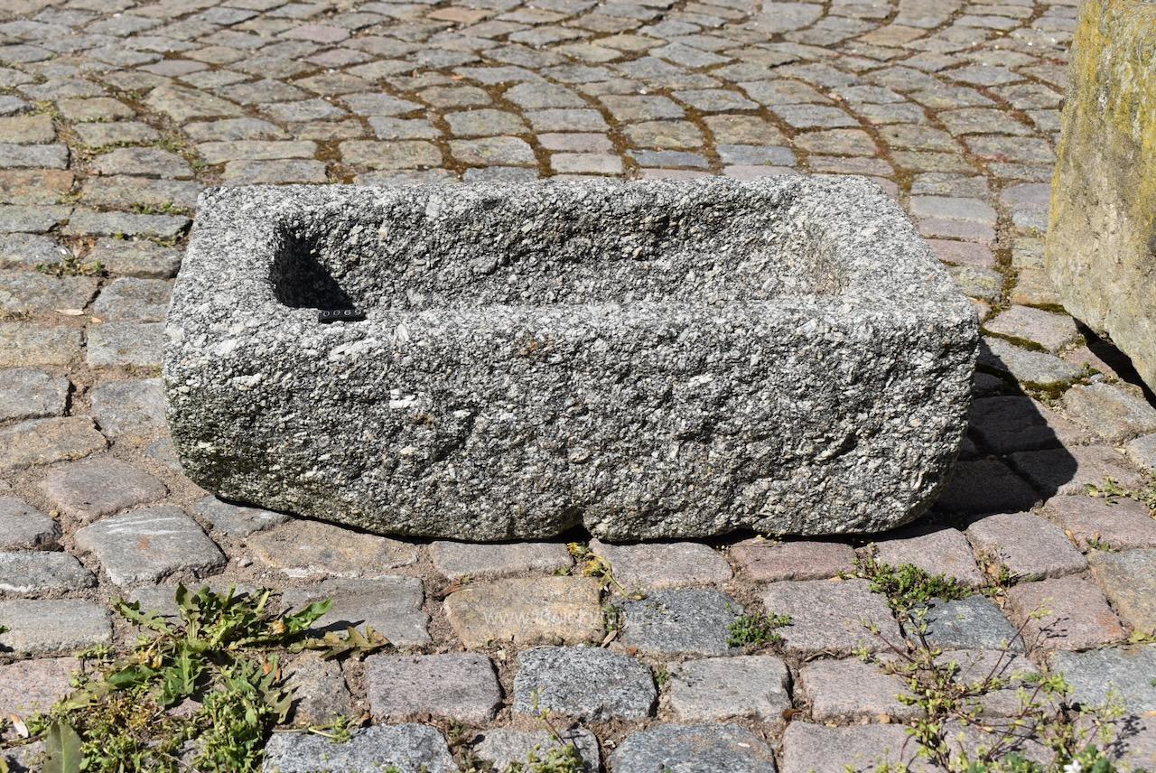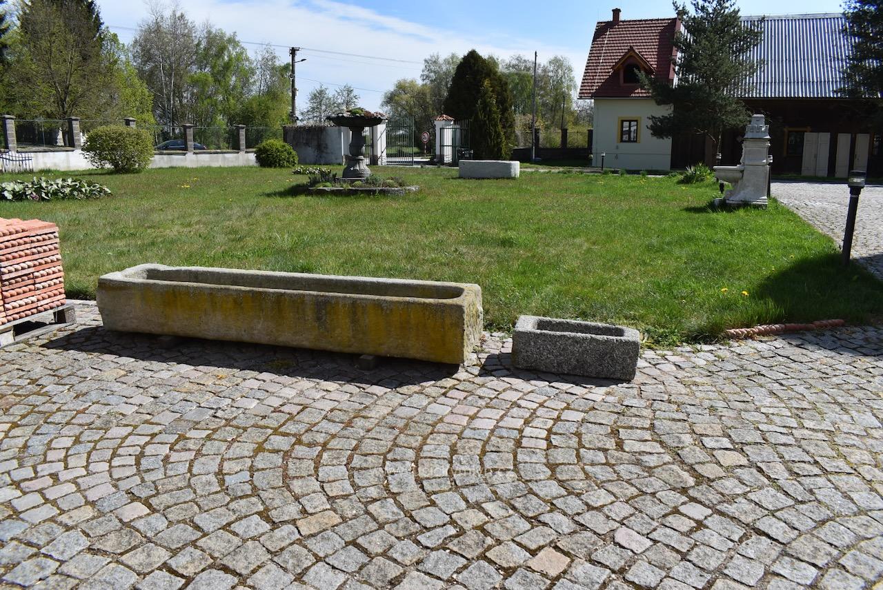 Menší a hezky omšelé starožitné sekané koryto ze světlé masivní žuly o délce 63 cm a váze 90 kg – bez problémů a bezpečně můžeme zaslat zabalené na paletě až k Vám domů