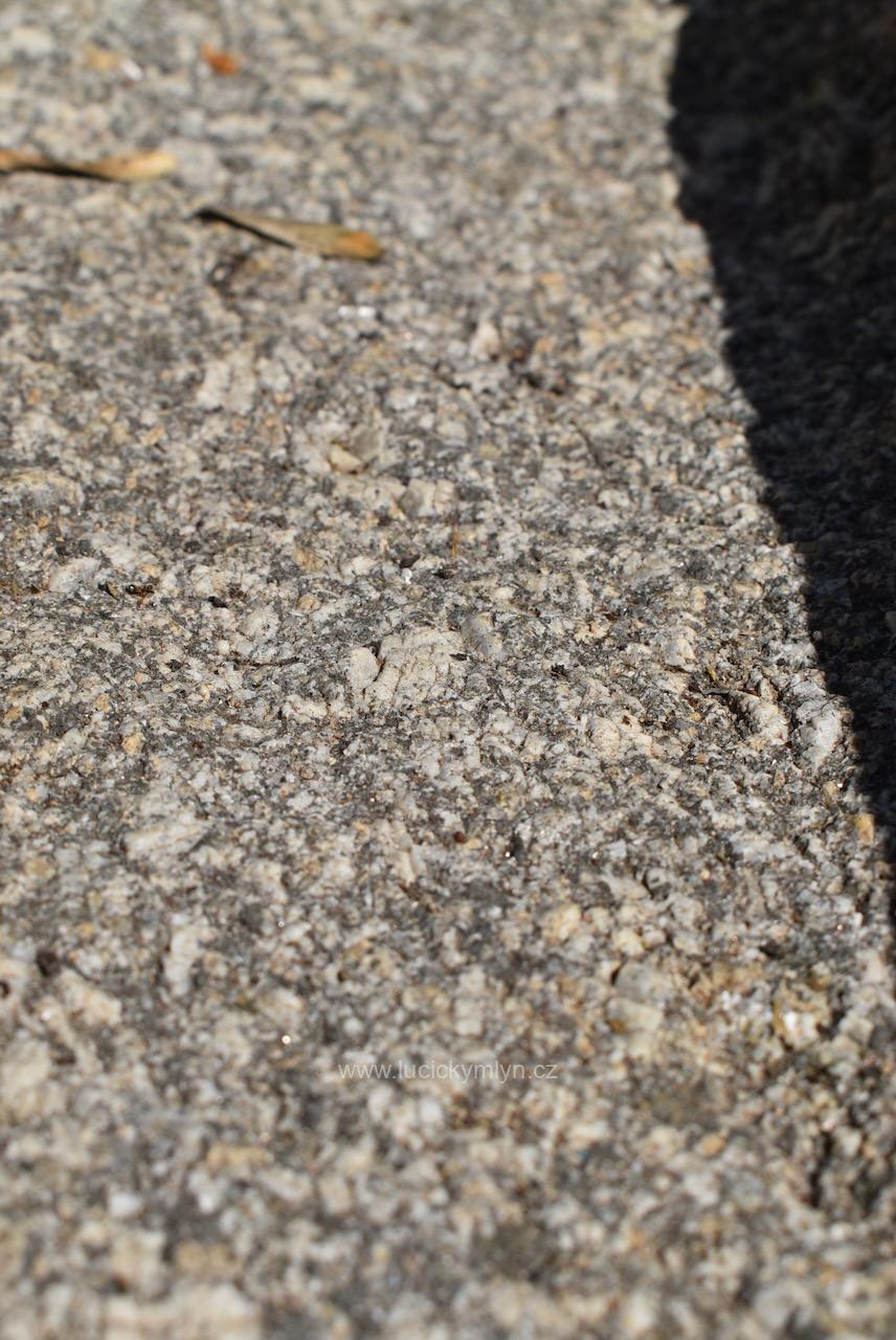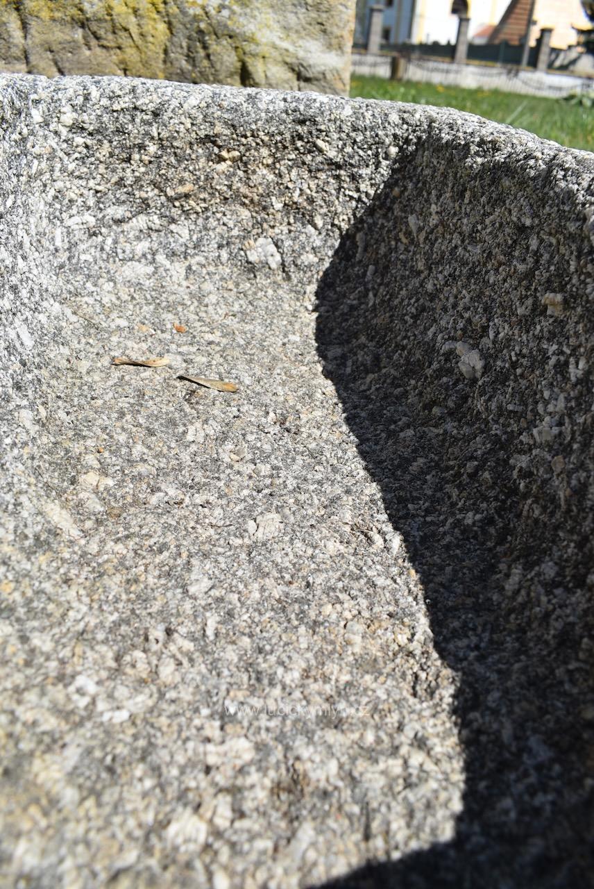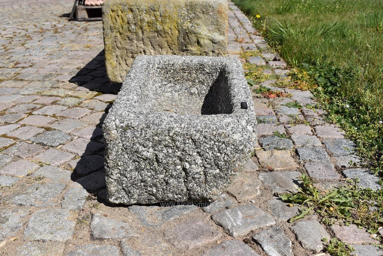 Menší a hezky omšelé starožitné sekané koryto ze světlé masivní žuly o délce 63 cm a váze 90 kg – bez problémů a bezpečně můžeme zaslat zabalené na paletě až k Vám domů