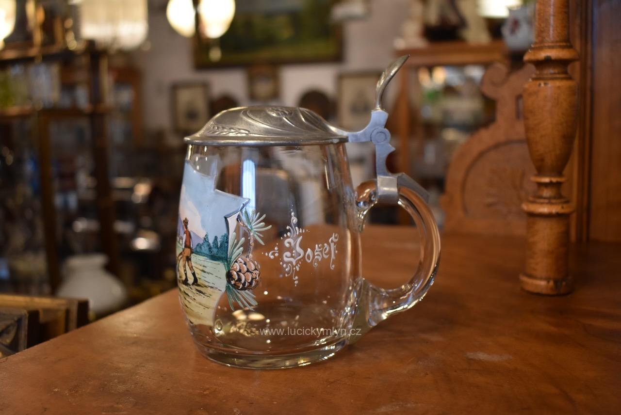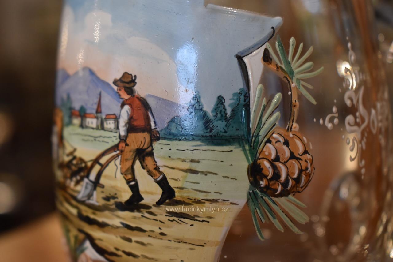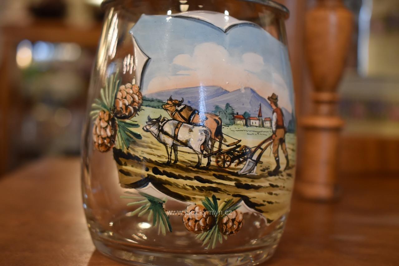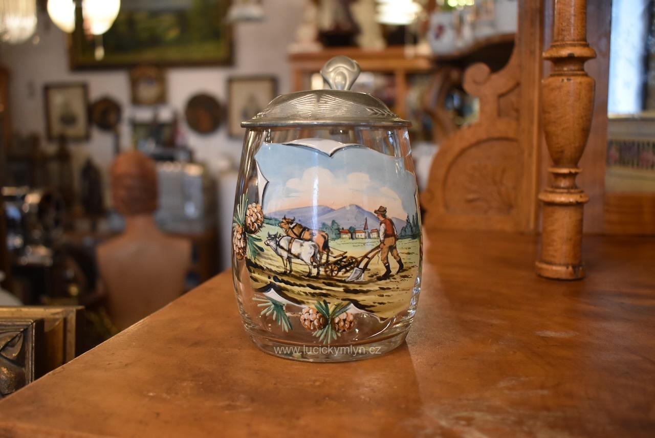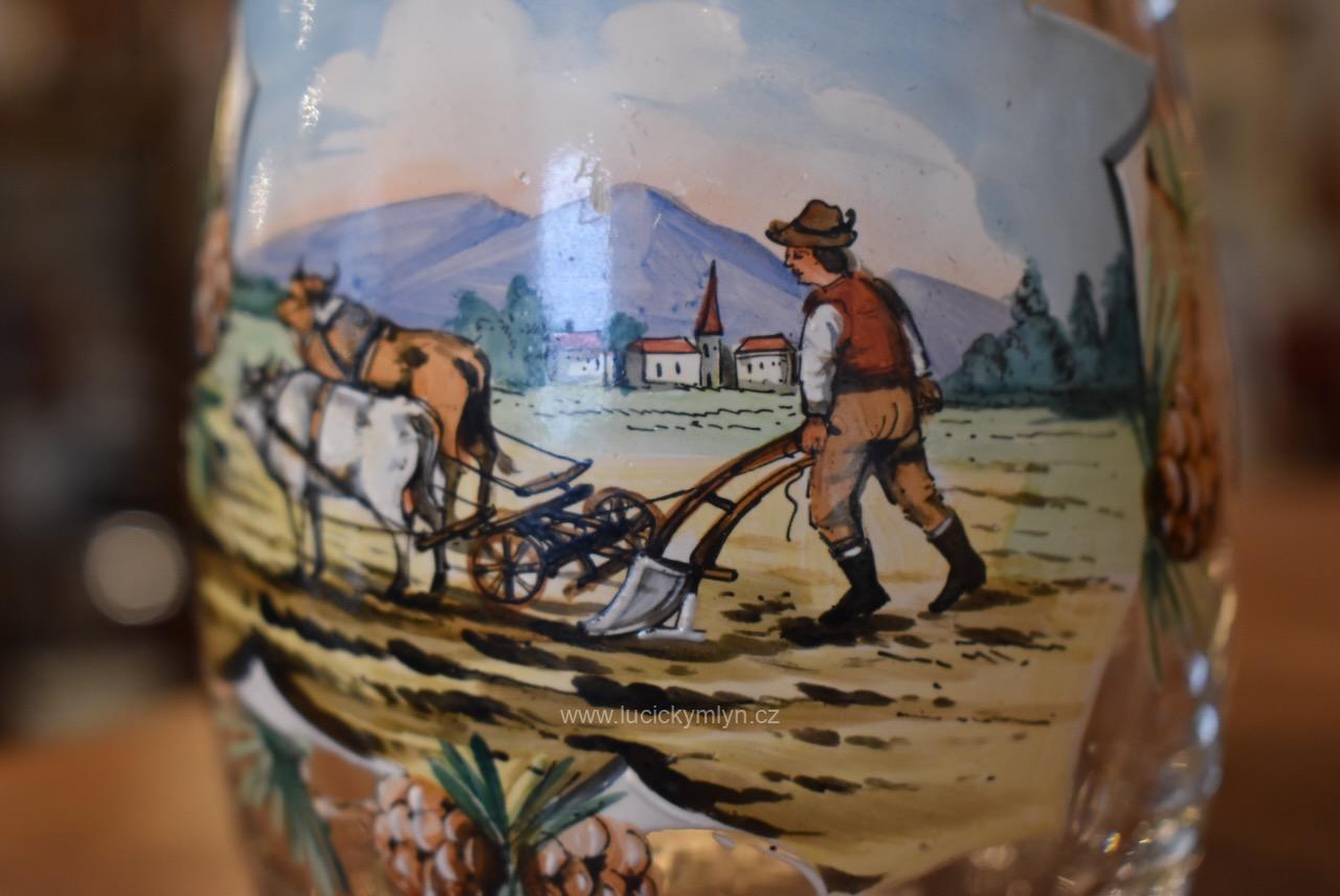 Více jak stoletý půllitr z čirého skla má objem 0,5 l a klasický soudkový tvar s masivním uchem a cínovou montáží víčka. Tuto elegantně tvarovanou montáž, nápadně převyšuje palcový překlápěč víčka. Lehce zaoblené kulaté víčko je okrášleno secesně stylizovaným plastickým motivem obilných klasů, chmelových šištic a listů. Čelní stranu skleněné nádoby zdobí ručně malovaná žánrová scénka v malebné podhorské krajině, v níž vidíme sedláka orajícího za pomoci pluhu taženého koněm. Obrázek je stylově obohacený větvičkami s borovými šiškami a bílým nápisem „Josef“, takže jde o osobní dárkový korbel. Zcela nepoškozený starožitný předmět pochází z první 1/3 20. stol. Dnes poslouží jako plně funkční pivní sklenice i jako stylová dekorace interiéru či domácího výčepu.