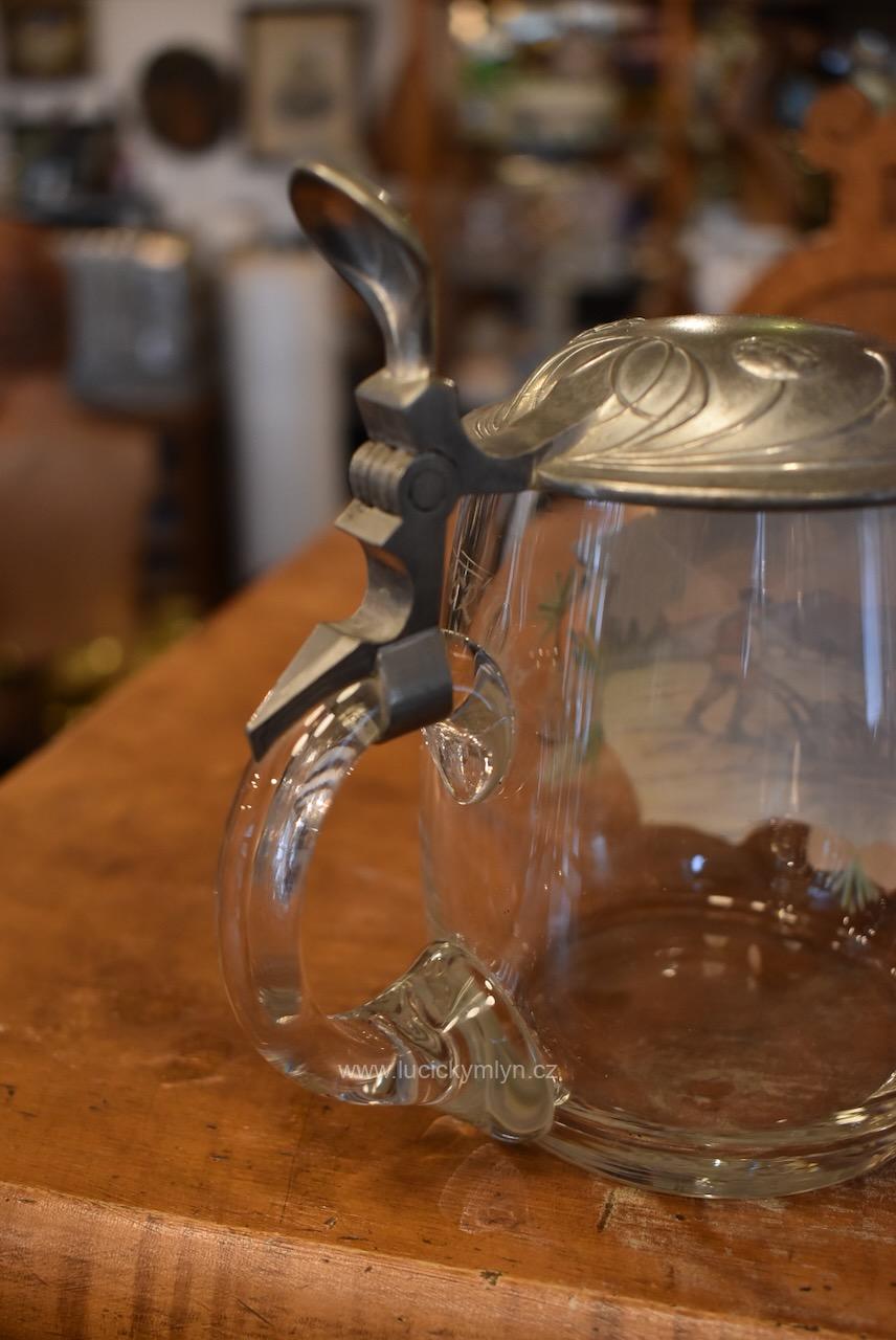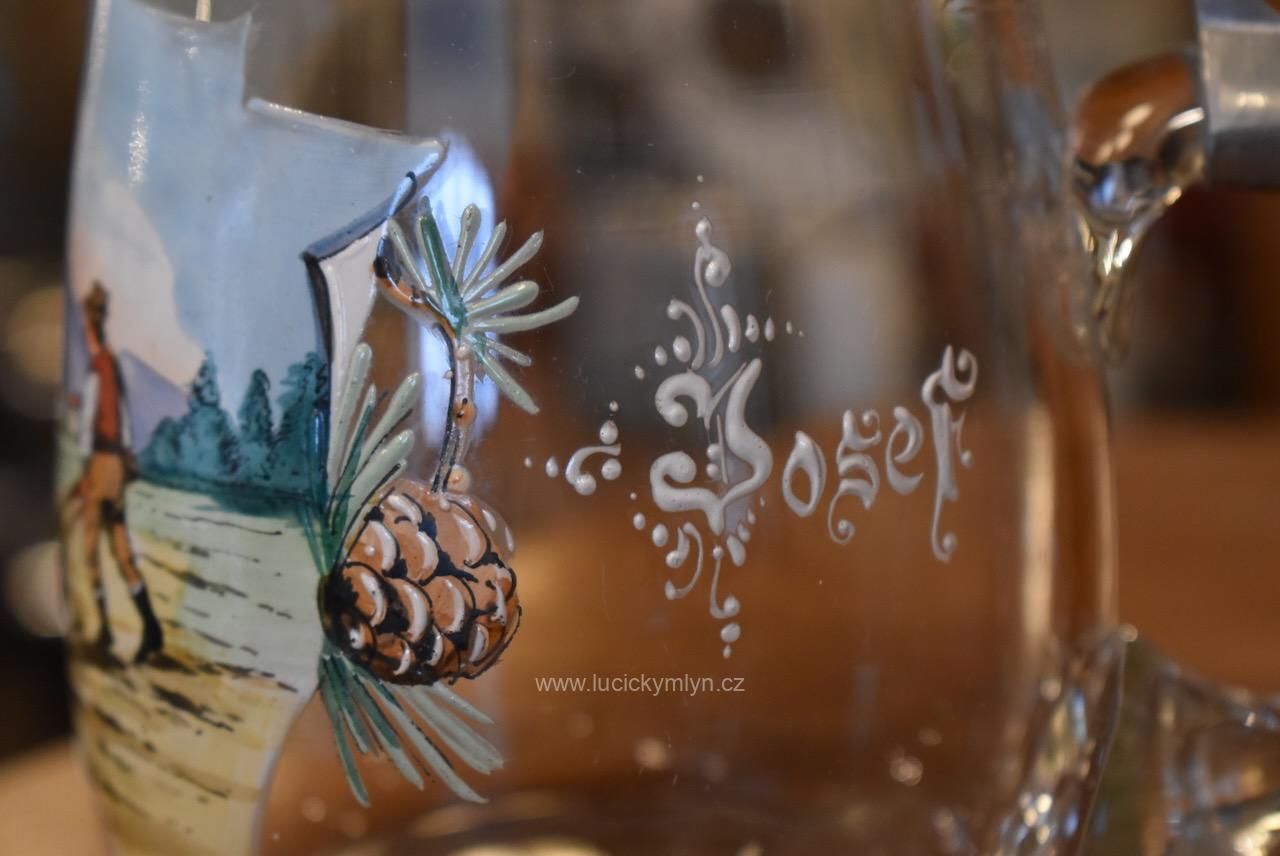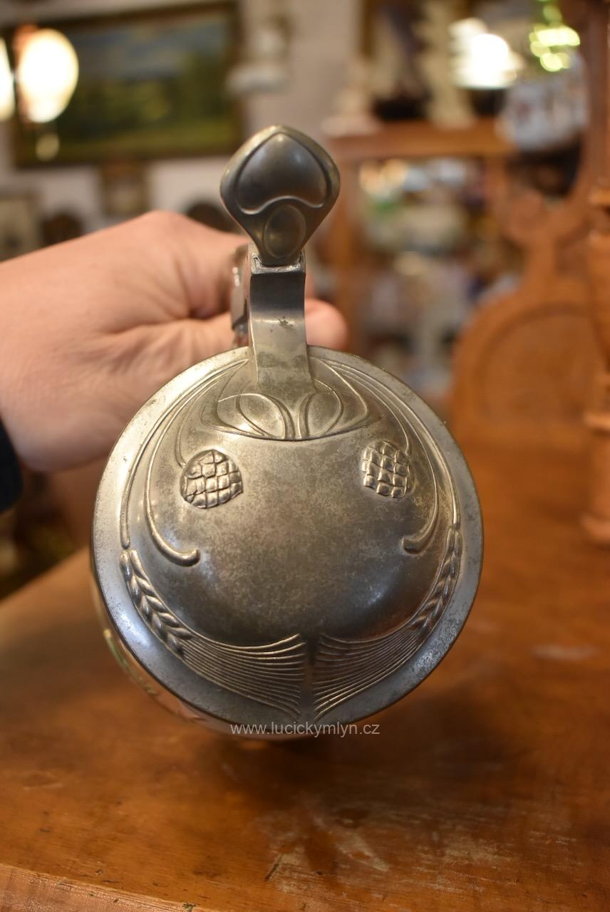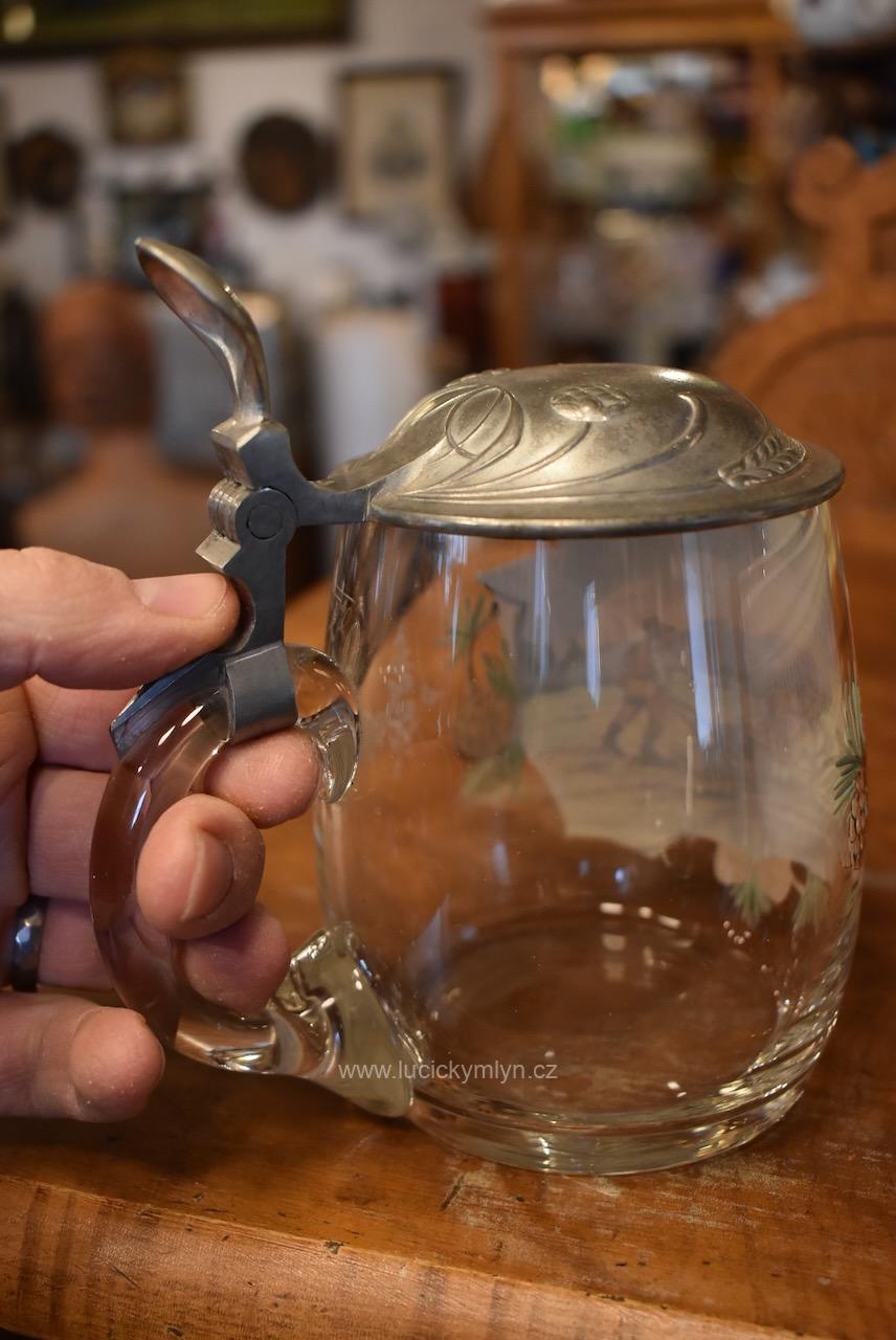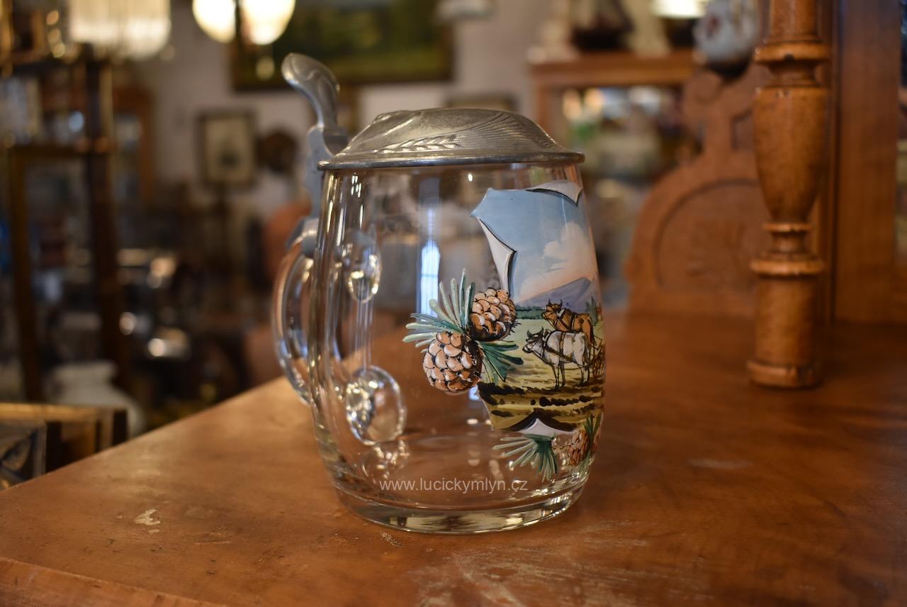 Více jak stoletý půllitr z čirého skla má objem 0,5 l a klasický soudkový tvar s masivním uchem a cínovou montáží víčka. Tuto elegantně tvarovanou montáž, nápadně převyšuje palcový překlápěč víčka. Lehce zaoblené kulaté víčko je okrášleno secesně stylizovaným plastickým motivem obilných klasů, chmelových šištic a listů. Čelní stranu skleněné nádoby zdobí ručně malovaná žánrová scénka v malebné podhorské krajině, v níž vidíme sedláka orajícího za pomoci pluhu taženého koněm. Obrázek je stylově obohacený větvičkami s borovými šiškami a bílým nápisem „Josef“, takže jde o osobní dárkový korbel. Zcela nepoškozený starožitný předmět pochází z první 1/3 20. stol. Dnes poslouží jako plně funkční pivní sklenice i jako stylová dekorace interiéru či domácího výčepu.