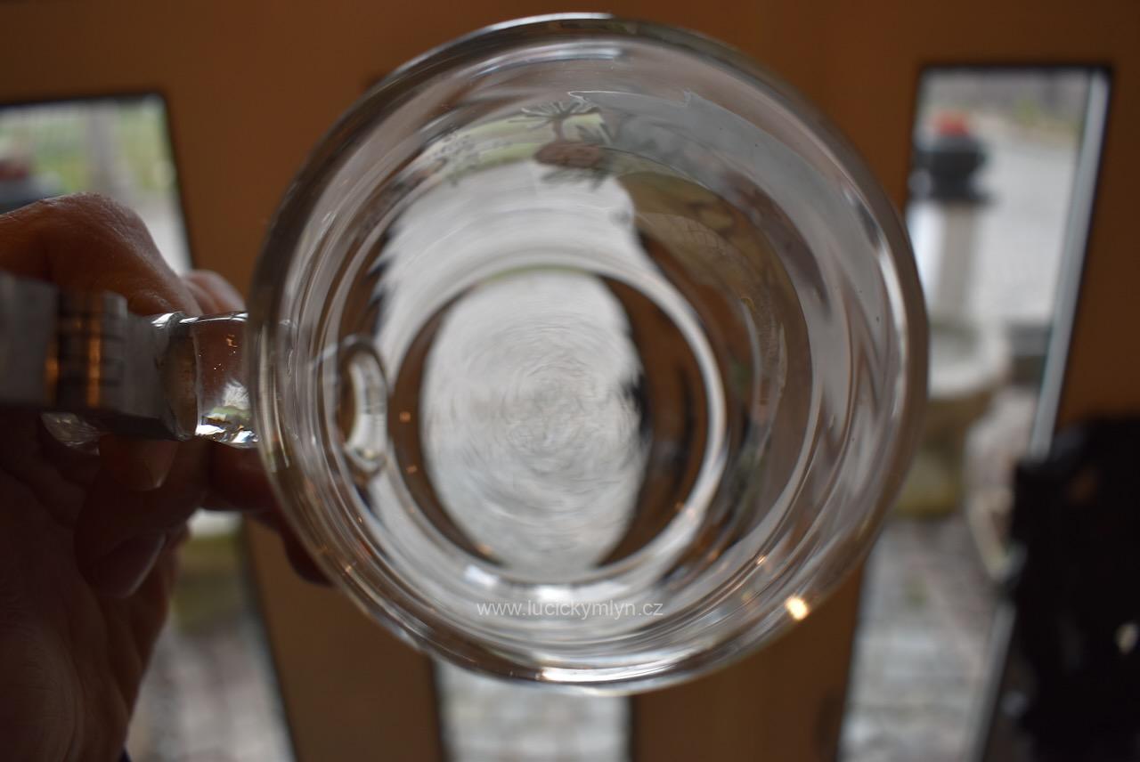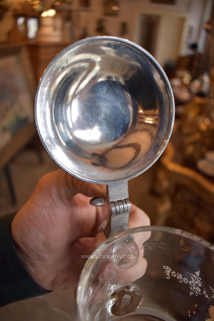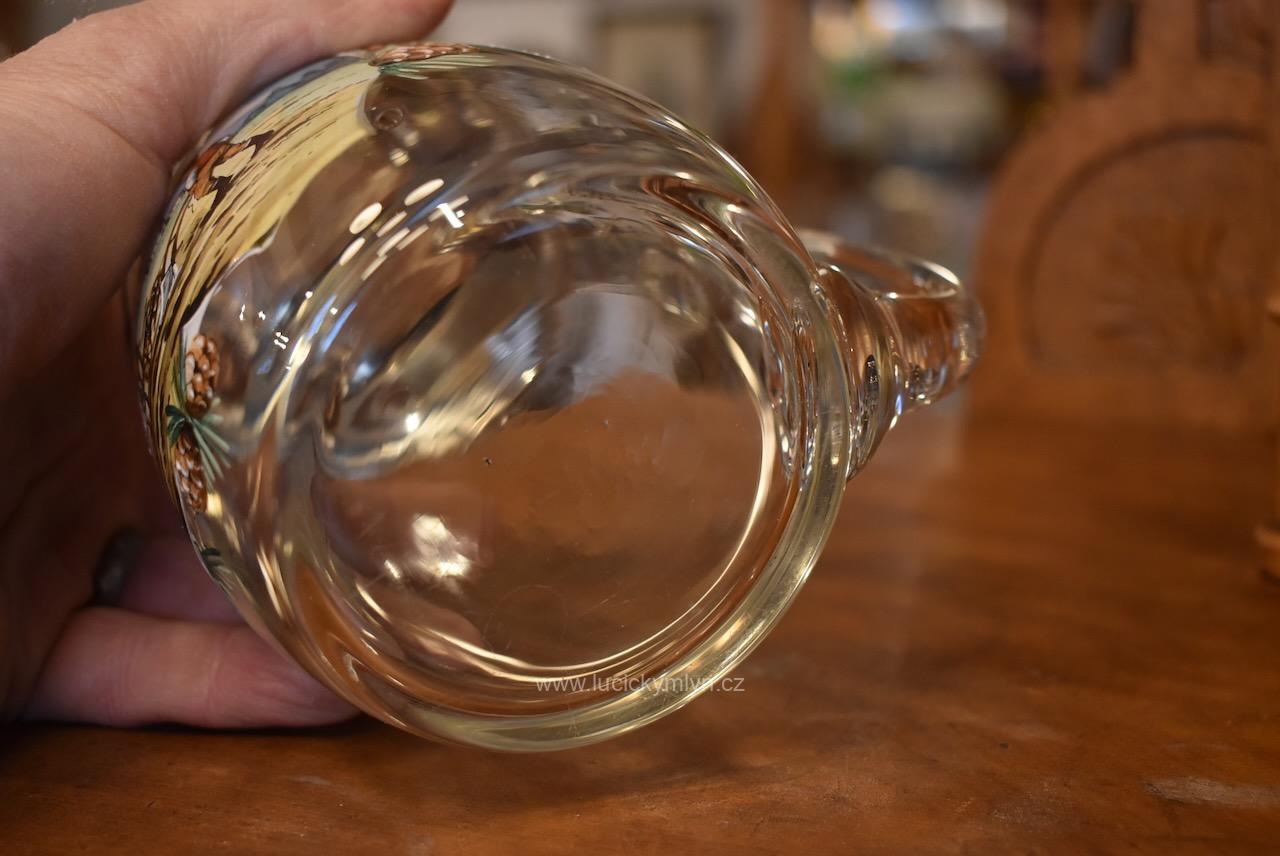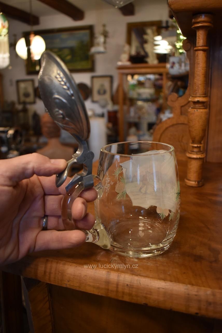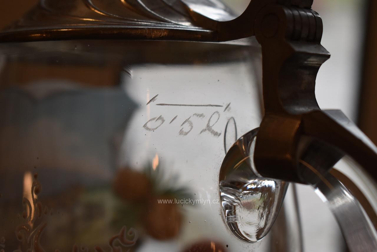 Více jak stoletý půllitr z čirého skla má objem 0,5 l a klasický soudkový tvar s masivním uchem a cínovou montáží víčka. Tuto elegantně tvarovanou montáž, nápadně převyšuje palcový překlápěč víčka. Lehce zaoblené kulaté víčko je okrášleno secesně stylizovaným plastickým motivem obilných klasů, chmelových šištic a listů. Čelní stranu skleněné nádoby zdobí ručně malovaná žánrová scénka v malebné podhorské krajině, v níž vidíme sedláka orajícího za pomoci pluhu taženého koněm. Obrázek je stylově obohacený větvičkami s borovými šiškami a bílým nápisem „Josef“, takže jde o osobní dárkový korbel. Zcela nepoškozený starožitný předmět pochází z první 1/3 20. stol. Dnes poslouží jako plně funkční pivní sklenice i jako stylová dekorace interiéru či domácího výčepu.