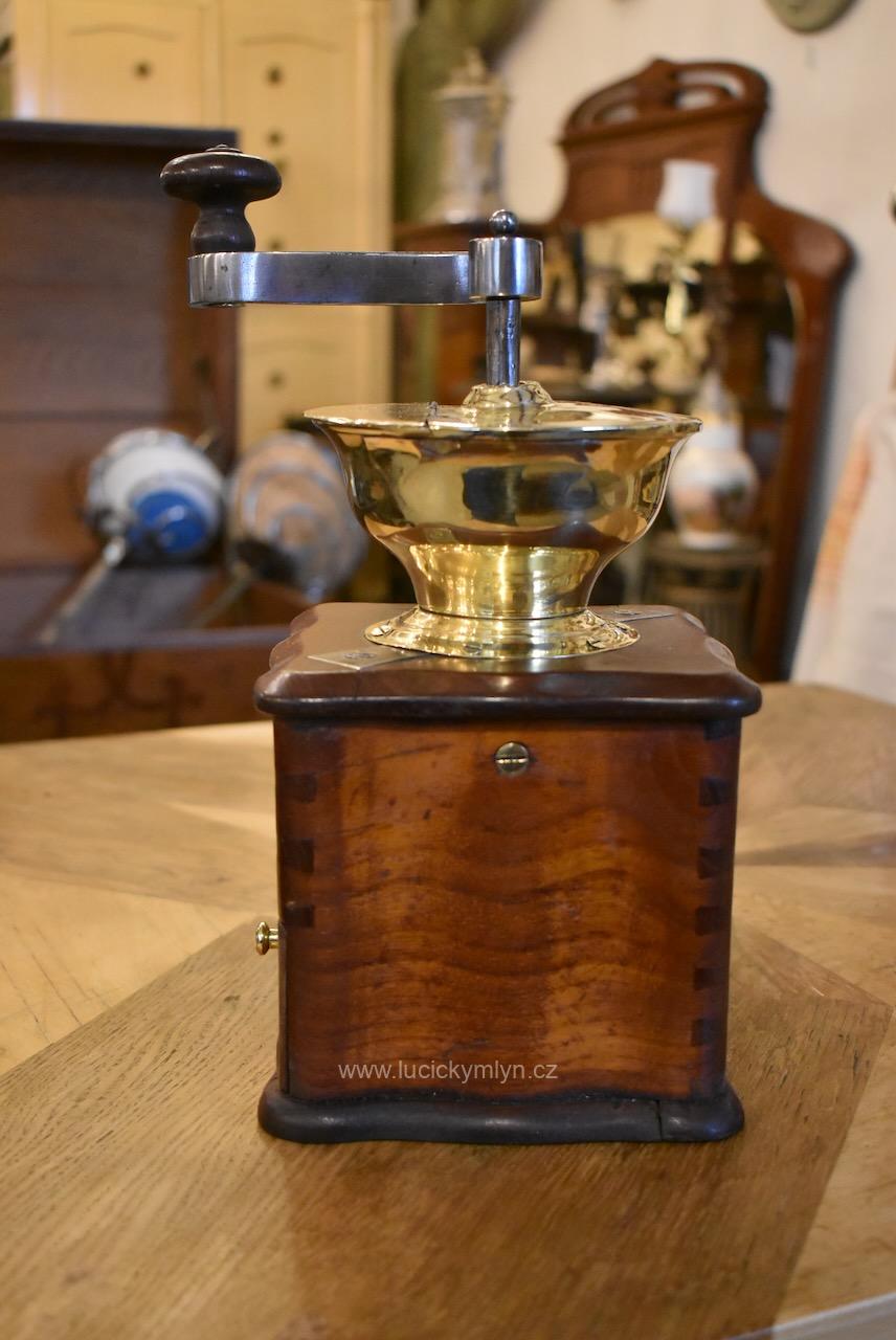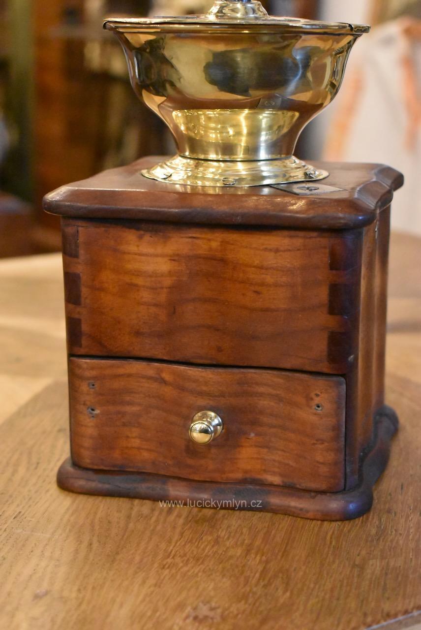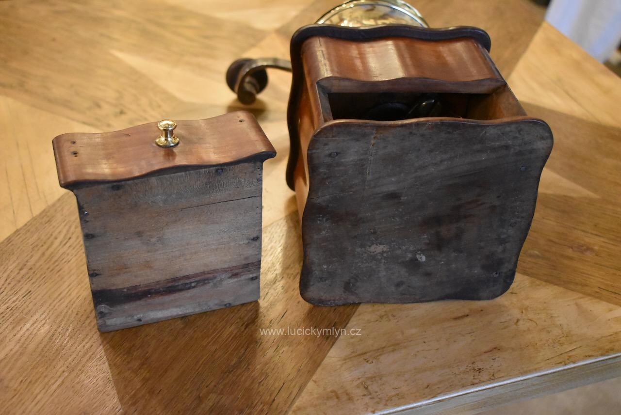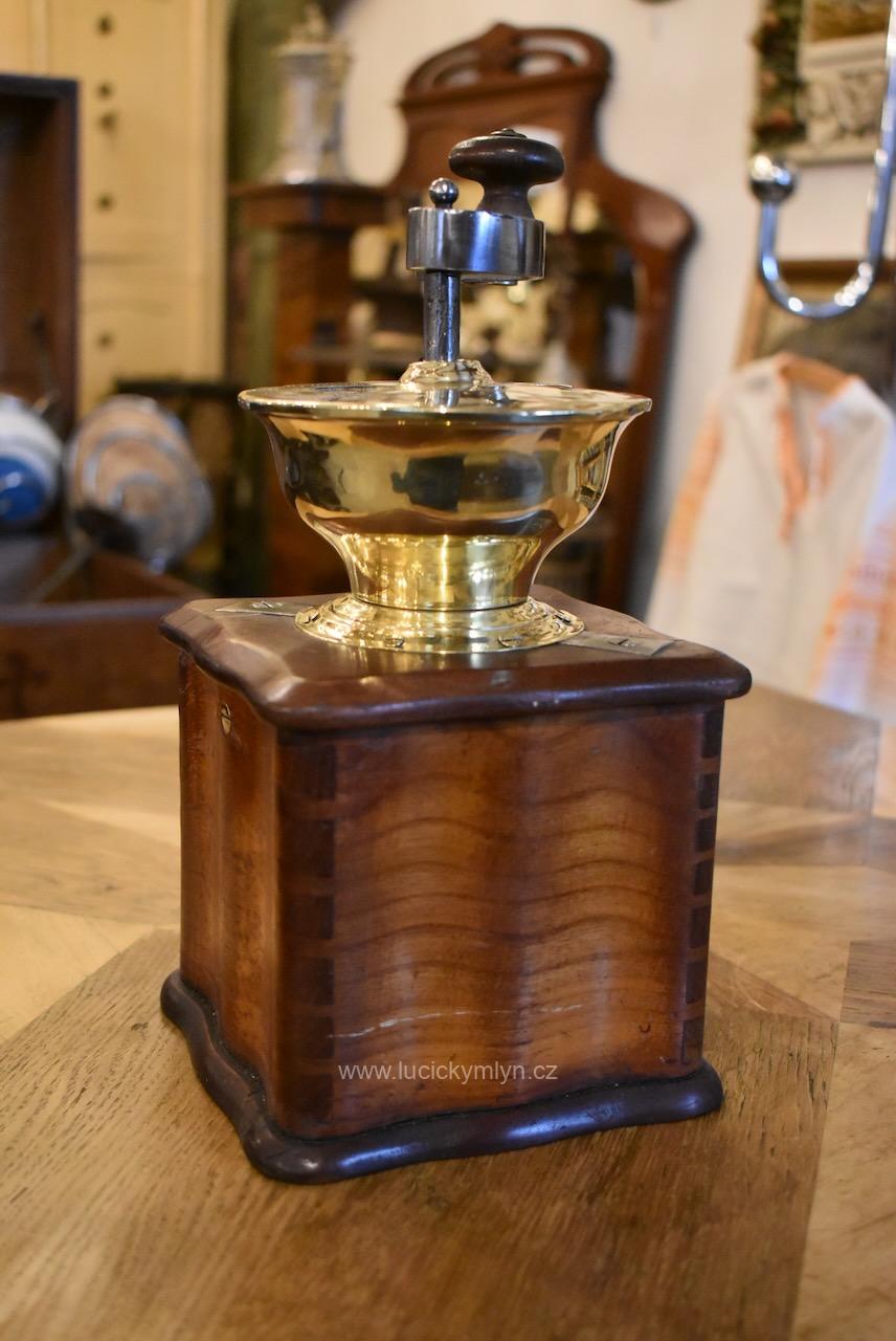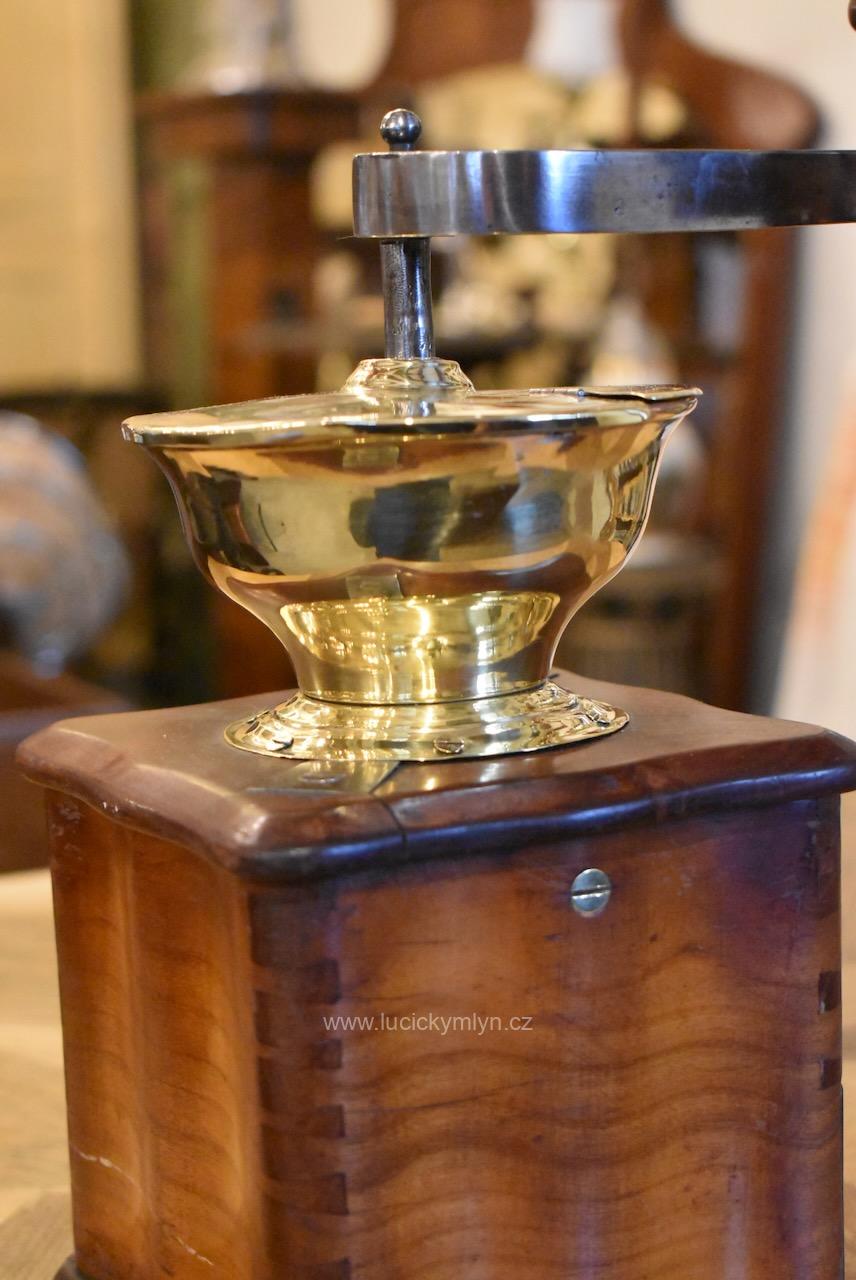 Měšťanský mlýnek se schránkou truhlářsky provedenou ve stylu vrcholného biedermeieru, pochází z období okolo roku 1840. Tento zachovalý a dodnes funkční mlýnek už mnohé pamatuje. Jeho ocelový strojek má precizně cinkovanou schránku (tzv. sdružený otevřený ozub) z nazlátlého masivního dřeva. Pohárově tvarovaná násypka z tlačené leštěné mosazi má starší způsob plnícího otvoru, chráněný vzhůru odklápěcím víčkem. Nevšední esovitě tvarovaná klička, vytváří dojem ohýbané pásoviny, ale byla zhotovena z litého železa. Růžově nazlátlé dřevo kvádrové schránky, tvarově oživuje vrchní i spodní, lehce vykrajovaný dílec s hezky zaoblenými okrajovými přesahy. Na čelní straně dole je zabudovaný šuplík s menší soustruženou knopkou z leštěné mosazi. Klička je zakončena hezky soustruženou úchytkou z masivního dřeva. Starožitný mlýnek i s plně funkčním mlecím mechanismem jsou po celkovém vyčištění a renovaci. Hezká sběratelská či kavárenská dekorace je zcela autentickým předmětem z bohatšího měšťanského prostředí.