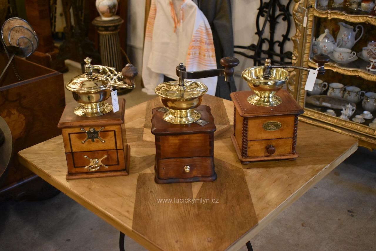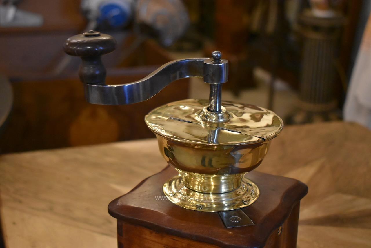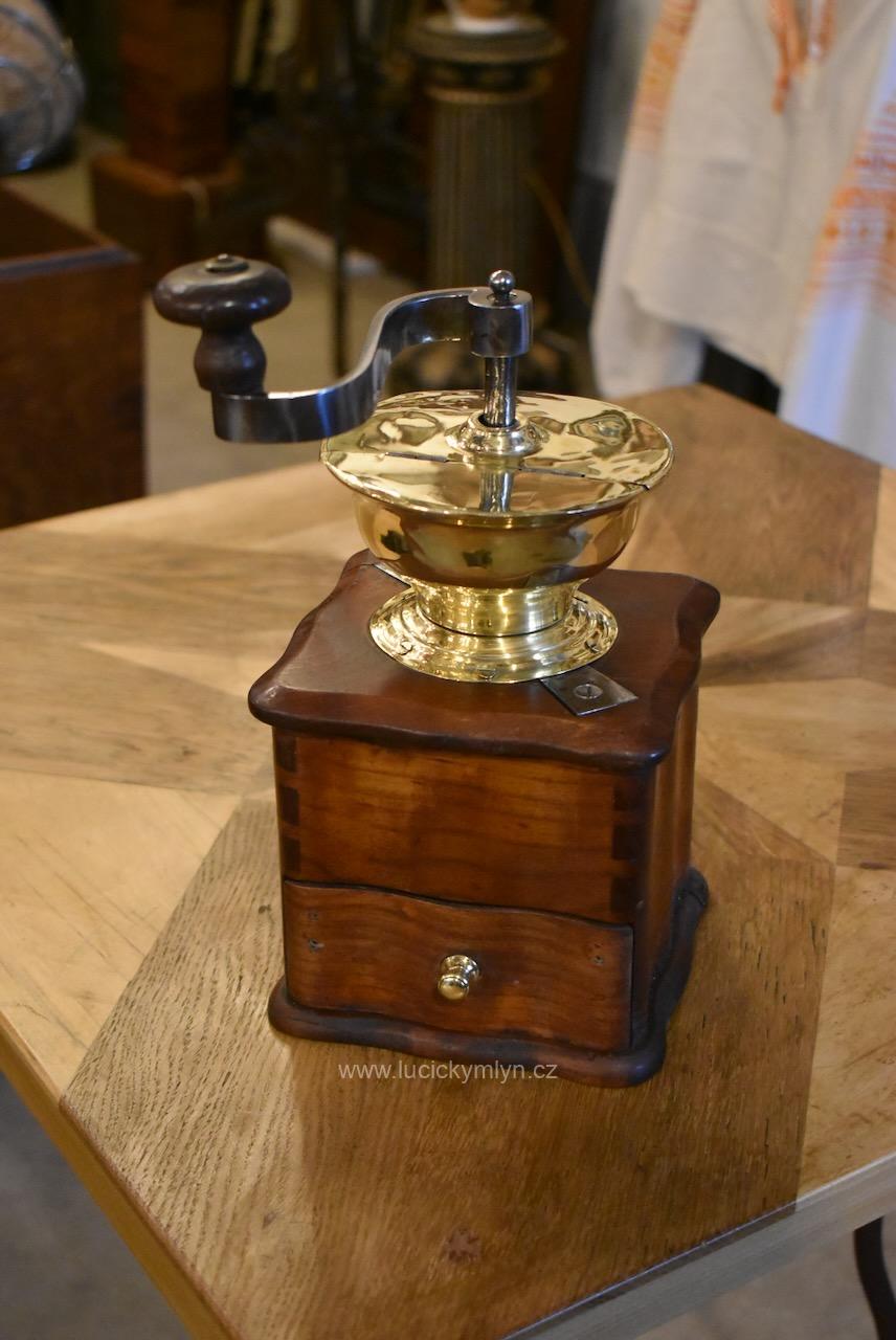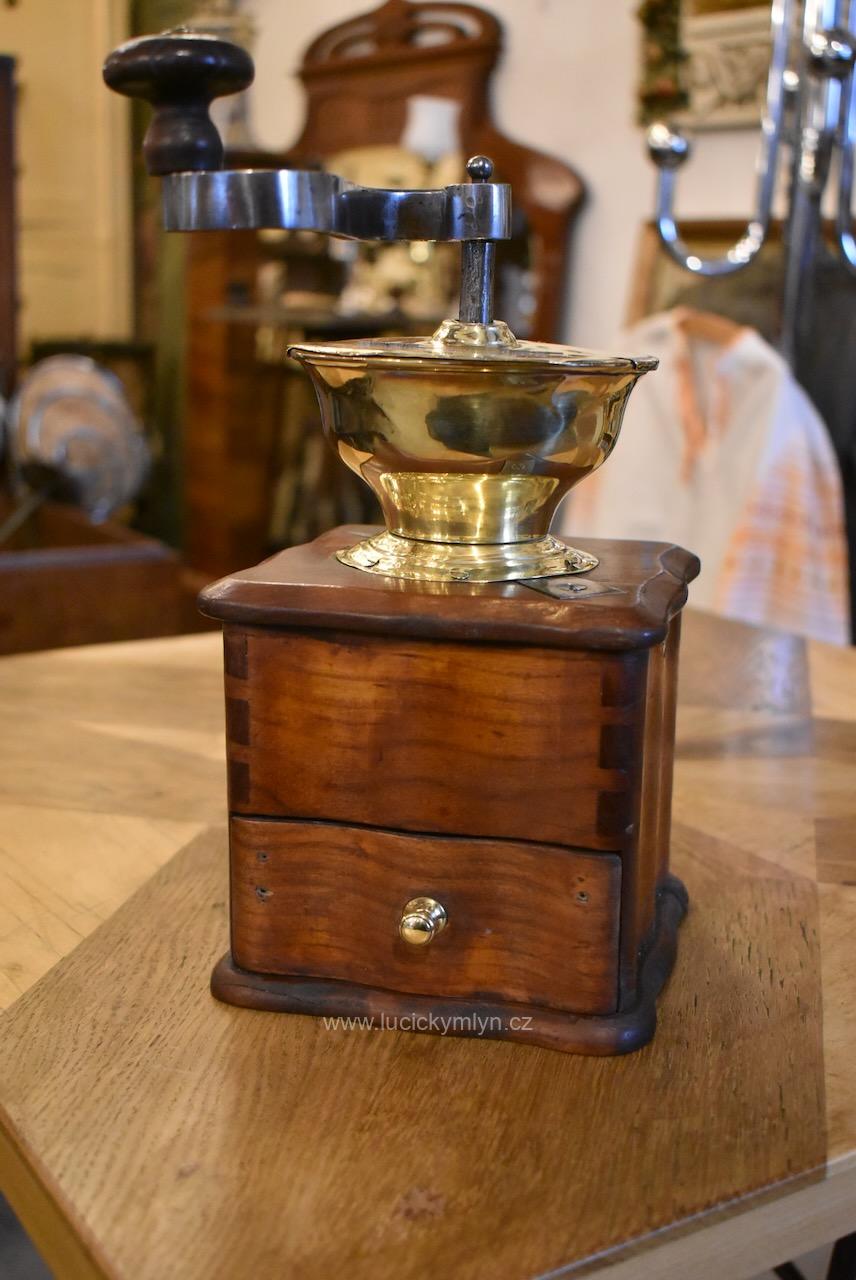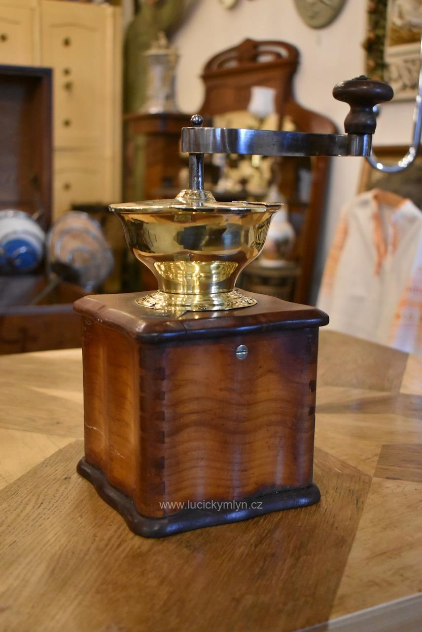 Měšťanský mlýnek se schránkou truhlářsky provedenou ve stylu vrcholného biedermeieru, pochází z období okolo roku 1840. Tento zachovalý a dodnes funkční mlýnek už mnohé pamatuje. Jeho ocelový strojek má precizně cinkovanou schránku (tzv. sdružený otevřený ozub) z nazlátlého masivního dřeva. Pohárově tvarovaná násypka z tlačené leštěné mosazi má starší způsob plnícího otvoru, chráněný vzhůru odklápěcím víčkem. Nevšední esovitě tvarovaná klička, vytváří dojem ohýbané pásoviny, ale byla zhotovena z litého železa. Růžově nazlátlé dřevo kvádrové schránky, tvarově oživuje vrchní i spodní, lehce vykrajovaný dílec s hezky zaoblenými okrajovými přesahy. Na čelní straně dole je zabudovaný šuplík s menší soustruženou knopkou z leštěné mosazi. Klička je zakončena hezky soustruženou úchytkou z masivního dřeva. Starožitný mlýnek i s plně funkčním mlecím mechanismem jsou po celkovém vyčištění a renovaci. Hezká sběratelská či kavárenská dekorace je zcela autentickým předmětem z bohatšího měšťanského prostředí.