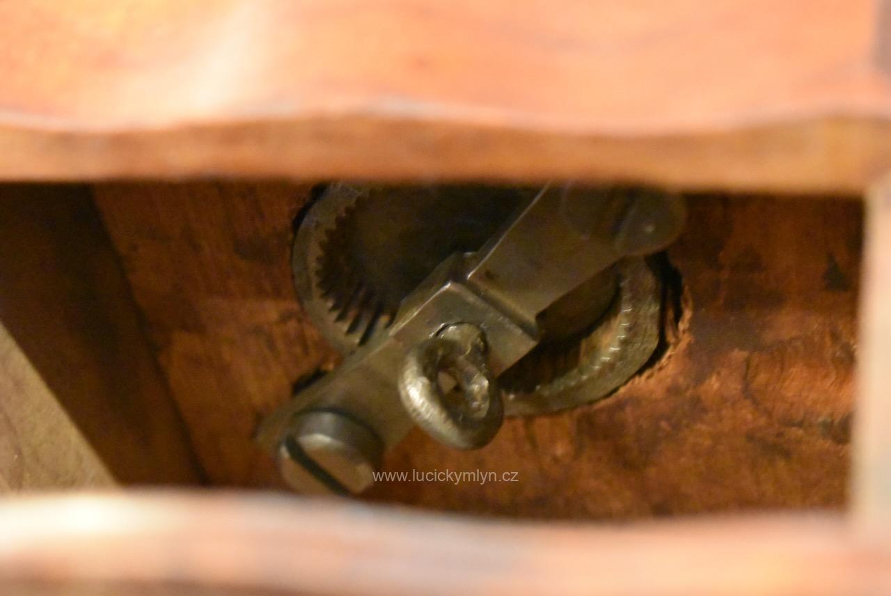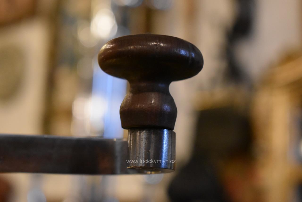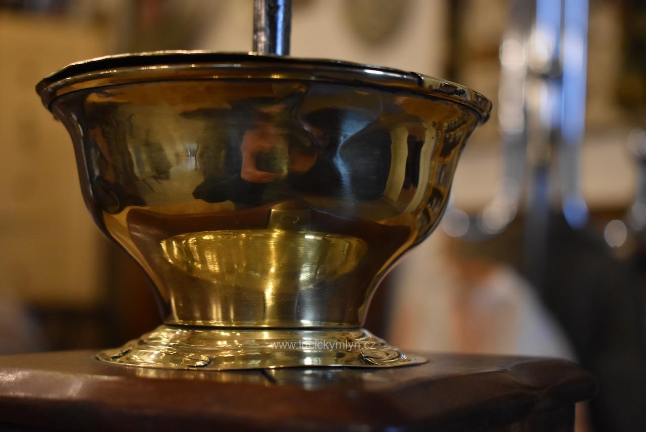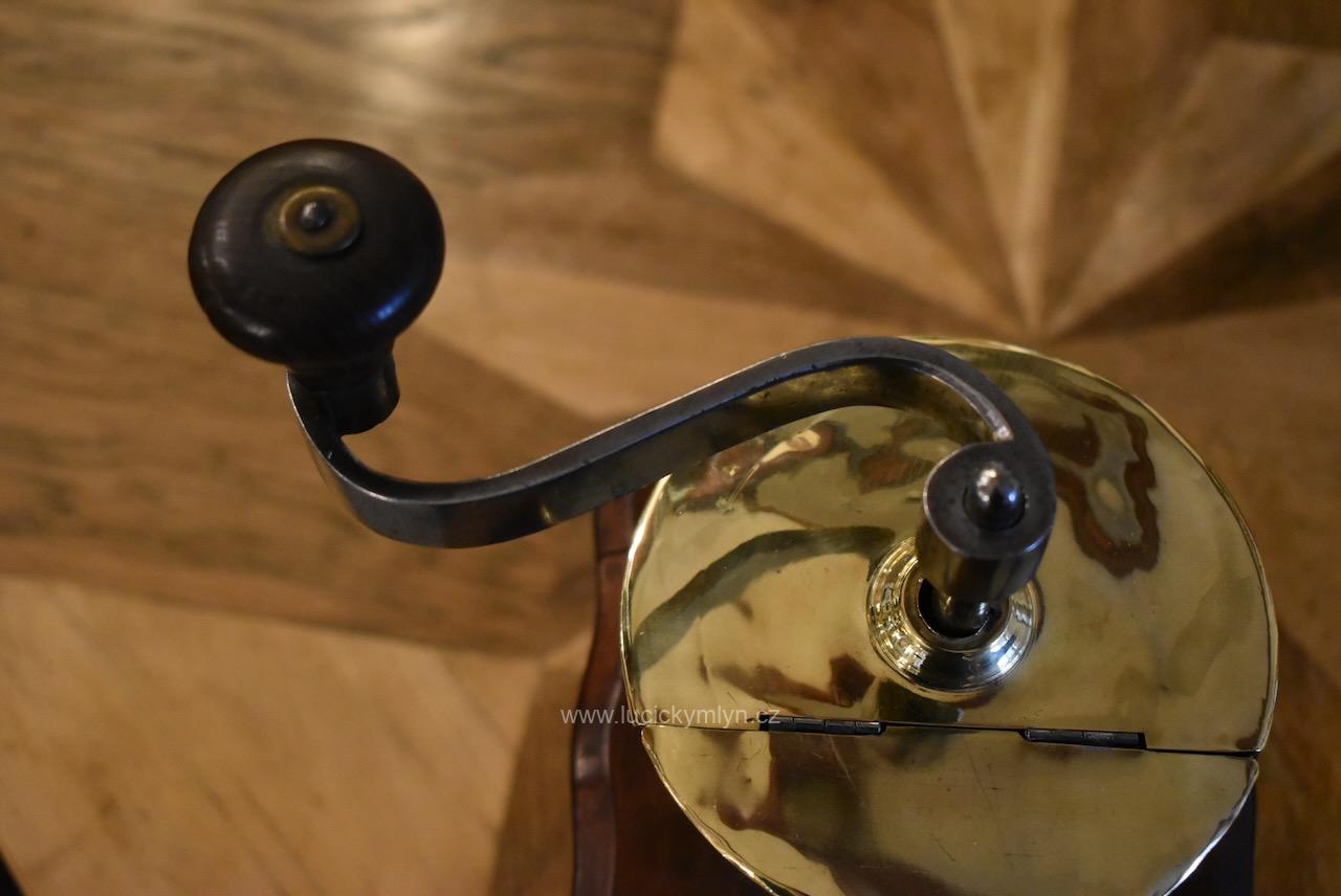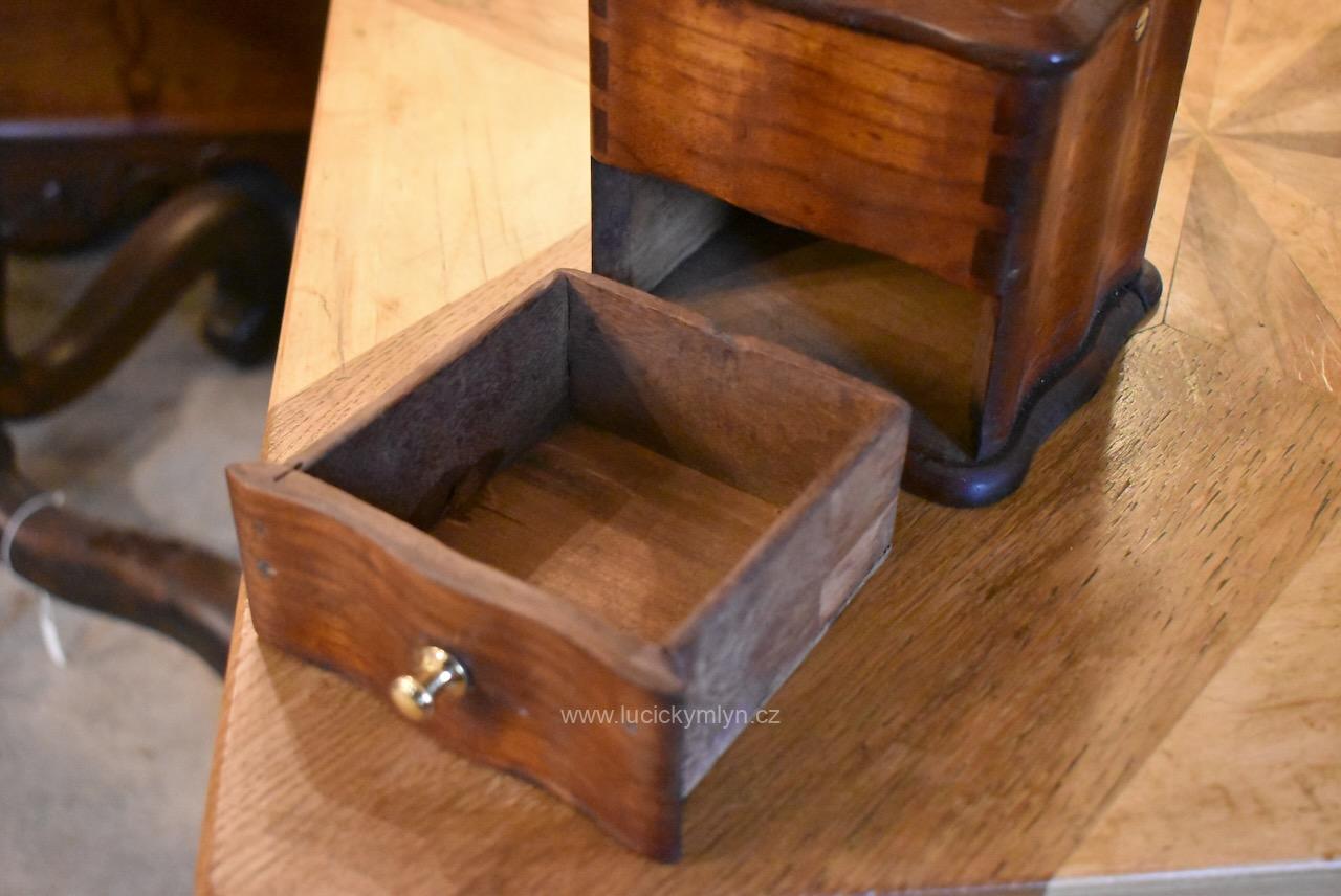 Měšťanský mlýnek se schránkou truhlářsky provedenou ve stylu vrcholného biedermeieru, pochází z období okolo roku 1840. Tento zachovalý a dodnes funkční mlýnek už mnohé pamatuje. Jeho ocelový strojek má precizně cinkovanou schránku (tzv. sdružený otevřený ozub) z nazlátlého masivního dřeva. Pohárově tvarovaná násypka z tlačené leštěné mosazi má starší způsob plnícího otvoru, chráněný vzhůru odklápěcím víčkem. Nevšední esovitě tvarovaná klička, vytváří dojem ohýbané pásoviny, ale byla zhotovena z litého železa. Růžově nazlátlé dřevo kvádrové schránky, tvarově oživuje vrchní i spodní, lehce vykrajovaný dílec s hezky zaoblenými okrajovými přesahy. Na čelní straně dole je zabudovaný šuplík s menší soustruženou knopkou z leštěné mosazi. Klička je zakončena hezky soustruženou úchytkou z masivního dřeva. Starožitný mlýnek i s plně funkčním mlecím mechanismem jsou po celkovém vyčištění a renovaci. Hezká sběratelská či kavárenská dekorace je zcela autentickým předmětem z bohatšího měšťanského prostředí.