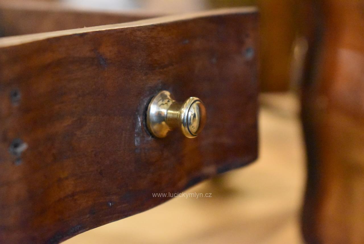 Hezký starožitný rokokově prohýbaný kávomlýnek se schránkou z ovocného dřeva a leštěnými mosaznými dílci