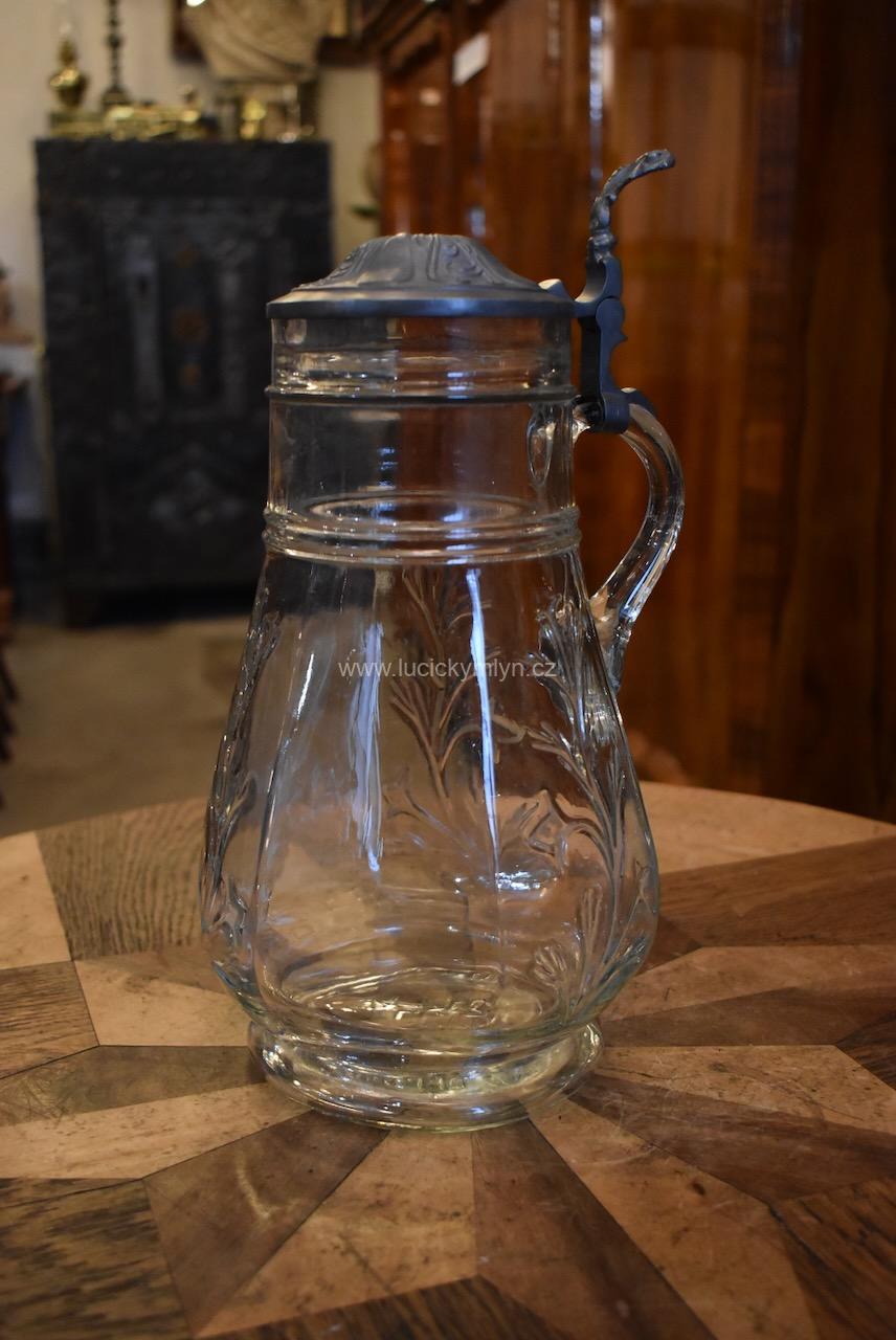 Vysoká buclatá nádoba se širší podstavou, pochází z období první republiky. Džbán z čirého skla odráží pravidelně členité svislé odlesky, způsobené vnitřním členěním ploch. Tyto svisle vedené hranové odlesky jsou střídavě doplněny secesně pojatým a jemně zapuštěným florálním motivem. Krásný džbán na pivo či víno má menší, ale pohodlně tvarované ucho, které bylo sklářsky natavené. Nádoba byla tzv. vyfouknuta do vícedílné dřevěné formy s řezaným povrchem. Hladké kruhové hrdlo, zdobí staletími osvědčený typ cínové montáže s víčkem, též pojatý v romantickém, secesním stylu. Starožitný silnostěnný, foukaný, džbán na 2,5 L se zachoval ve velmi dobrém stavu, zcela bez poškození.