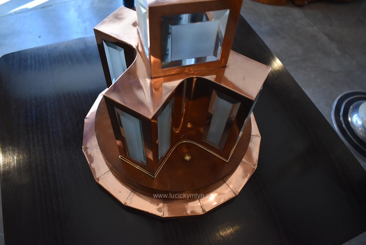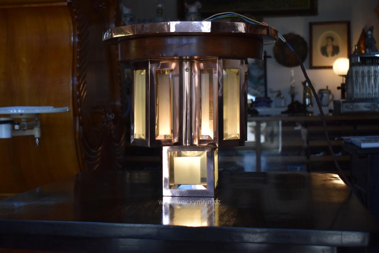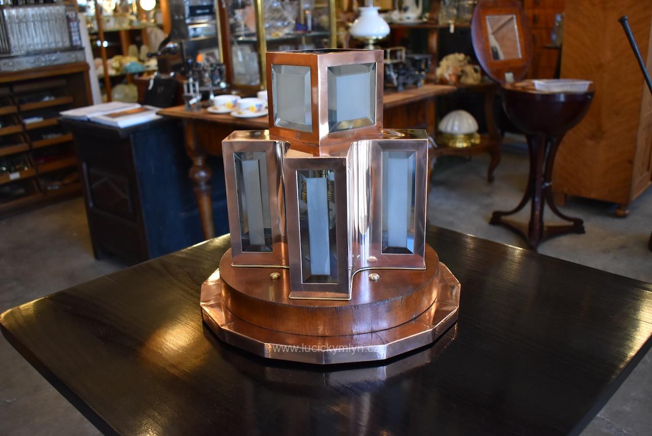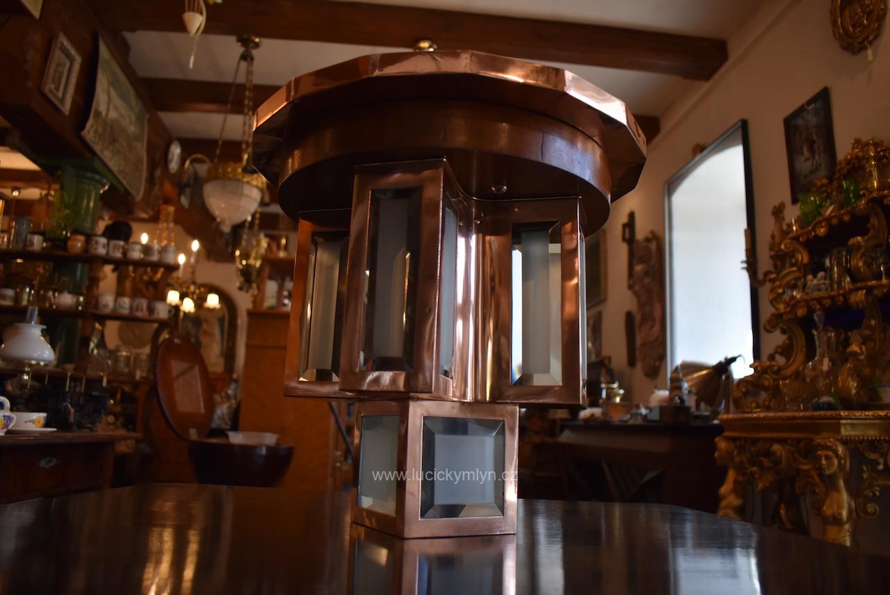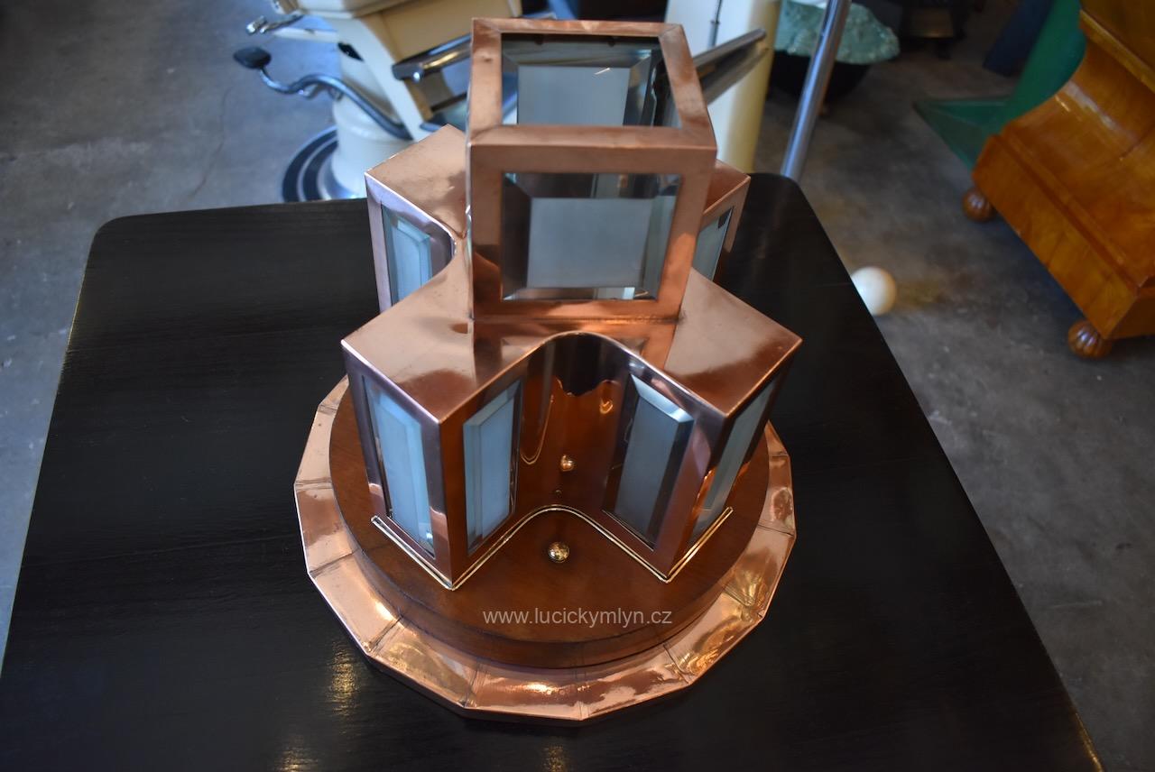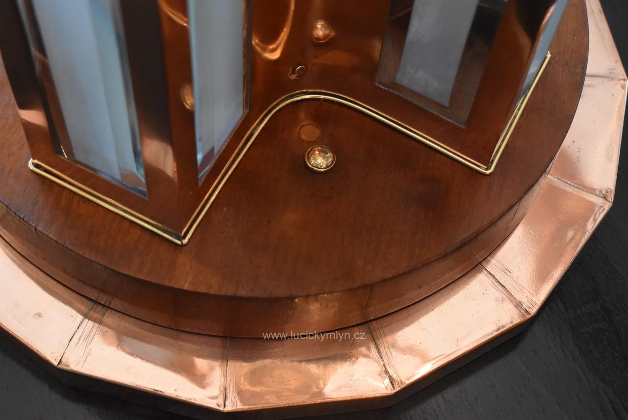Reprezentativní stropní svítidlo s výrazně geometricky pojatou kompozicí je sestaveno z více odstupňovaných základových kruhových a mnohoúhelníkových desek, které tvoří pevnou dřevěnou základnu s opláštěným leštěným měděným plechem. Z této podstavy vyrůstá čtveřice vyšších měděných „pilířů“ se vsazenými podlouhlými skly a nad nimi nápaditě vystupuje čtvercová kubusová nástavba, opět se skleněnými výplněmi – celek tak připomíná světelnou architekturu ve stylu modernismu a art‑deca. Prosklené hranoly fungují jako subtilní stínidla a zároveň rozptylují i lámou světlo, takže salonní lustr vytváří působivou atmosféru jak při přímém svitu, tak i v odrazech na měděném povrchu. Svítidlo pochází z 1. poloviny 20. století a je zhotoveno v duchu dobového geometrického a funkcionalistického designu, s důrazem na čisté linie, precizní klempířské zpracování a kombinaci teplého kovu s čirým, okrajově broušeným sklem. Muzejní lustr je po odborném vyčištění, včetně zrenovovaného povrchu z leštěné mědi. Elektroinstalace byla nově provedena a užívá jedné repasované objímky se závitem na běžný typ žárovky. Větší a zcela ojedinělé modernistické stropní světlo z bohatšího měšťanského prostředí, vynikne zejména ve vstupní hale, nad schodištěm, nebo v reprezentativním obývacím pokoji s prvky art‑deca či modernismu. Světlo se dá zavěsit za dílec z ohýbané pásoviny, nebo spíše přišroubovat čtyřmi skrytými vruty přímo ke stropu. K zaslepení otvorů slouží dobové mosazné krytky s krátkými dřevěnými kolíčky, jež se lehce zasadí a případně opatrně vyjímají za pomoci ostří nože ve střední části nikoli za pomoci špičky.