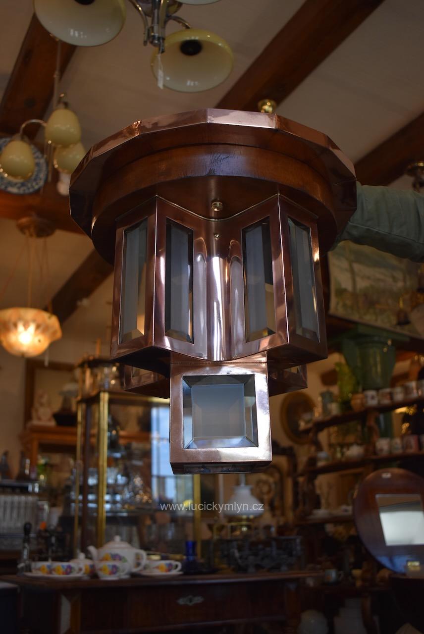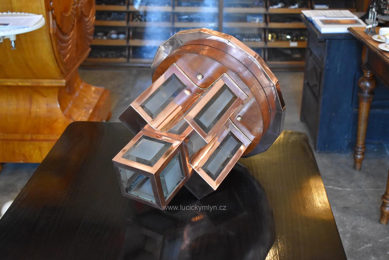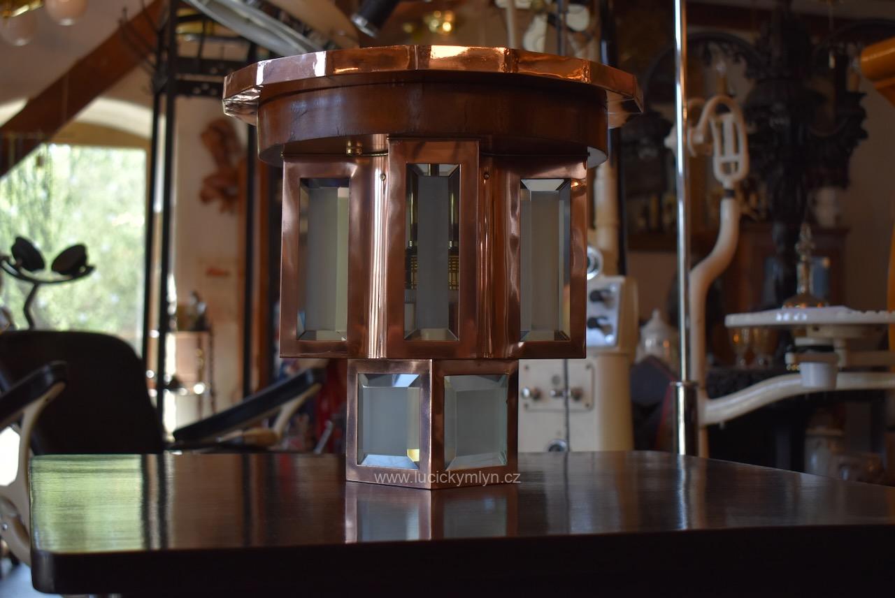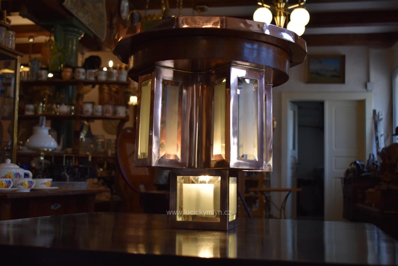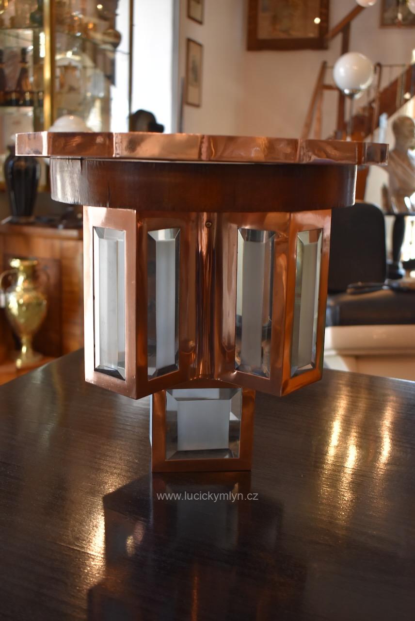 Reprezentativní stropní svítidlo s výrazně geometricky pojatou kompozicí je sestaveno z více odstupňovaných základových kruhových a mnohoúhelníkových desek, které tvoří pevnou dřevěnou základnu s opláštěným leštěným měděným plechem. Z této podstavy vyrůstá čtveřice vyšších měděných „pilířů“ se vsazenými podlouhlými skly a nad nimi nápaditě vystupuje čtvercová kubusová nástavba, opět se skleněnými výplněmi – celek tak připomíná světelnou architekturu ve stylu modernismu a art‑deca. Prosklené hranoly fungují jako subtilní stínidla a zároveň rozptylují i lámou světlo, takže salonní lustr vytváří působivou atmosféru jak při přímém svitu, tak i v odrazech na měděném povrchu. Svítidlo pochází z 1. poloviny 20. století a je zhotoveno v duchu dobového geometrického a funkcionalistického designu, s důrazem na čisté linie, precizní klempířské zpracování a kombinaci teplého kovu s čirým, okrajově broušeným sklem. Muzejní lustr je po odborném vyčištění, včetně zrenovovaného povrchu z leštěné mědi. Elektroinstalace byla nově provedena a užívá jedné repasované objímky se závitem na běžný typ žárovky. Větší a zcela ojedinělé modernistické stropní světlo z bohatšího měšťanského prostředí, vynikne zejména ve vstupní hale, nad schodištěm, nebo v reprezentativním obývacím pokoji s prvky art‑deca či modernismu. Světlo se dá zavěsit za dílec z ohýbané pásoviny, nebo spíše přišroubovat čtyřmi skrytými vruty přímo ke stropu. K zaslepení otvorů slouží dobové mosazné krytky s krátkými dřevěnými kolíčky, jež se lehce zasadí a případně opatrně vyjímají za pomoci ostří nože ve střední části nikoli za pomoci špičky.