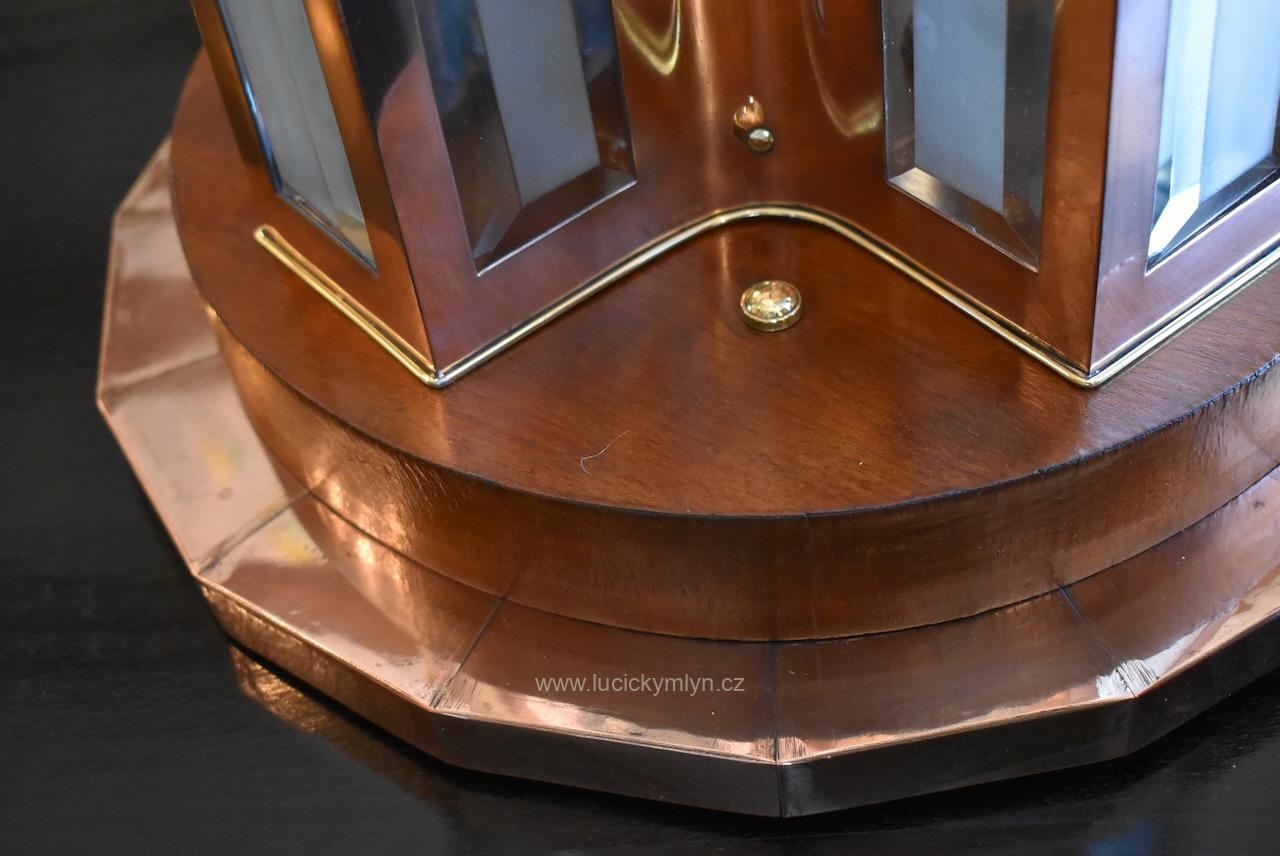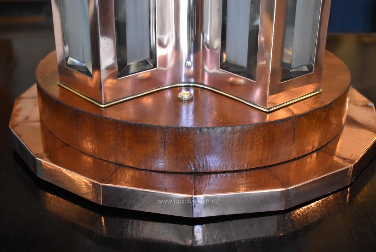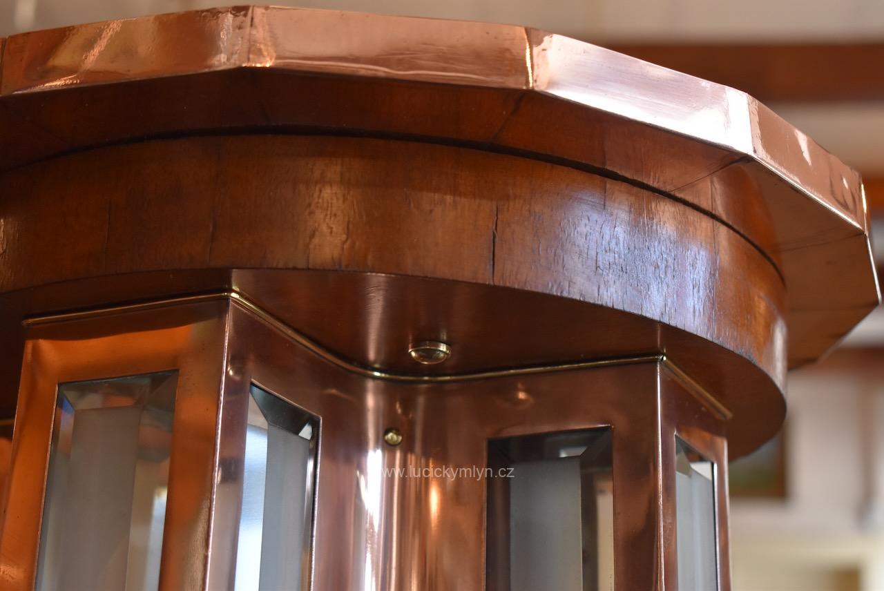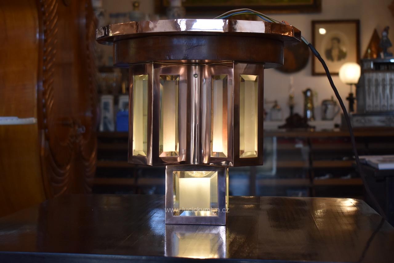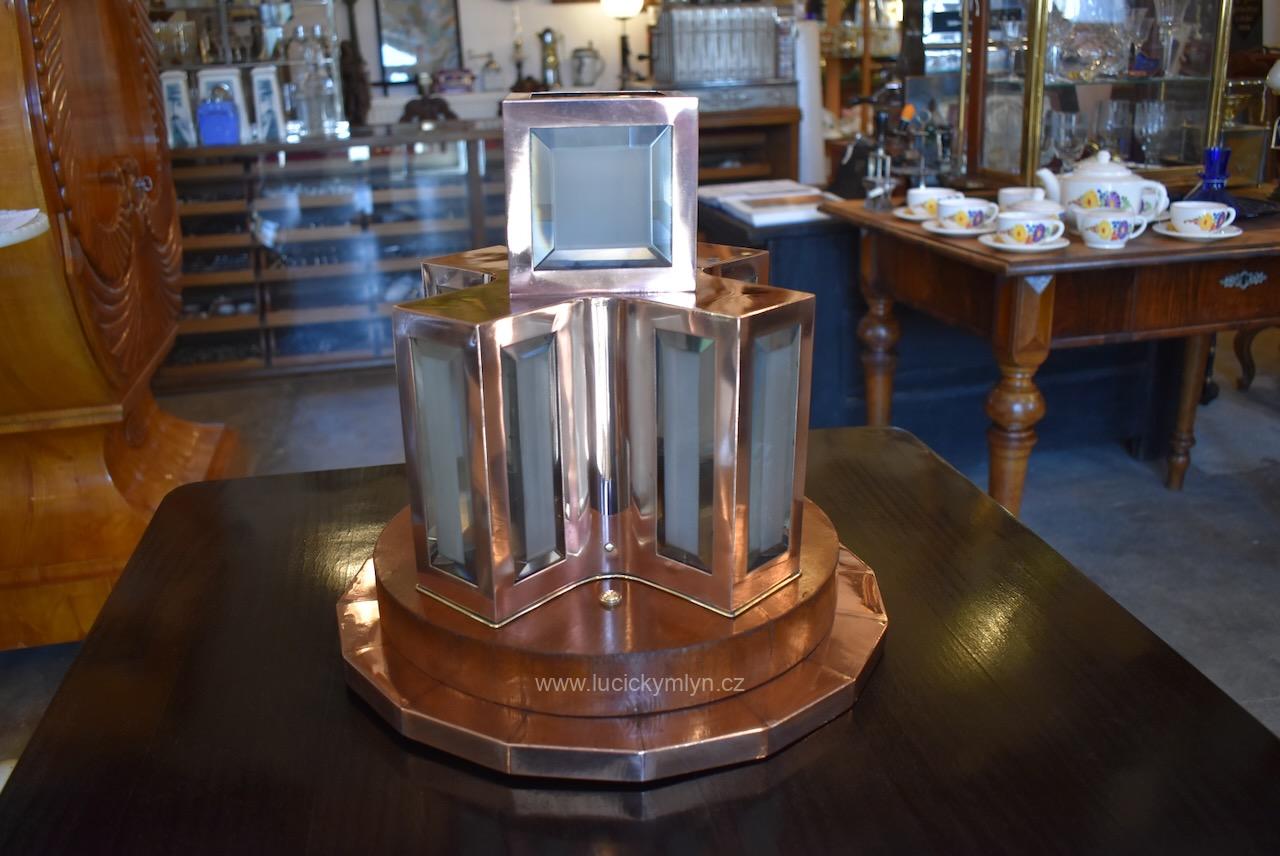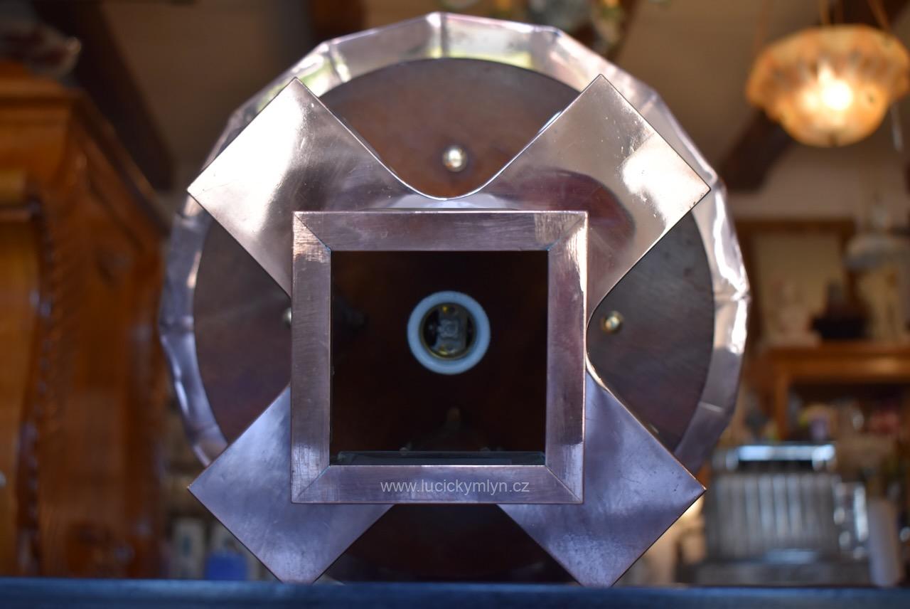 Reprezentativní stropní svítidlo s výrazně geometricky pojatou kompozicí je sestaveno z více odstupňovaných základových kruhových a mnohoúhelníkových desek, které tvoří pevnou dřevěnou základnu s opláštěným leštěným měděným plechem. Z této podstavy vyrůstá čtveřice vyšších měděných „pilířů“ se vsazenými podlouhlými skly a nad nimi nápaditě vystupuje čtvercová kubusová nástavba, opět se skleněnými výplněmi – celek tak připomíná světelnou architekturu ve stylu modernismu a art‑deca. Prosklené hranoly fungují jako subtilní stínidla a zároveň rozptylují i lámou světlo, takže salonní lustr vytváří působivou atmosféru jak při přímém svitu, tak i v odrazech na měděném povrchu. Svítidlo pochází z 1. poloviny 20. století a je zhotoveno v duchu dobového geometrického a funkcionalistického designu, s důrazem na čisté linie, precizní klempířské zpracování a kombinaci teplého kovu s čirým, okrajově broušeným sklem. Muzejní lustr je po odborném vyčištění, včetně zrenovovaného povrchu z leštěné mědi. Elektroinstalace byla nově provedena a užívá jedné repasované objímky se závitem na běžný typ žárovky. Větší a zcela ojedinělé modernistické stropní světlo z bohatšího měšťanského prostředí, vynikne zejména ve vstupní hale, nad schodištěm, nebo v reprezentativním obývacím pokoji s prvky art‑deca či modernismu. Světlo se dá zavěsit za dílec z ohýbané pásoviny, nebo spíše přišroubovat čtyřmi skrytými vruty přímo ke stropu. K zaslepení otvorů slouží dobové mosazné krytky s krátkými dřevěnými kolíčky, jež se lehce zasadí a případně opatrně vyjímají za pomoci ostří nože ve střední části nikoli za pomoci špičky.