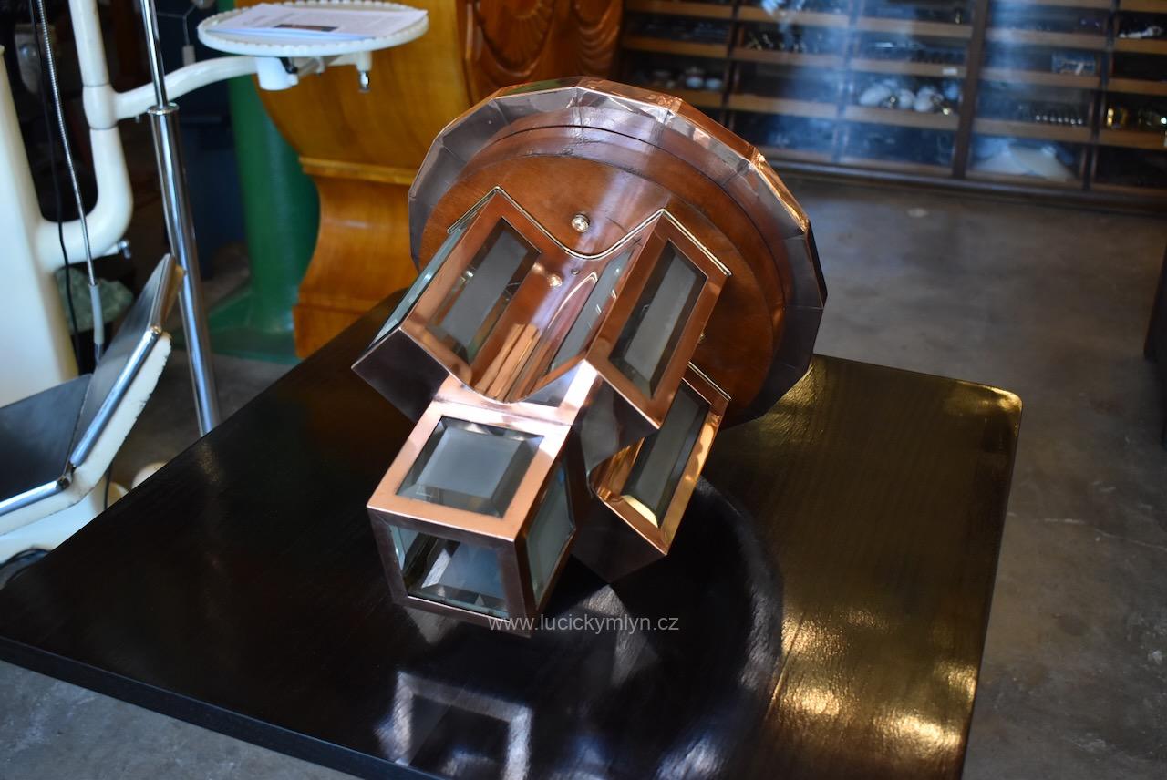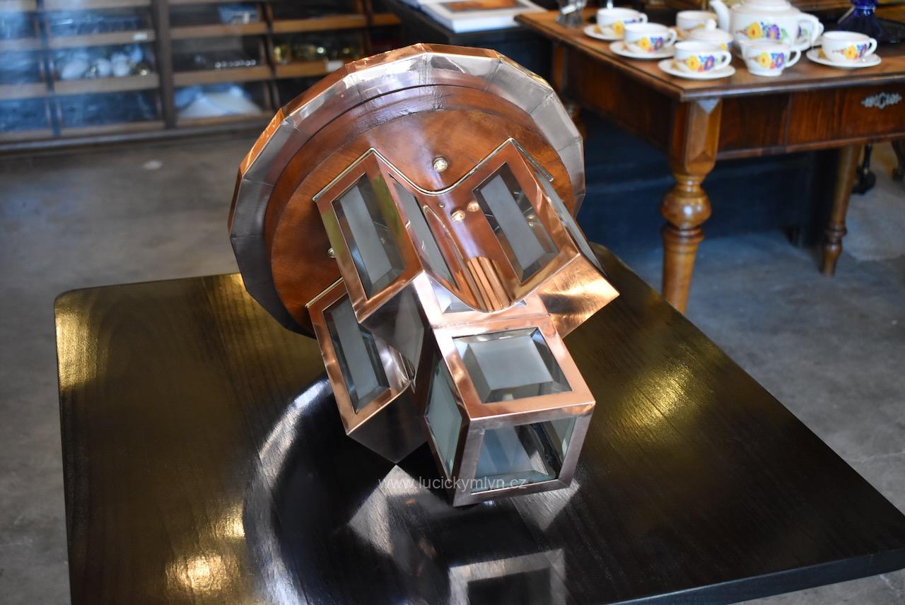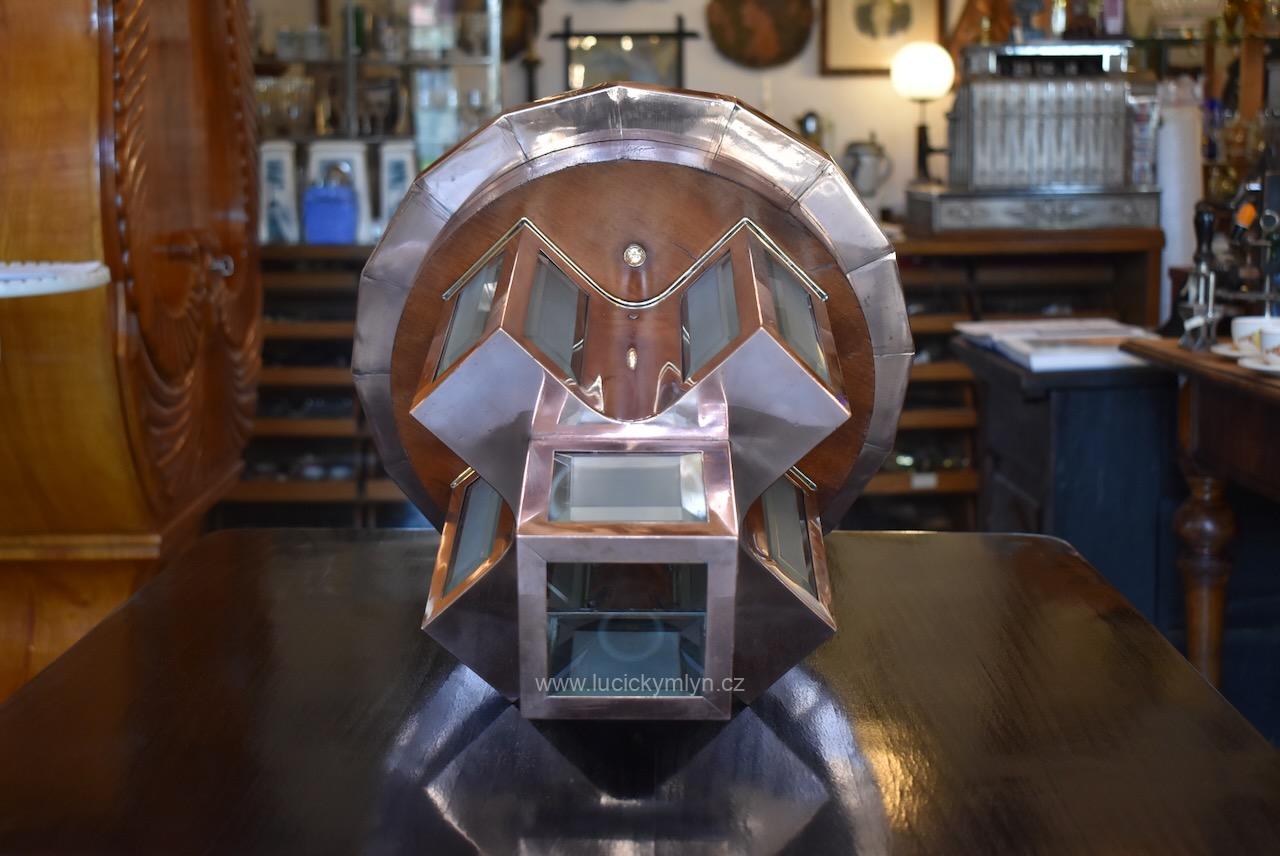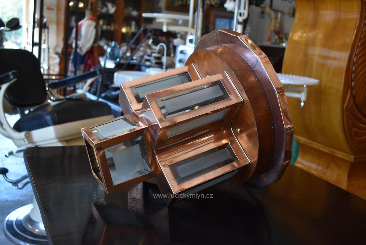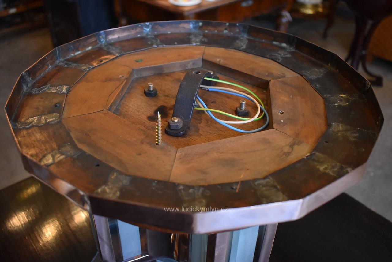 Reprezentativní stropní svítidlo s výrazně geometricky pojatou kompozicí je sestaveno z více odstupňovaných základových kruhových a mnohoúhelníkových desek, které tvoří pevnou dřevěnou základnu s opláštěným leštěným měděným plechem. Z této podstavy vyrůstá čtveřice vyšších měděných „pilířů“ se vsazenými podlouhlými skly a nad nimi nápaditě vystupuje čtvercová kubusová nástavba, opět se skleněnými výplněmi – celek tak připomíná světelnou architekturu ve stylu modernismu a art‑deca. Prosklené hranoly fungují jako subtilní stínidla a zároveň rozptylují i lámou světlo, takže salonní lustr vytváří působivou atmosféru jak při přímém svitu, tak i v odrazech na měděném povrchu. Svítidlo pochází z 1. poloviny 20. století a je zhotoveno v duchu dobového geometrického a funkcionalistického designu, s důrazem na čisté linie, precizní klempířské zpracování a kombinaci teplého kovu s čirým, okrajově broušeným sklem. Muzejní lustr je po odborném vyčištění, včetně zrenovovaného povrchu z leštěné mědi. Elektroinstalace byla nově provedena a užívá jedné repasované objímky se závitem na běžný typ žárovky. Větší a zcela ojedinělé modernistické stropní světlo z bohatšího měšťanského prostředí, vynikne zejména ve vstupní hale, nad schodištěm, nebo v reprezentativním obývacím pokoji s prvky art‑deca či modernismu. Světlo se dá zavěsit za dílec z ohýbané pásoviny, nebo spíše přišroubovat čtyřmi skrytými vruty přímo ke stropu. K zaslepení otvorů slouží dobové mosazné krytky s krátkými dřevěnými kolíčky, jež se lehce zasadí a případně opatrně vyjímají za pomoci ostří nože ve střední části nikoli za pomoci špičky.