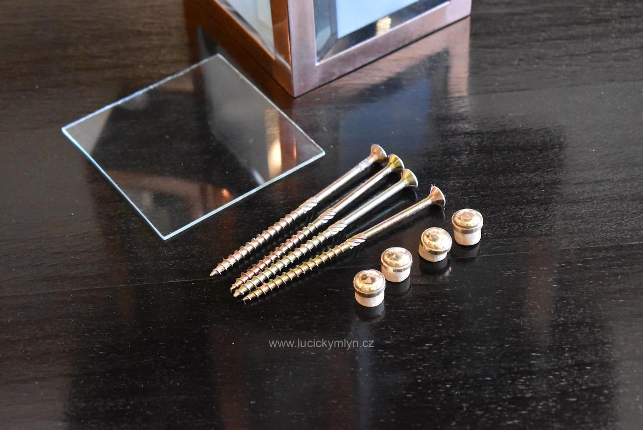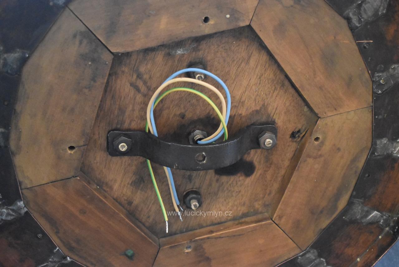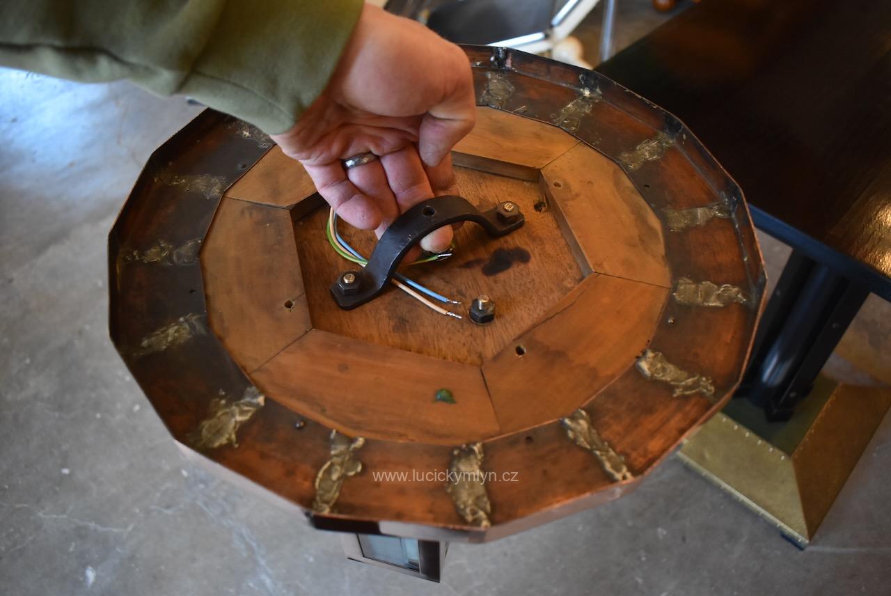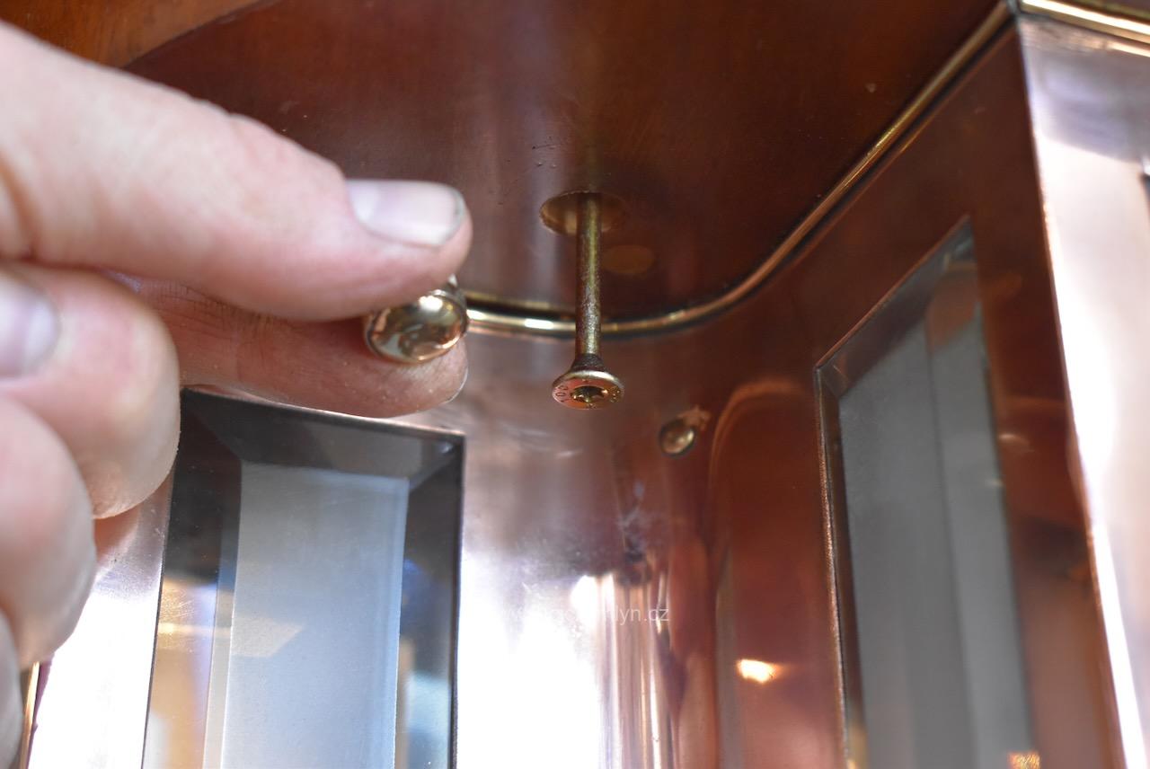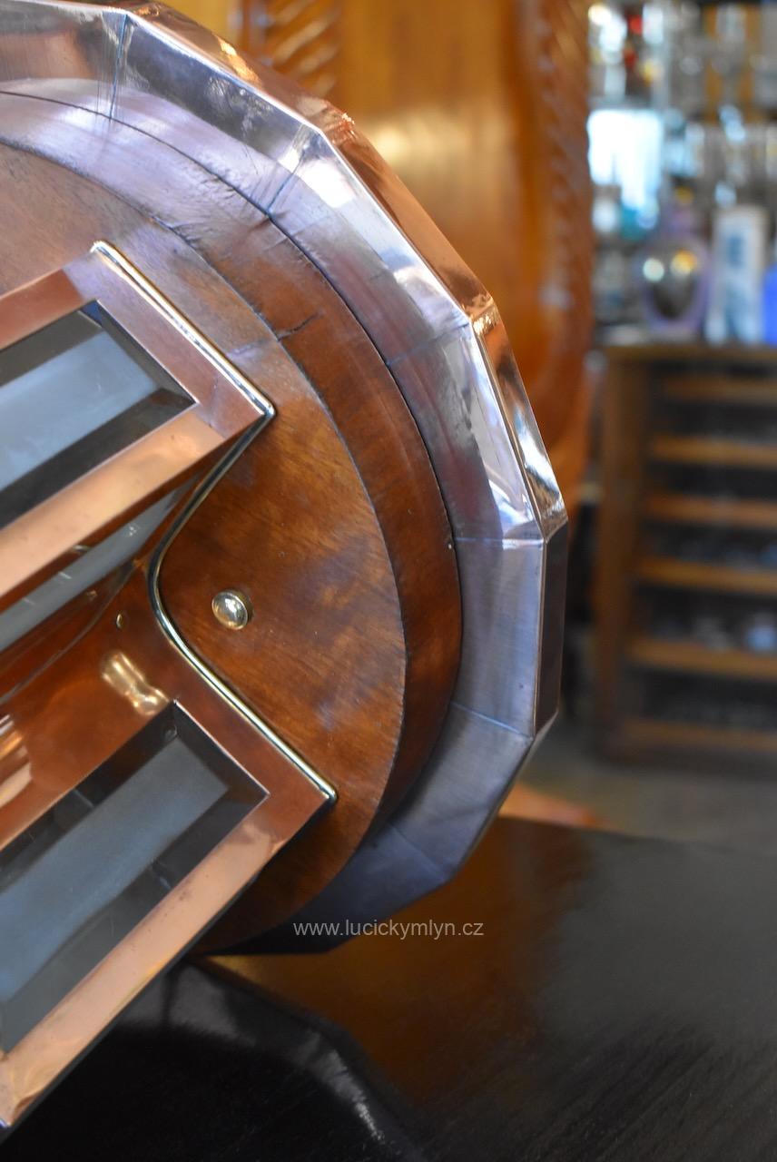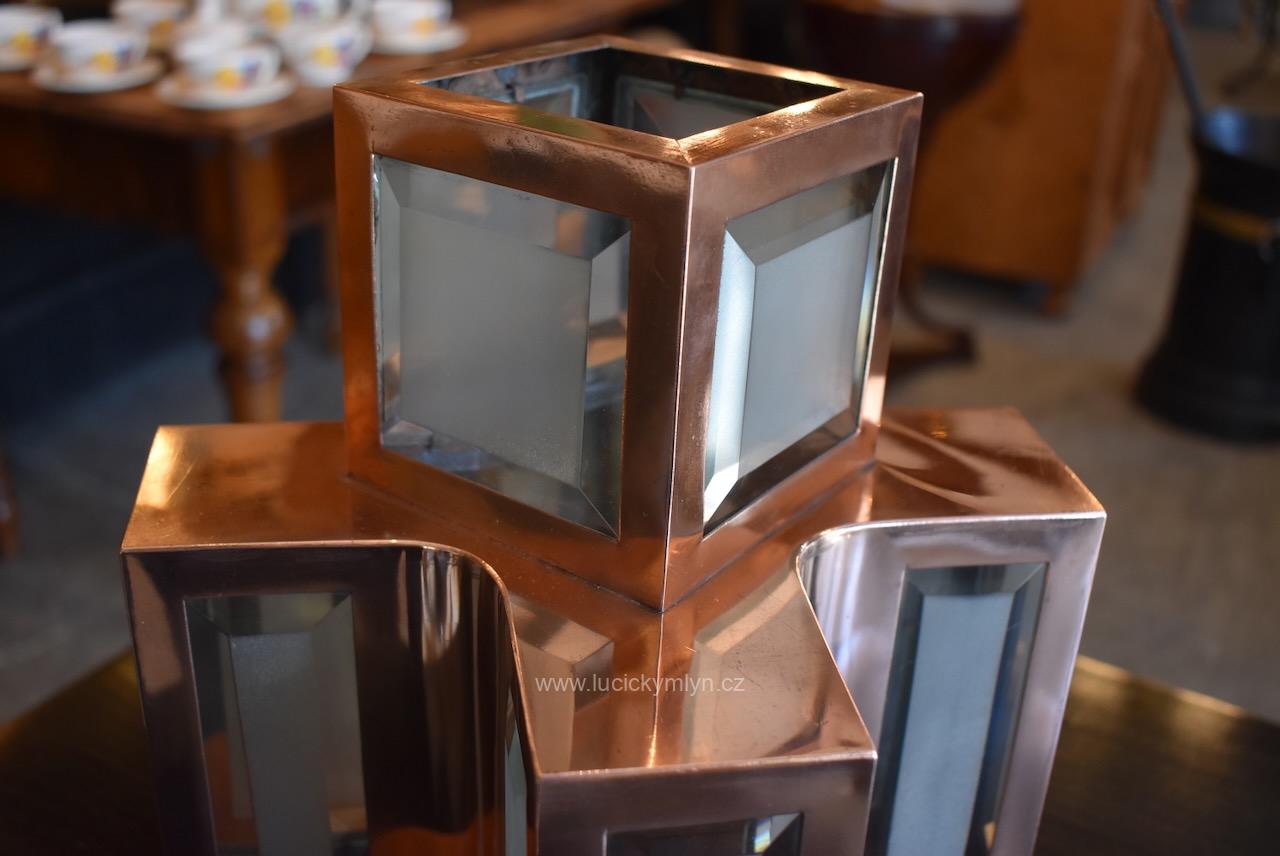 Reprezentativní stropní svítidlo s výrazně geometricky pojatou kompozicí je sestaveno z více odstupňovaných základových kruhových a mnohoúhelníkových desek, které tvoří pevnou dřevěnou základnu s opláštěným leštěným měděným plechem. Z této podstavy vyrůstá čtveřice vyšších měděných „pilířů“ se vsazenými podlouhlými skly a nad nimi nápaditě vystupuje čtvercová kubusová nástavba, opět se skleněnými výplněmi – celek tak připomíná světelnou architekturu ve stylu modernismu a art‑deca. Prosklené hranoly fungují jako subtilní stínidla a zároveň rozptylují i lámou světlo, takže salonní lustr vytváří působivou atmosféru jak při přímém svitu, tak i v odrazech na měděném povrchu. Svítidlo pochází z 1. poloviny 20. století a je zhotoveno v duchu dobového geometrického a funkcionalistického designu, s důrazem na čisté linie, precizní klempířské zpracování a kombinaci teplého kovu s čirým, okrajově broušeným sklem. Muzejní lustr je po odborném vyčištění, včetně zrenovovaného povrchu z leštěné mědi. Elektroinstalace byla nově provedena a užívá jedné repasované objímky se závitem na běžný typ žárovky. Větší a zcela ojedinělé modernistické stropní světlo z bohatšího měšťanského prostředí, vynikne zejména ve vstupní hale, nad schodištěm, nebo v reprezentativním obývacím pokoji s prvky art‑deca či modernismu. Světlo se dá zavěsit za dílec z ohýbané pásoviny, nebo spíše přišroubovat čtyřmi skrytými vruty přímo ke stropu. K zaslepení otvorů slouží dobové mosazné krytky s krátkými dřevěnými kolíčky, jež se lehce zasadí a případně opatrně vyjímají za pomoci ostří nože ve střední části nikoli za pomoci špičky.