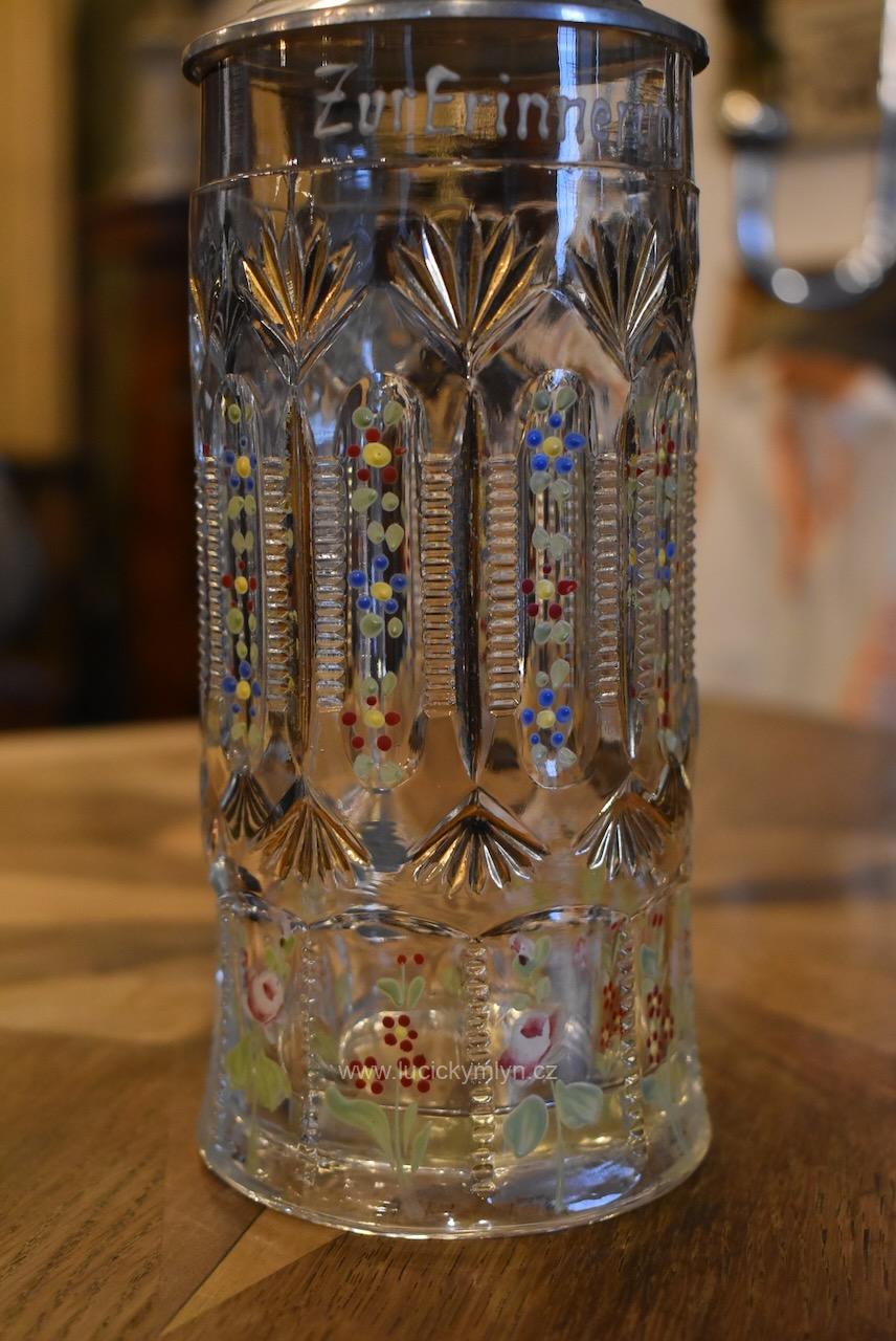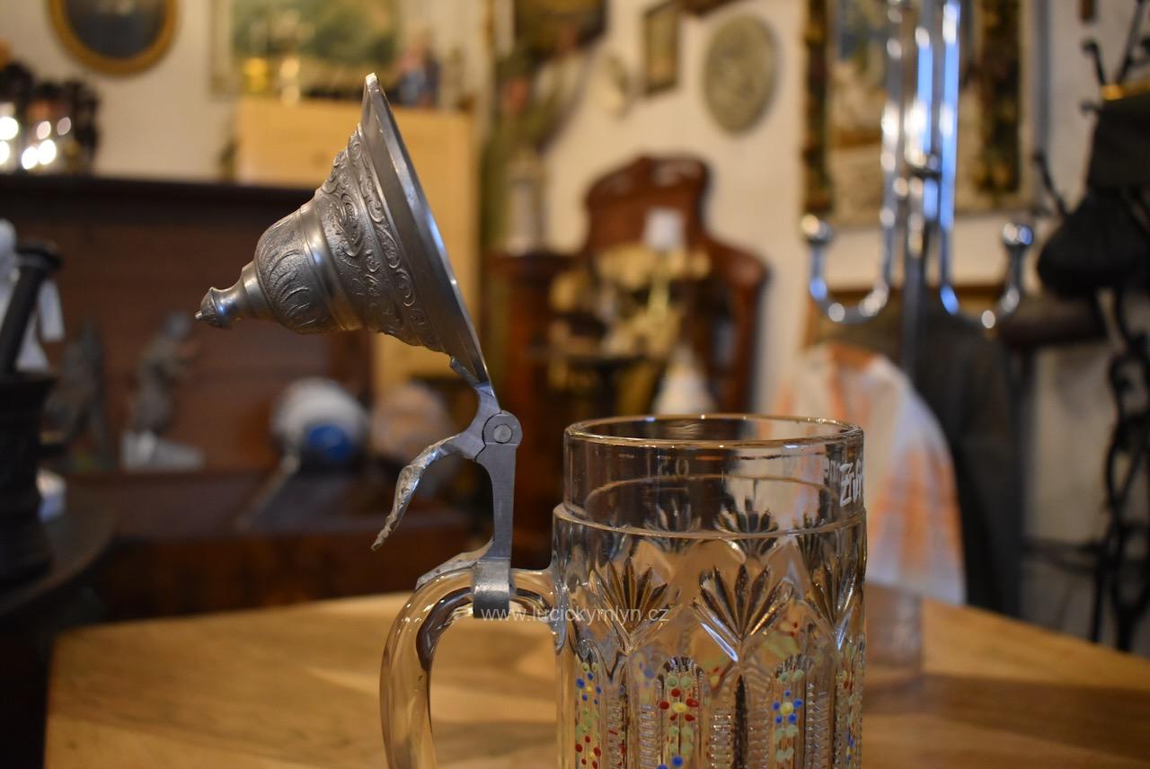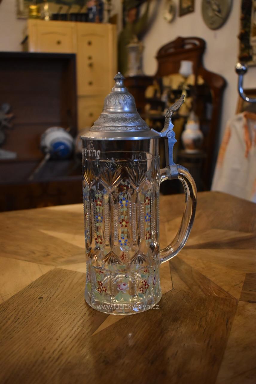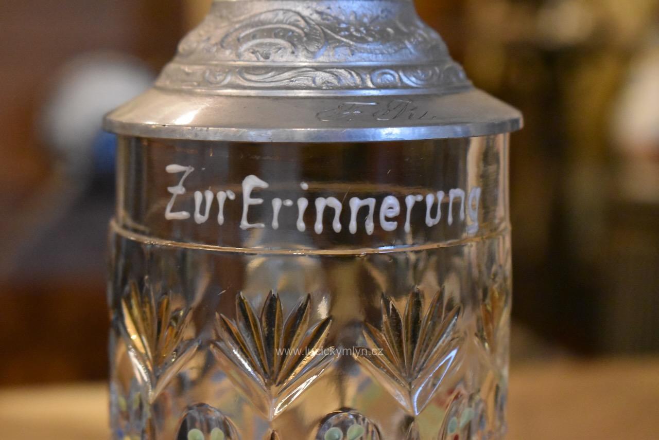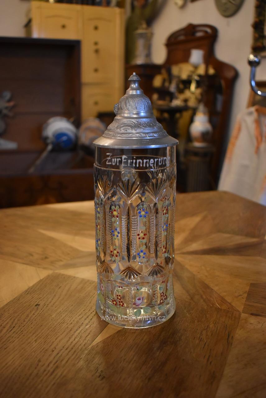 Dekorativní a nápadně vysoký půllitr z čirého, lisovaného a broušeného skla má kónicky protažené stěny se svislými plastickými žlábky, mezi nimiž jsou ručně malované květinové a puntíkové motivy z barevných emailů. Hraněnou základnu sklenice dekorativně obepíná pás drobnějších kvítků se zeleným listovím. Pod horním okrajem je rytý německý nápis „Zur Erinnerung“ („Na památku“), který prozrazuje, že šlo o osobní pamětní dar. Na dně půllitru je vtlačená značka ve tvaru císařské korunky, jež je typická pro některé německé či rakouské sklářské dílny z přelomu 19. a 20. století. Horní část nádoby korunuje vysoké a bohatě zdobené cínové víčko jemně okrášlené reliéfním ornamentem, a zakončené drobnou věžičkou. Na oušku osazená cínová montáž nese palcem ovládaný překlápěcí mechanismus. Na okraji víčka vidíme rytý monogram původního majitele. Sklenice je kalibrována na objem 0,5 l a představuje typický, dnes sběratelsky vyhledávaný pamětní pivní korbel z období kolem roku 1900, vhodný jak do sbírky historického skla, tak jako výrazný solitér do stylové hospůdky či domácího baru.