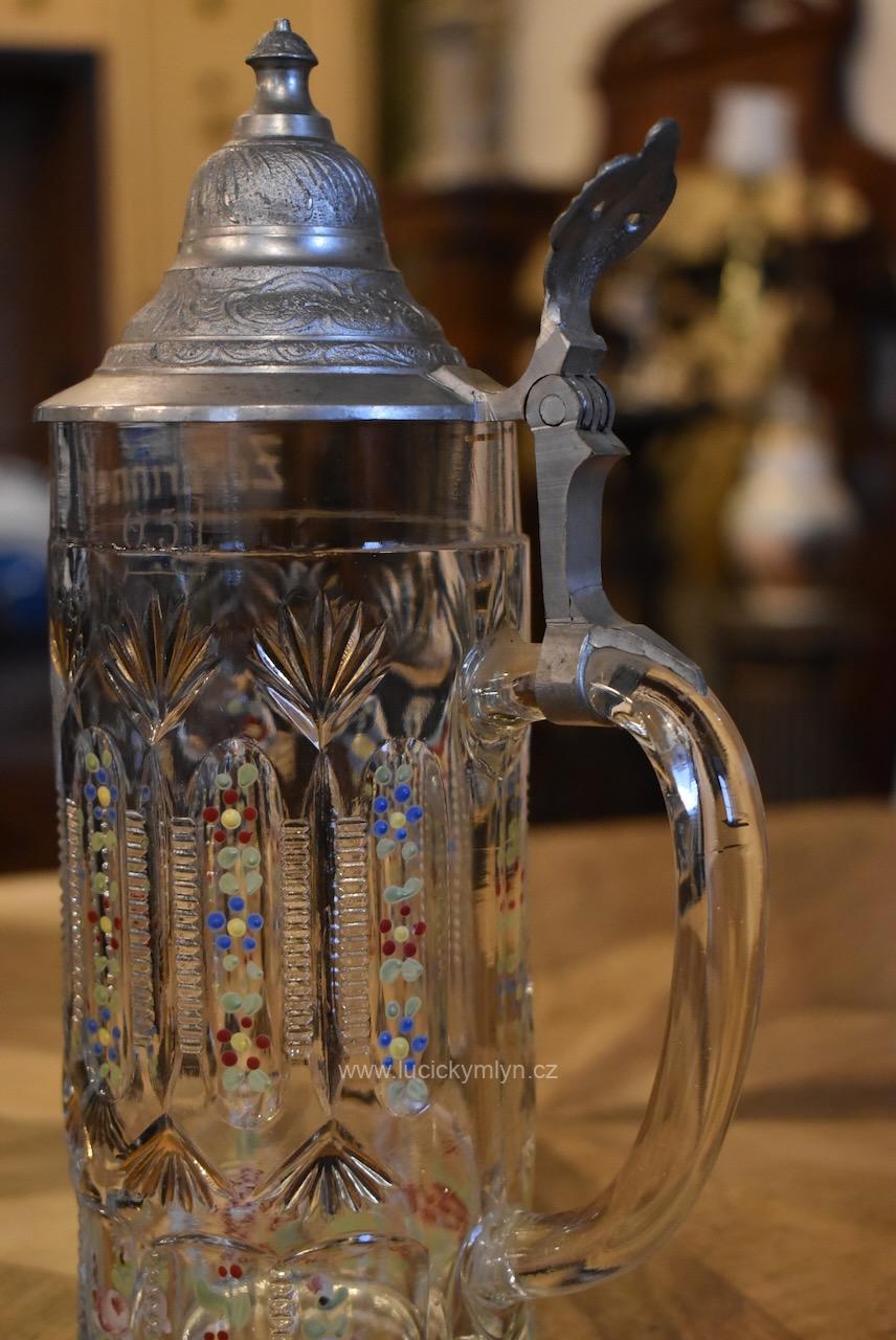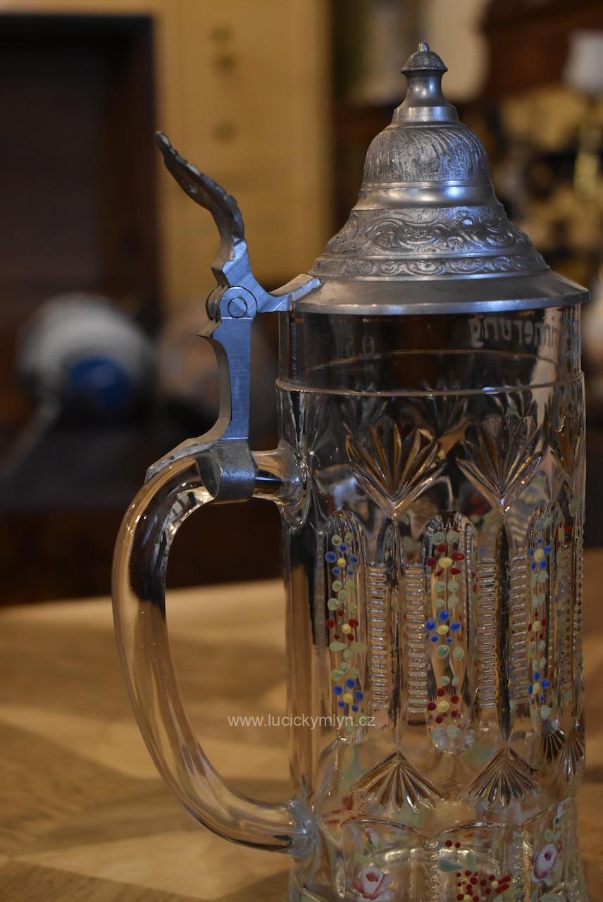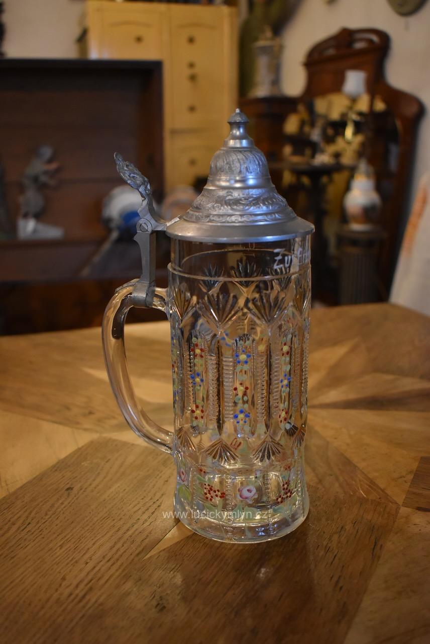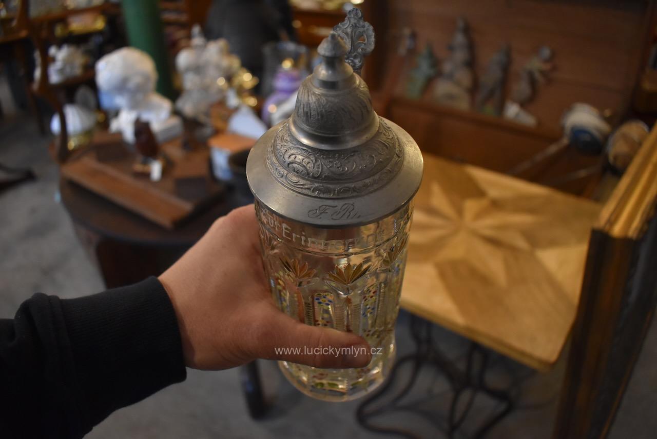 Dekorativní a nápadně vysoký půllitr z čirého, lisovaného a broušeného skla má kónicky protažené stěny se svislými plastickými žlábky, mezi nimiž jsou ručně malované květinové a puntíkové motivy z barevných emailů. Hraněnou základnu sklenice dekorativně obepíná pás drobnějších kvítků se zeleným listovím. Pod horním okrajem je rytý německý nápis „Zur Erinnerung“ („Na památku“), který prozrazuje, že šlo o osobní pamětní dar. Na dně půllitru je vtlačená značka ve tvaru císařské korunky, jež je typická pro některé německé či rakouské sklářské dílny z přelomu 19. a 20. století. Horní část nádoby korunuje vysoké a bohatě zdobené cínové víčko jemně okrášlené reliéfním ornamentem, a zakončené drobnou věžičkou. Na oušku osazená cínová montáž nese palcem ovládaný překlápěcí mechanismus. Na okraji víčka vidíme rytý monogram původního majitele. Sklenice je kalibrována na objem 0,5 l a představuje typický, dnes sběratelsky vyhledávaný pamětní pivní korbel z období kolem roku 1900, vhodný jak do sbírky historického skla, tak jako výrazný solitér do stylové hospůdky či domácího baru.