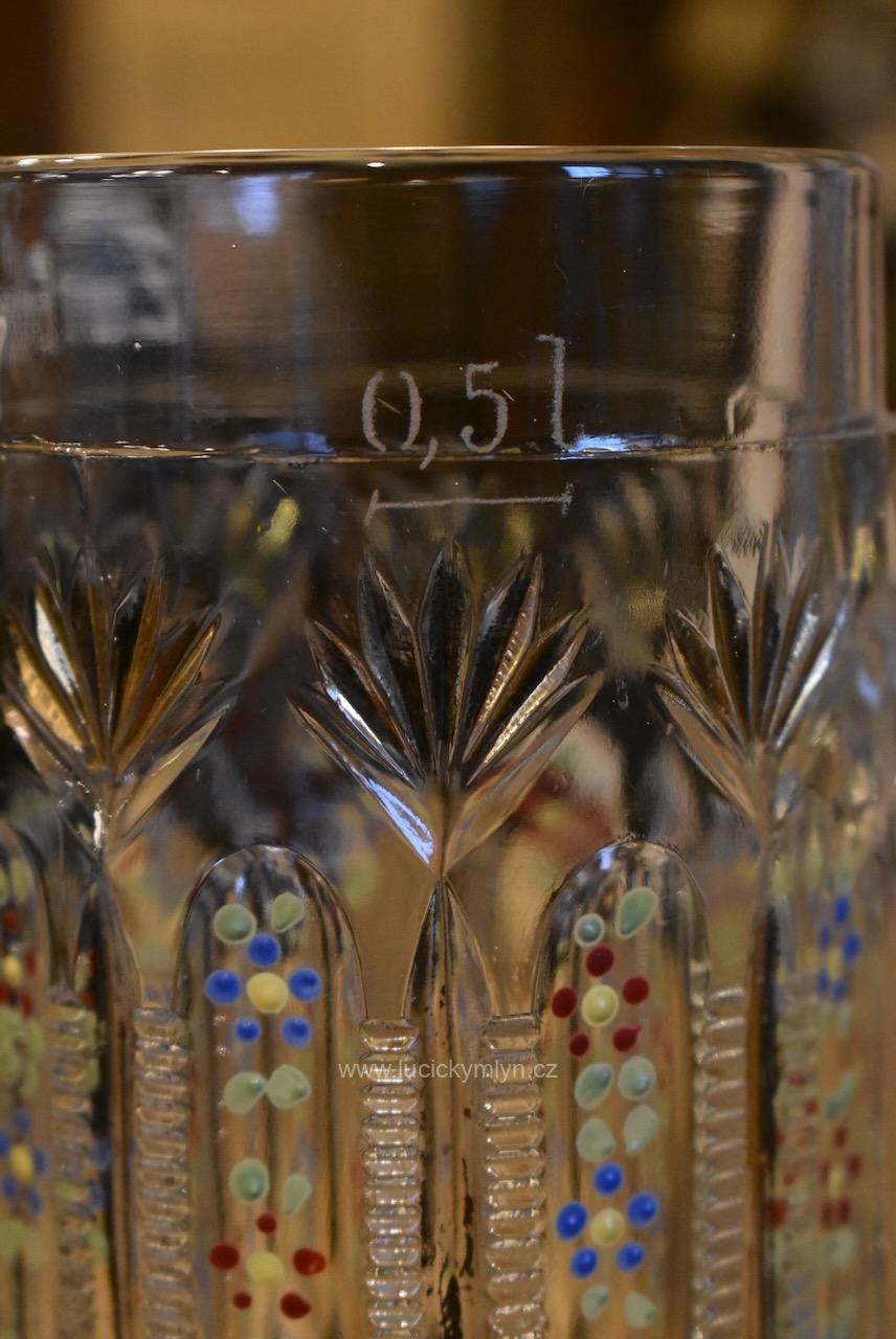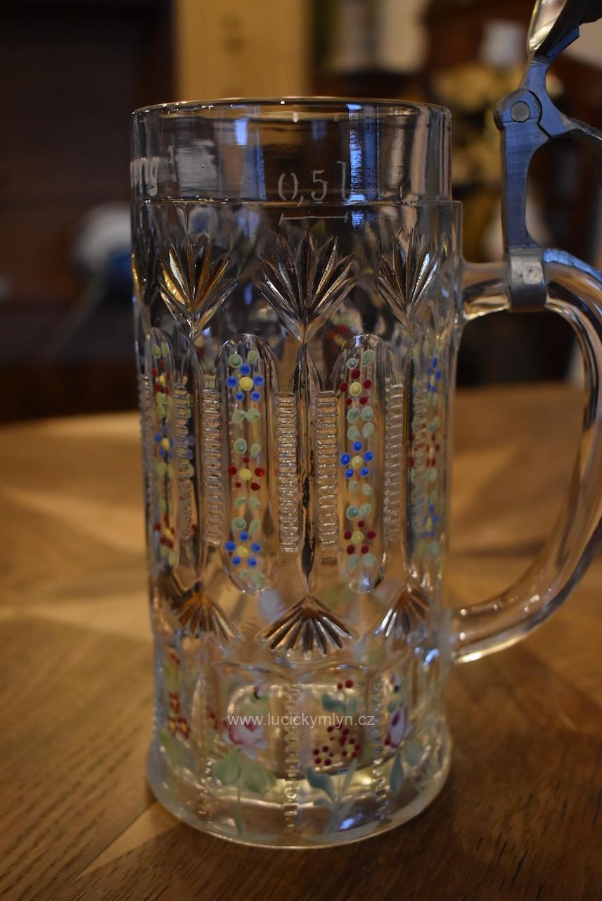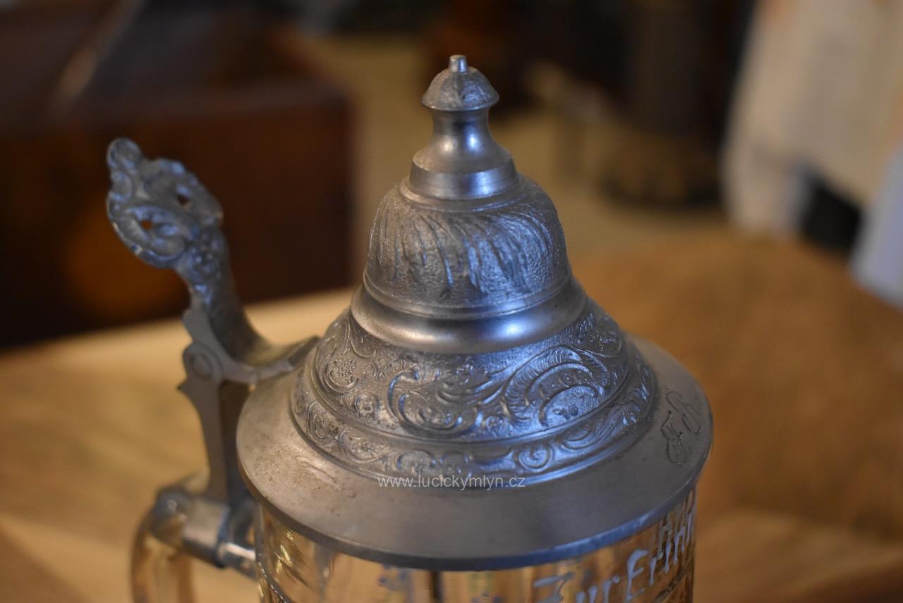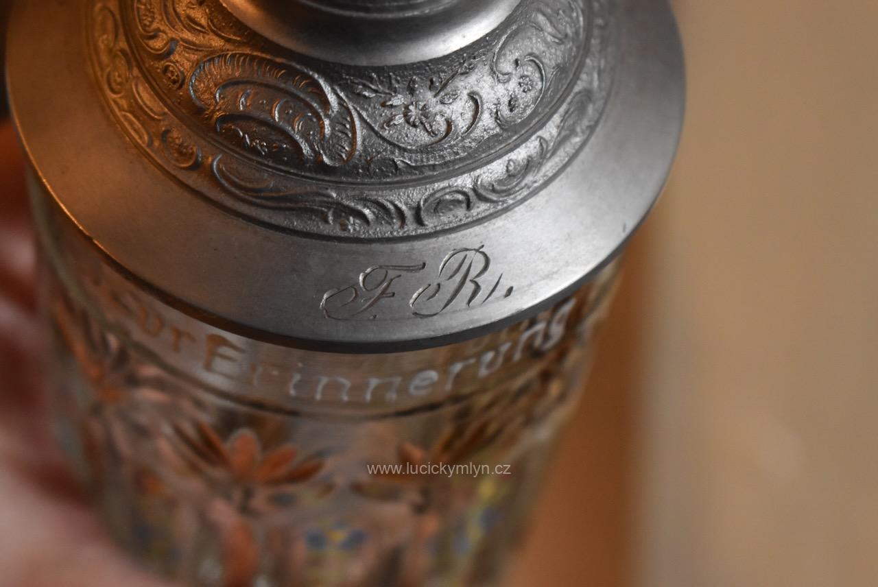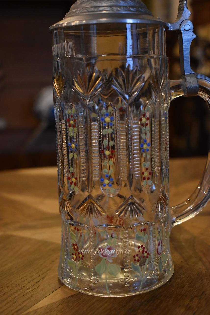 Dekorativní a nápadně vysoký půllitr z čirého, lisovaného a broušeného skla má kónicky protažené stěny se svislými plastickými žlábky, mezi nimiž jsou ručně malované květinové a puntíkové motivy z barevných emailů. Hraněnou základnu sklenice dekorativně obepíná pás drobnějších kvítků se zeleným listovím. Pod horním okrajem je rytý německý nápis „Zur Erinnerung“ („Na památku“), který prozrazuje, že šlo o osobní pamětní dar. Na dně půllitru je vtlačená značka ve tvaru císařské korunky, jež je typická pro některé německé či rakouské sklářské dílny z přelomu 19. a 20. století. Horní část nádoby korunuje vysoké a bohatě zdobené cínové víčko jemně okrášlené reliéfním ornamentem, a zakončené drobnou věžičkou. Na oušku osazená cínová montáž nese palcem ovládaný překlápěcí mechanismus. Na okraji víčka vidíme rytý monogram původního majitele. Sklenice je kalibrována na objem 0,5 l a představuje typický, dnes sběratelsky vyhledávaný pamětní pivní korbel z období kolem roku 1900, vhodný jak do sbírky historického skla, tak jako výrazný solitér do stylové hospůdky či domácího baru.