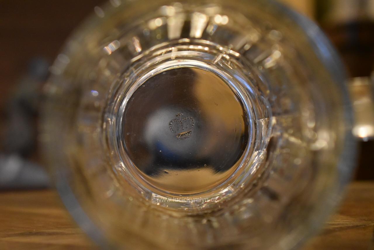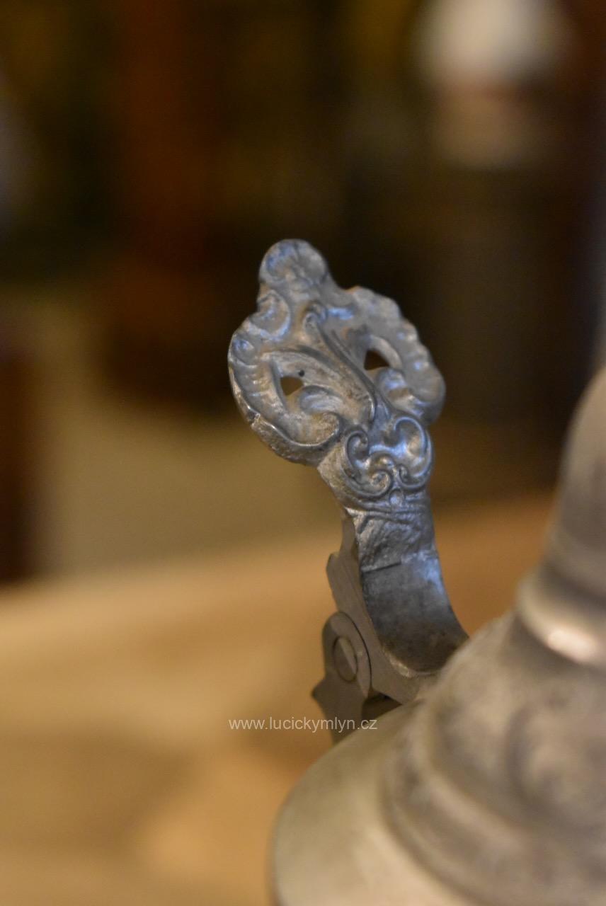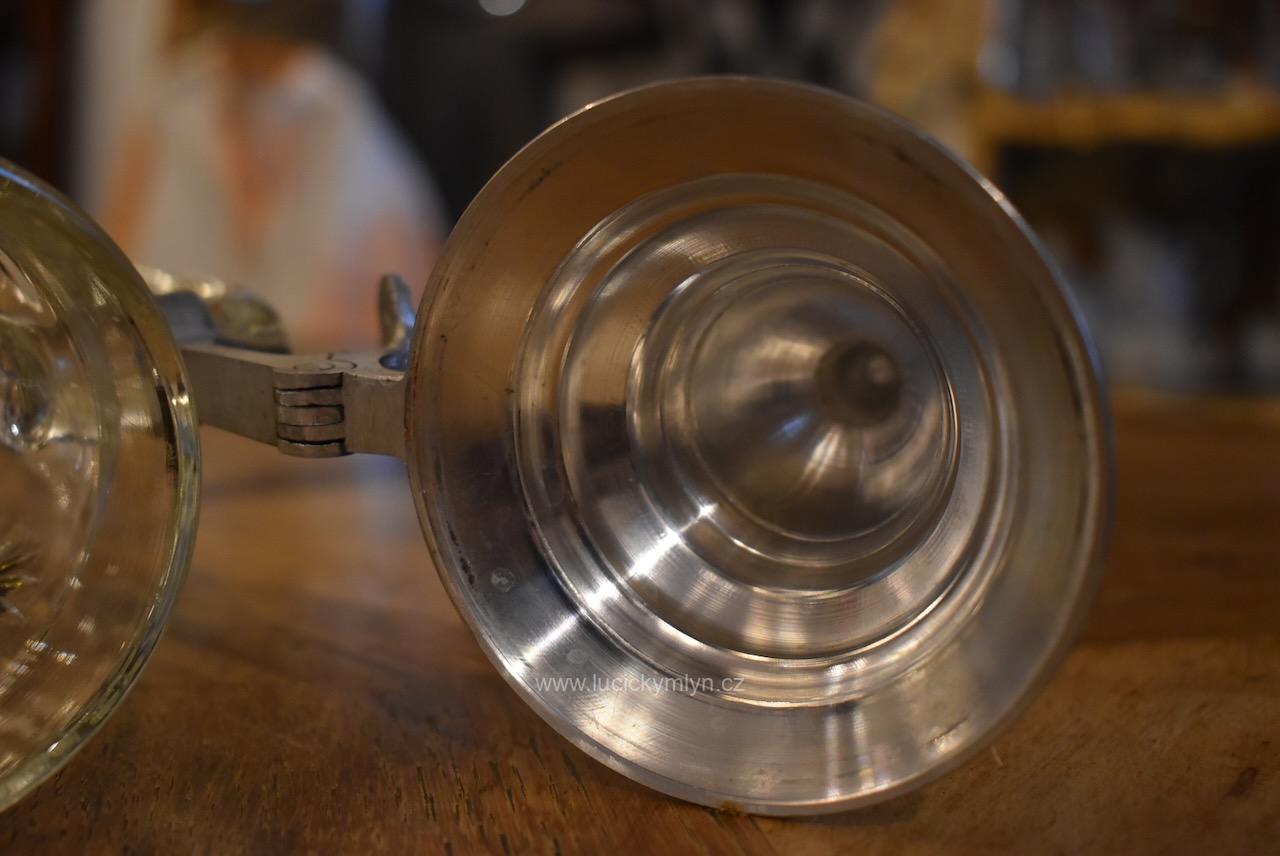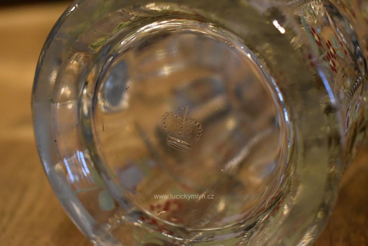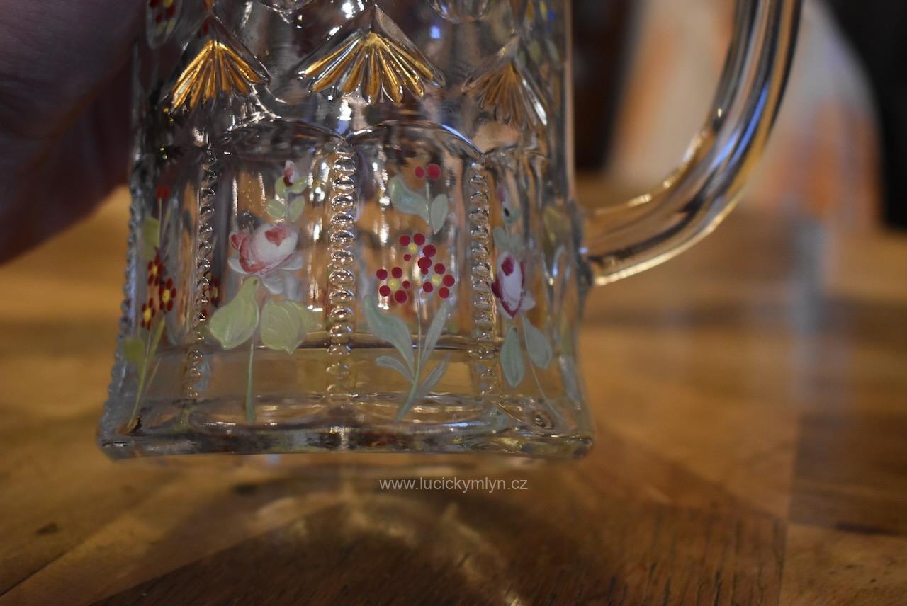 Dekorativní a nápadně vysoký půllitr z čirého, lisovaného a broušeného skla má kónicky protažené stěny se svislými plastickými žlábky, mezi nimiž jsou ručně malované květinové a puntíkové motivy z barevných emailů. Hraněnou základnu sklenice dekorativně obepíná pás drobnějších kvítků se zeleným listovím. Pod horním okrajem je rytý německý nápis „Zur Erinnerung“ („Na památku“), který prozrazuje, že šlo o osobní pamětní dar. Na dně půllitru je vtlačená značka ve tvaru císařské korunky, jež je typická pro některé německé či rakouské sklářské dílny z přelomu 19. a 20. století. Horní část nádoby korunuje vysoké a bohatě zdobené cínové víčko jemně okrášlené reliéfním ornamentem, a zakončené drobnou věžičkou. Na oušku osazená cínová montáž nese palcem ovládaný překlápěcí mechanismus. Na okraji víčka vidíme rytý monogram původního majitele. Sklenice je kalibrována na objem 0,5 l a představuje typický, dnes sběratelsky vyhledávaný pamětní pivní korbel z období kolem roku 1900, vhodný jak do sbírky historického skla, tak jako výrazný solitér do stylové hospůdky či domácího baru.