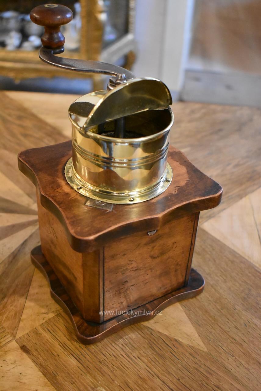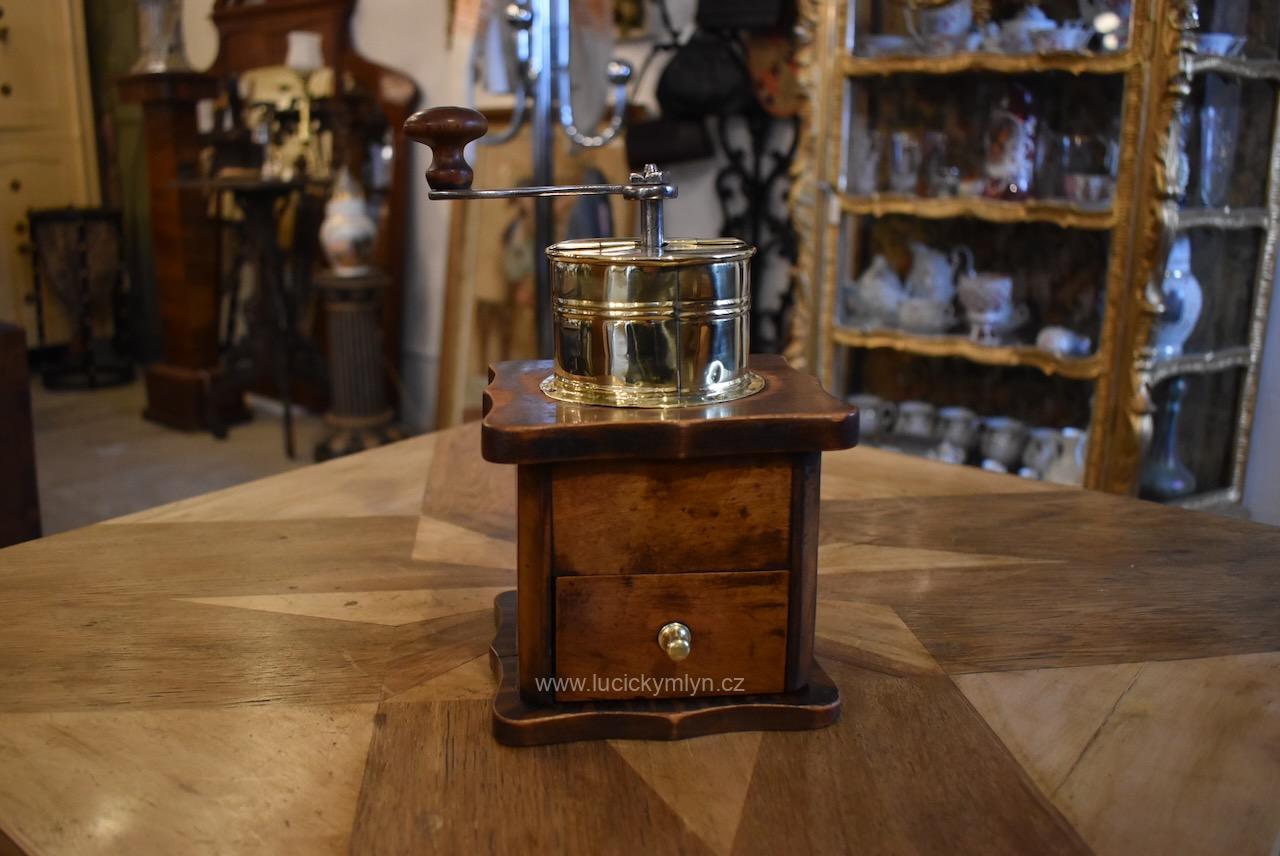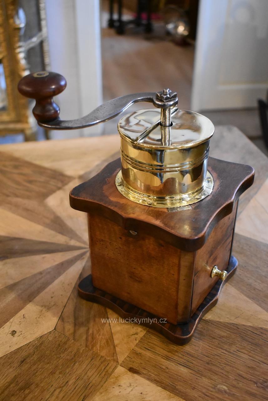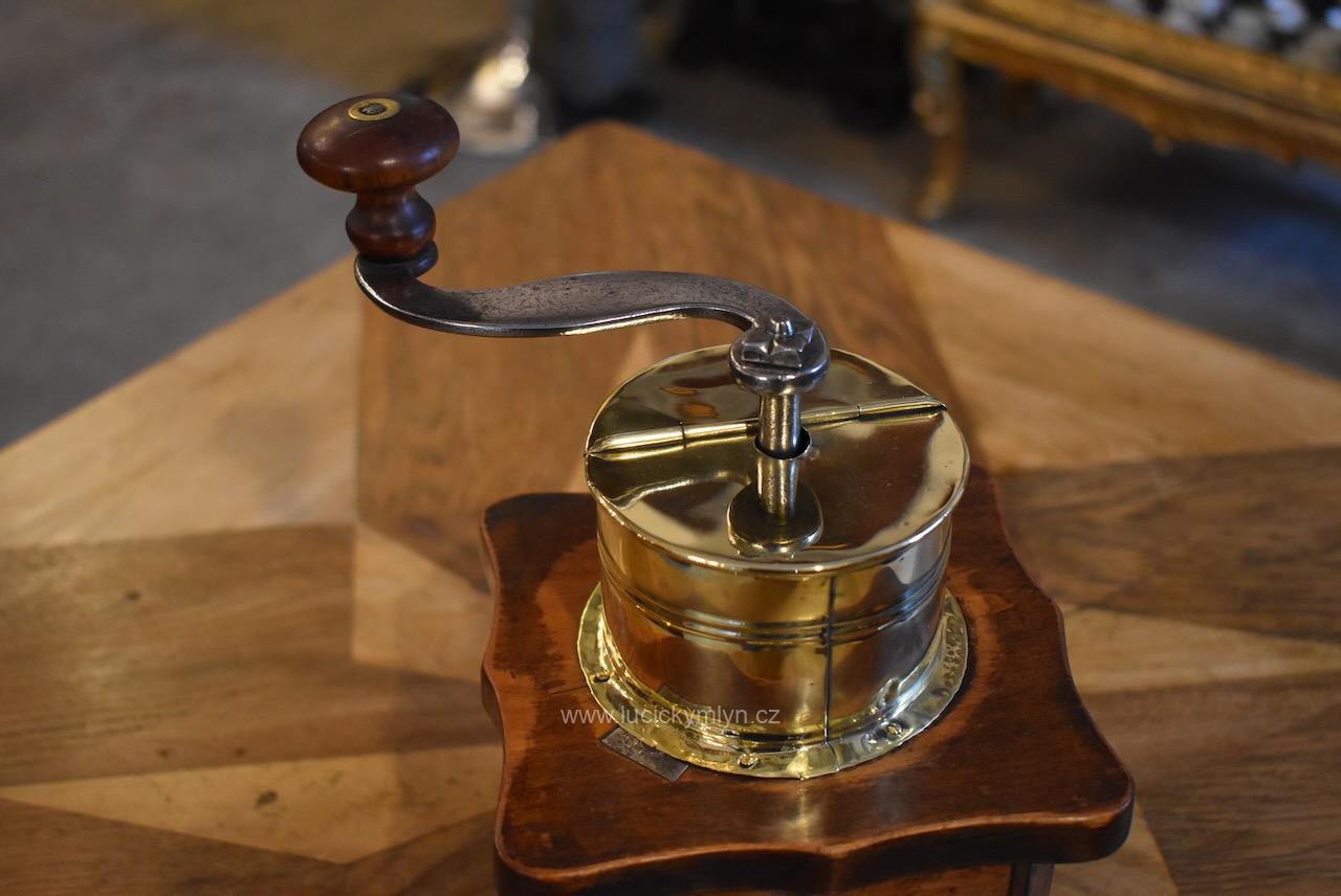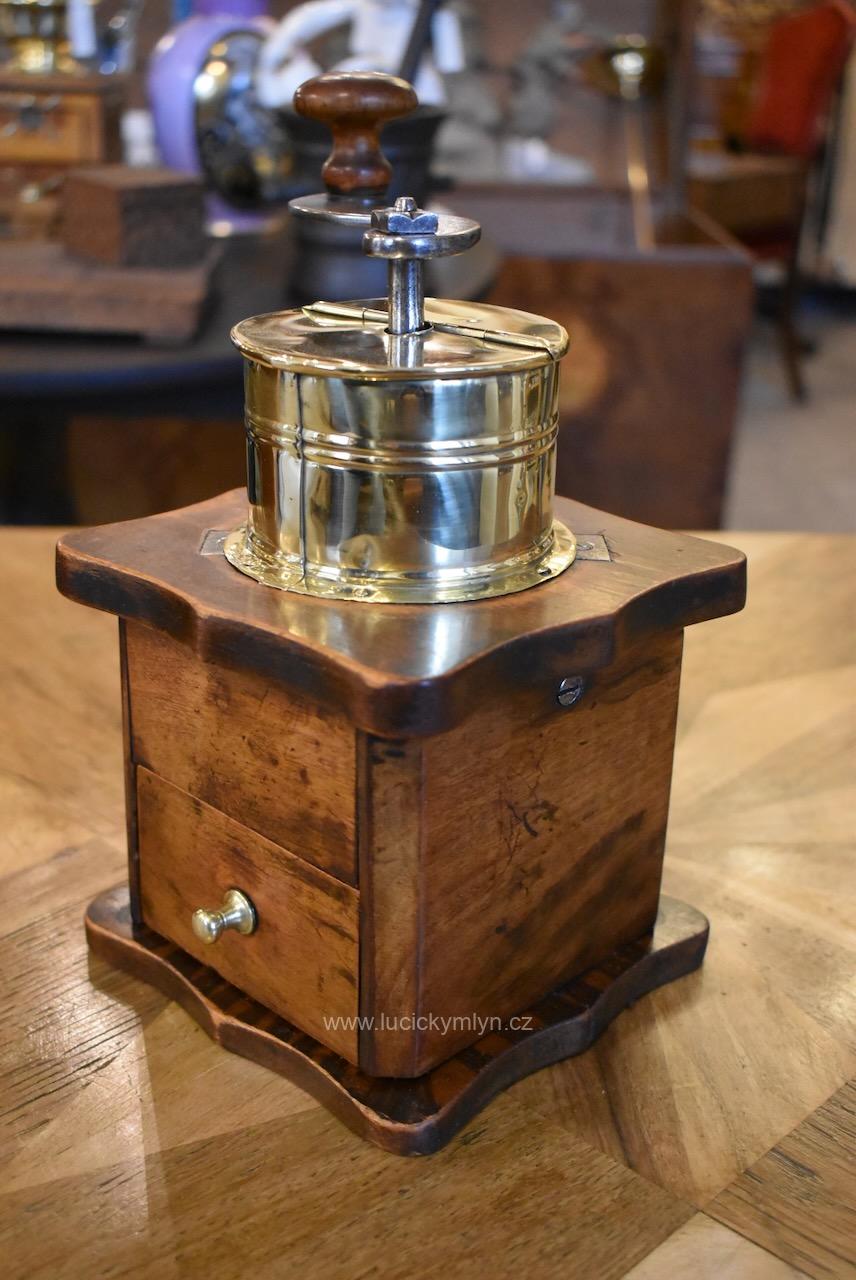 Měšťanský mlýnek se schránkou truhlářsky provedenou ve stylu vrcholného biedermeieru, pochází z období okolo roku 1840. Tento zachovalý a dodnes funkční mlýnek už mnohé pamatuje. Jeho ocelový strojek má truhlářsky vyrobenou schránku z mořeného masivního dřeva. Vzácně používaná válcová násypka z tlačené a leštěné mosazi má starší způsob plnícího otvoru, chráněný vzhůru odklápěcím víčkem. Hezká, esovitě tvarovaná a zámečnicky vyrobená klička, byla vybroušená z masivního železa. Ušlechtilé masivní dřevo kvádrové schránky, tvarově oživují rokokově vykrajované dílce vrchu a podstavy. Na čelní straně dole je zabudovaný šuplík s menší soustruženou knopkou z leštěné mosazi. Klička je zakončena hezky soustruženou úchytkou z masivního dřeva. Starožitný mlýnek i s plně funkčním mlecím mechanismem jsou po celkovém vyčištění a renovaci. Hezká sběratelská či kavárenská dekorace s krásnou letitou patinou je zcela autentickým předmětem, pocházejícím z bohatšího měšťanského prostředí.
