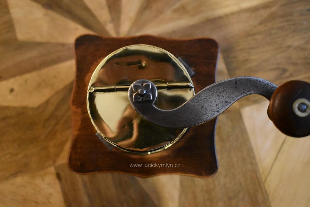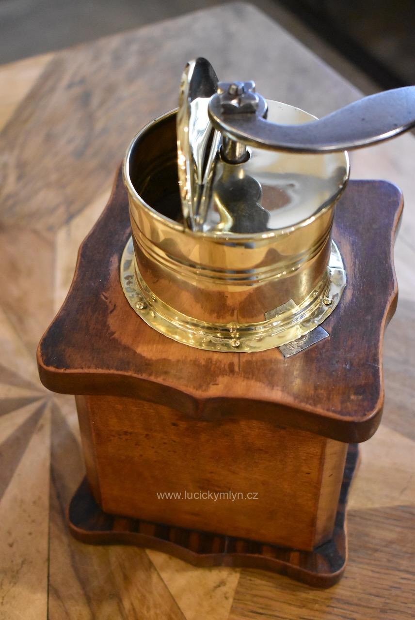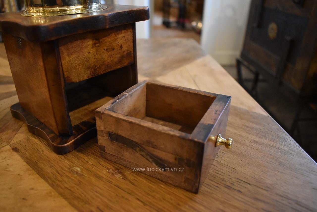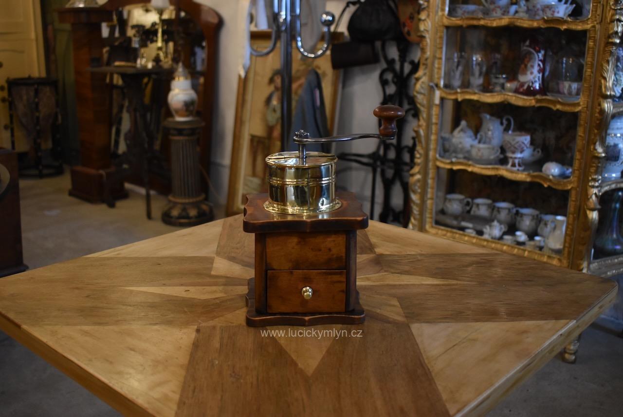 Měšťanský mlýnek se schránkou truhlářsky provedenou ve stylu vrcholného biedermeieru, pochází z období okolo roku 1840. Tento zachovalý a dodnes funkční mlýnek už mnohé pamatuje. Jeho ocelový strojek má truhlářsky vyrobenou schránku z mořeného masivního dřeva. Vzácně používaná válcová násypka z tlačené a leštěné mosazi má starší způsob plnícího otvoru, chráněný vzhůru odklápěcím víčkem. Hezká, esovitě tvarovaná a zámečnicky vyrobená klička, byla vybroušená z masivního železa. Ušlechtilé masivní dřevo kvádrové schránky, tvarově oživují rokokově vykrajované dílce vrchu a podstavy. Na čelní straně dole je zabudovaný šuplík s menší soustruženou knopkou z leštěné mosazi. Klička je zakončena hezky soustruženou úchytkou z masivního dřeva. Starožitný mlýnek i s plně funkčním mlecím mechanismem jsou po celkovém vyčištění a renovaci. Hezká sběratelská či kavárenská dekorace s krásnou letitou patinou je zcela autentickým předmětem, pocházejícím z bohatšího měšťanského prostředí.