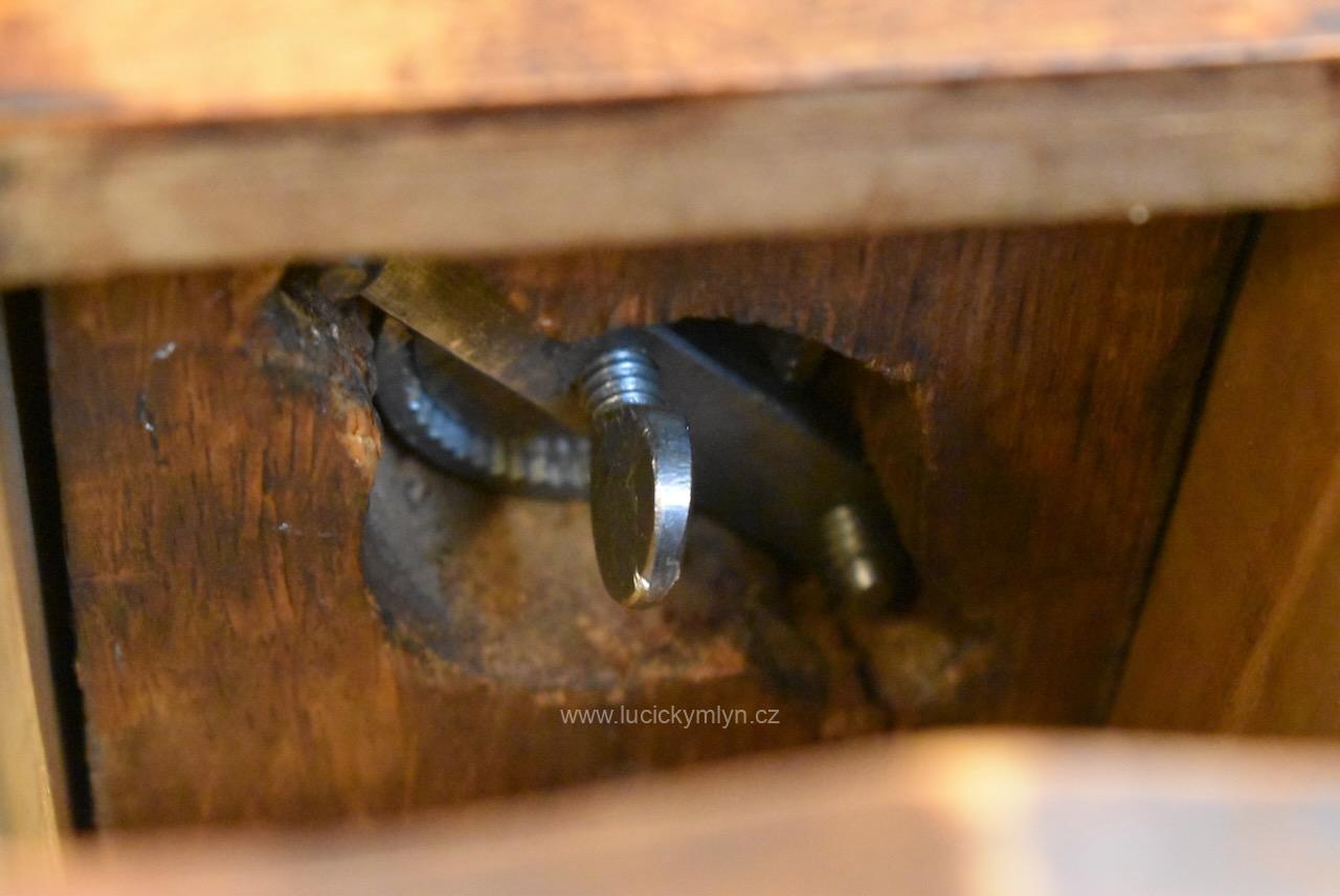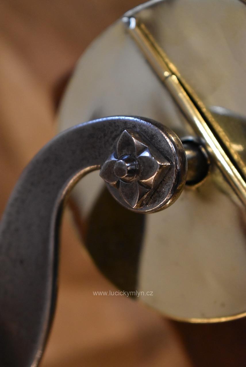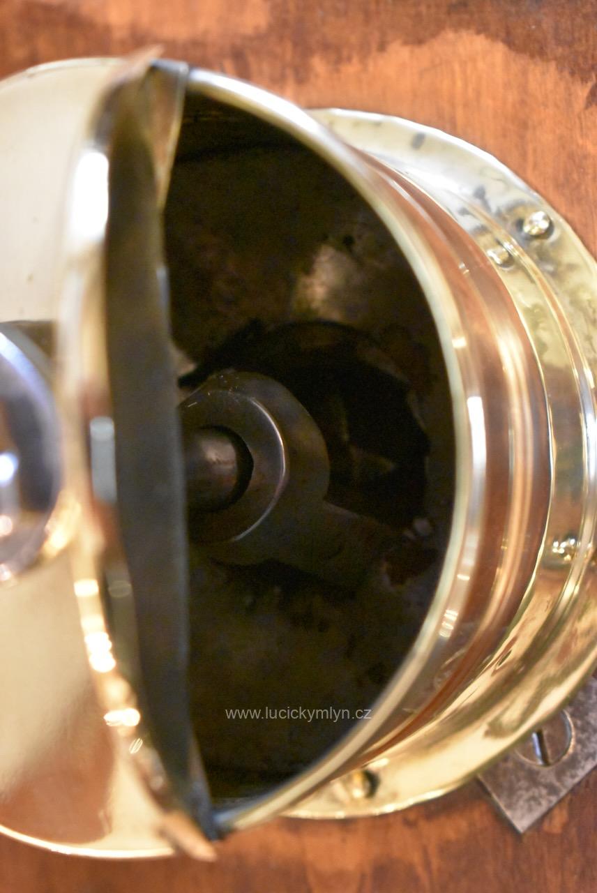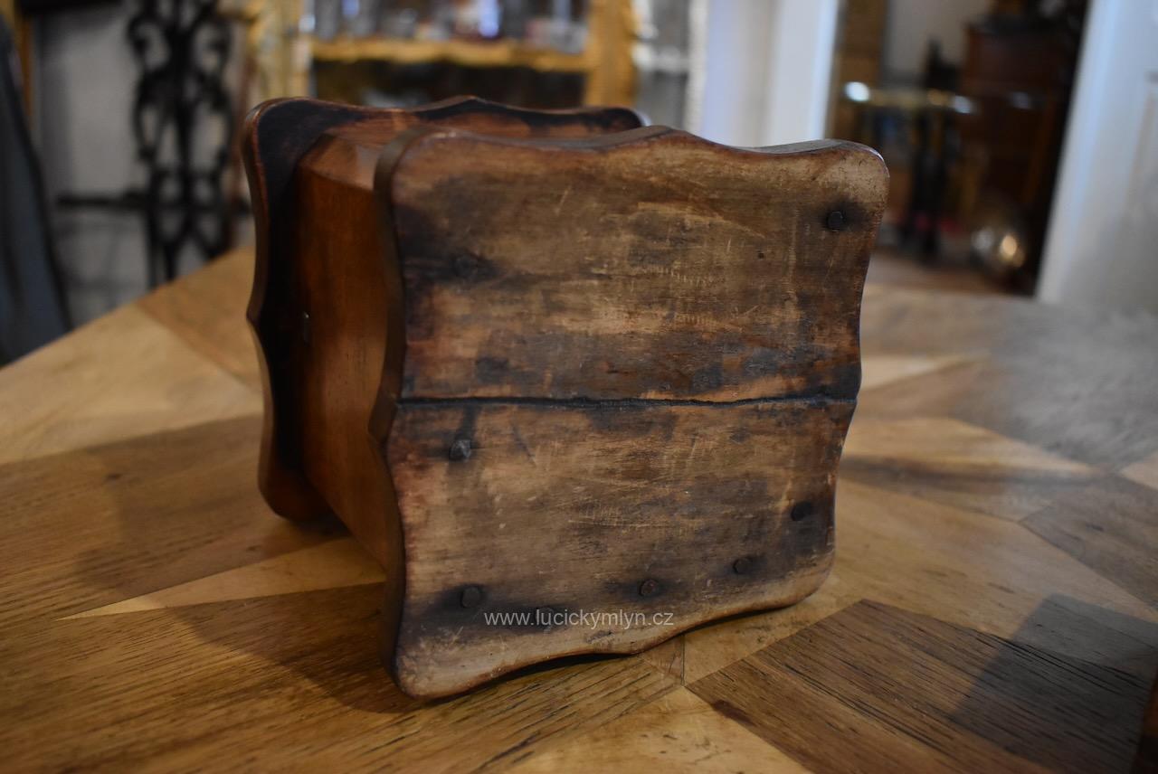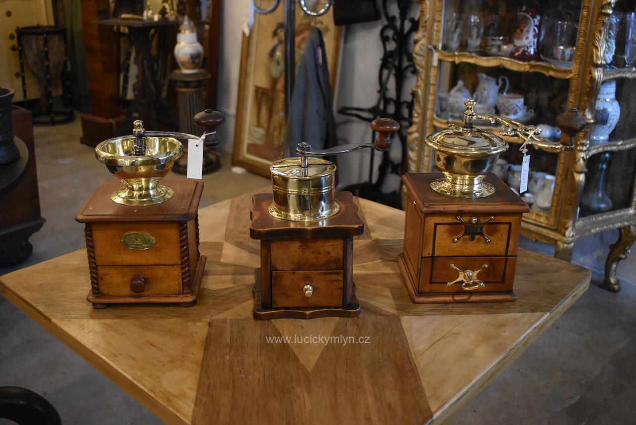 Měšťanský mlýnek se schránkou truhlářsky provedenou ve stylu vrcholného biedermeieru, pochází z období okolo roku 1840. Tento zachovalý a dodnes funkční mlýnek už mnohé pamatuje. Jeho ocelový strojek má truhlářsky vyrobenou schránku z mořeného masivního dřeva. Vzácně používaná válcová násypka z tlačené a leštěné mosazi má starší způsob plnícího otvoru, chráněný vzhůru odklápěcím víčkem. Hezká, esovitě tvarovaná a zámečnicky vyrobená klička, byla vybroušená z masivního železa. Ušlechtilé masivní dřevo kvádrové schránky, tvarově oživují rokokově vykrajované dílce vrchu a podstavy. Na čelní straně dole je zabudovaný šuplík s menší soustruženou knopkou z leštěné mosazi. Klička je zakončena hezky soustruženou úchytkou z masivního dřeva. Starožitný mlýnek i s plně funkčním mlecím mechanismem jsou po celkovém vyčištění a renovaci. Hezká sběratelská či kavárenská dekorace s krásnou letitou patinou je zcela autentickým předmětem, pocházejícím z bohatšího měšťanského prostředí.