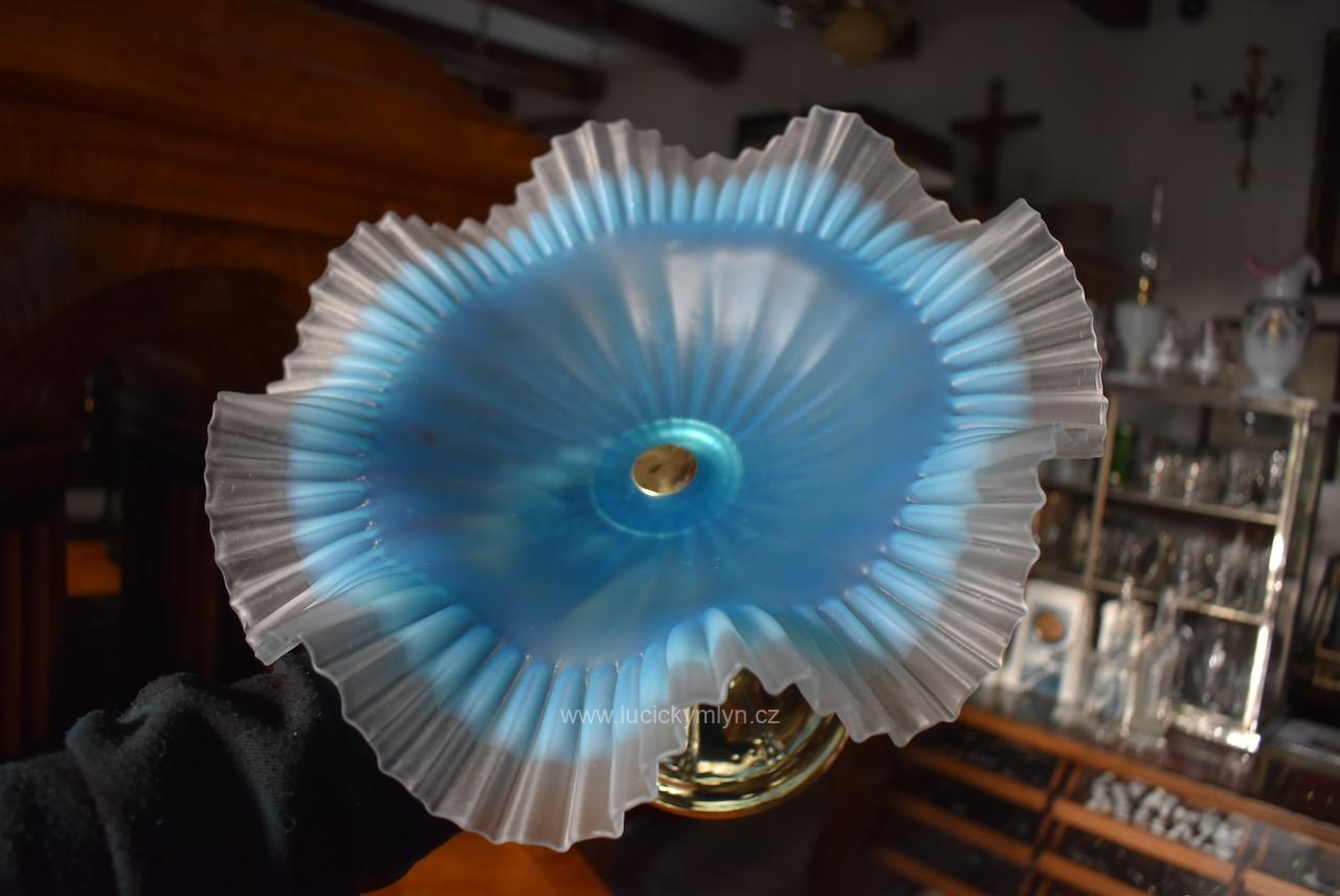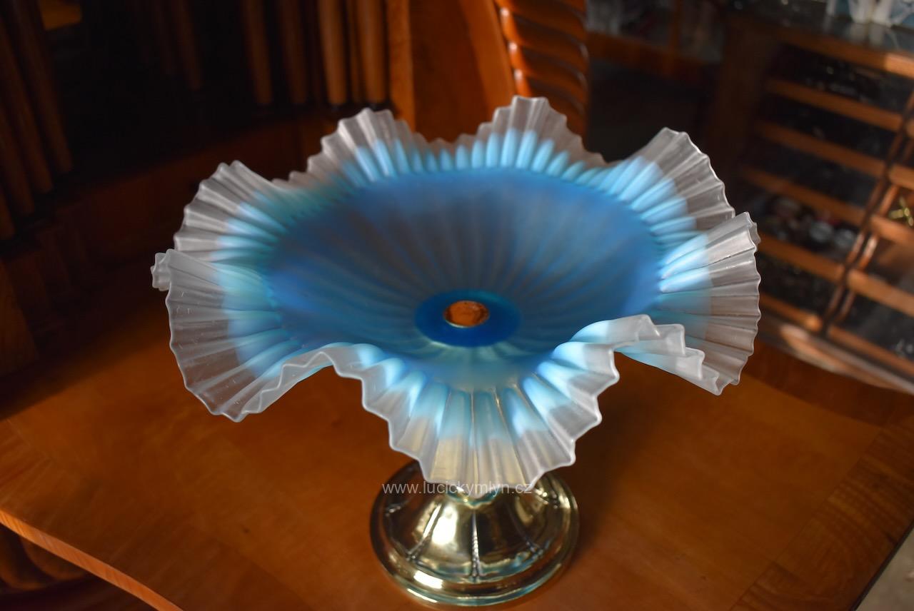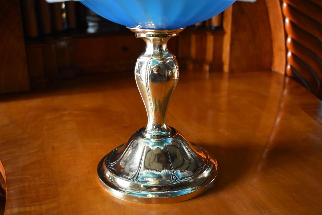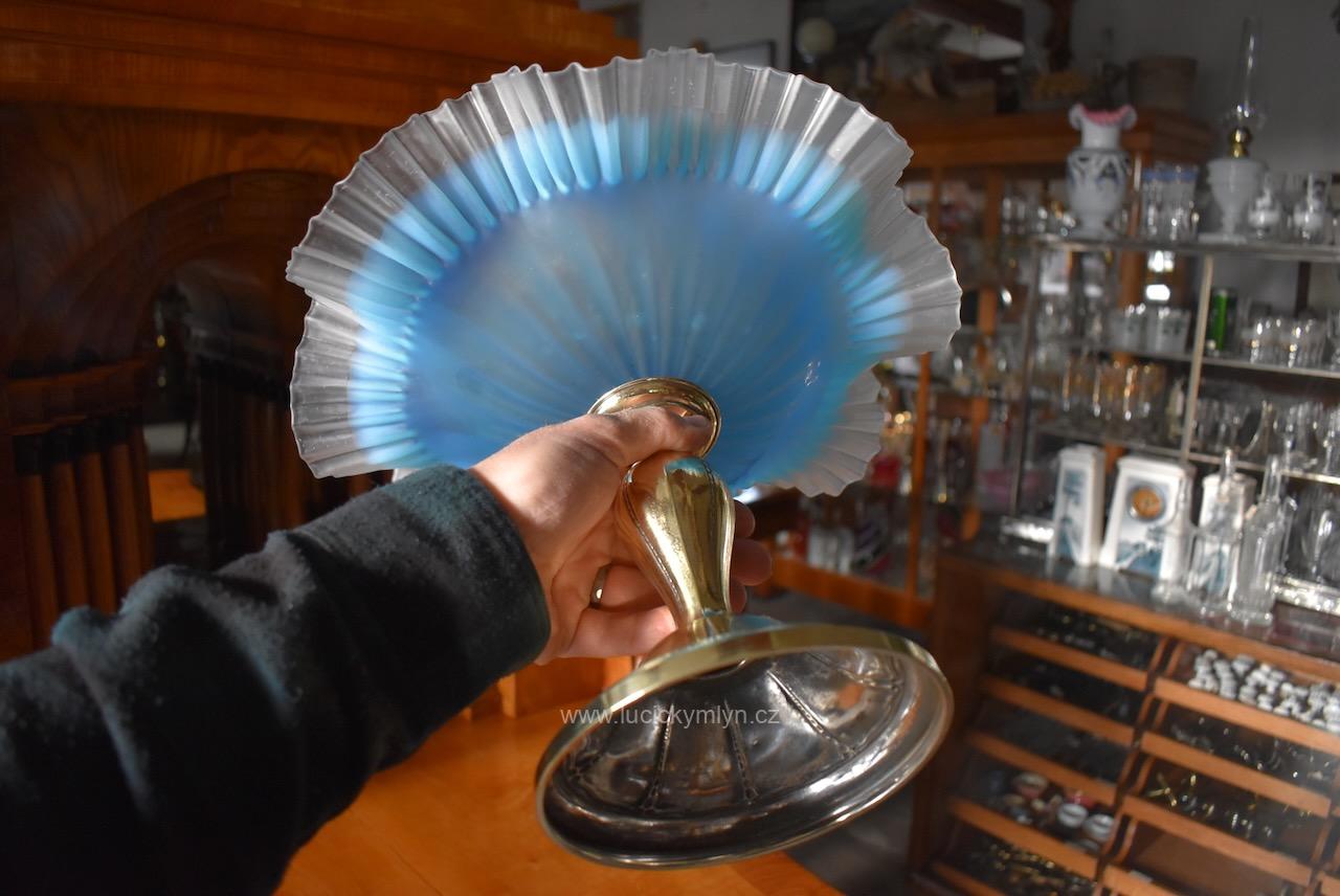 Krásný starožitný měšťanský secesní nástolec s hlubší okrasně ztvárněnou miskou z foukaného a modře tónovaného skla usazený na sloupkové podstavě z tlačené a zlatě leštěné mosazi – počátek 20. stol.