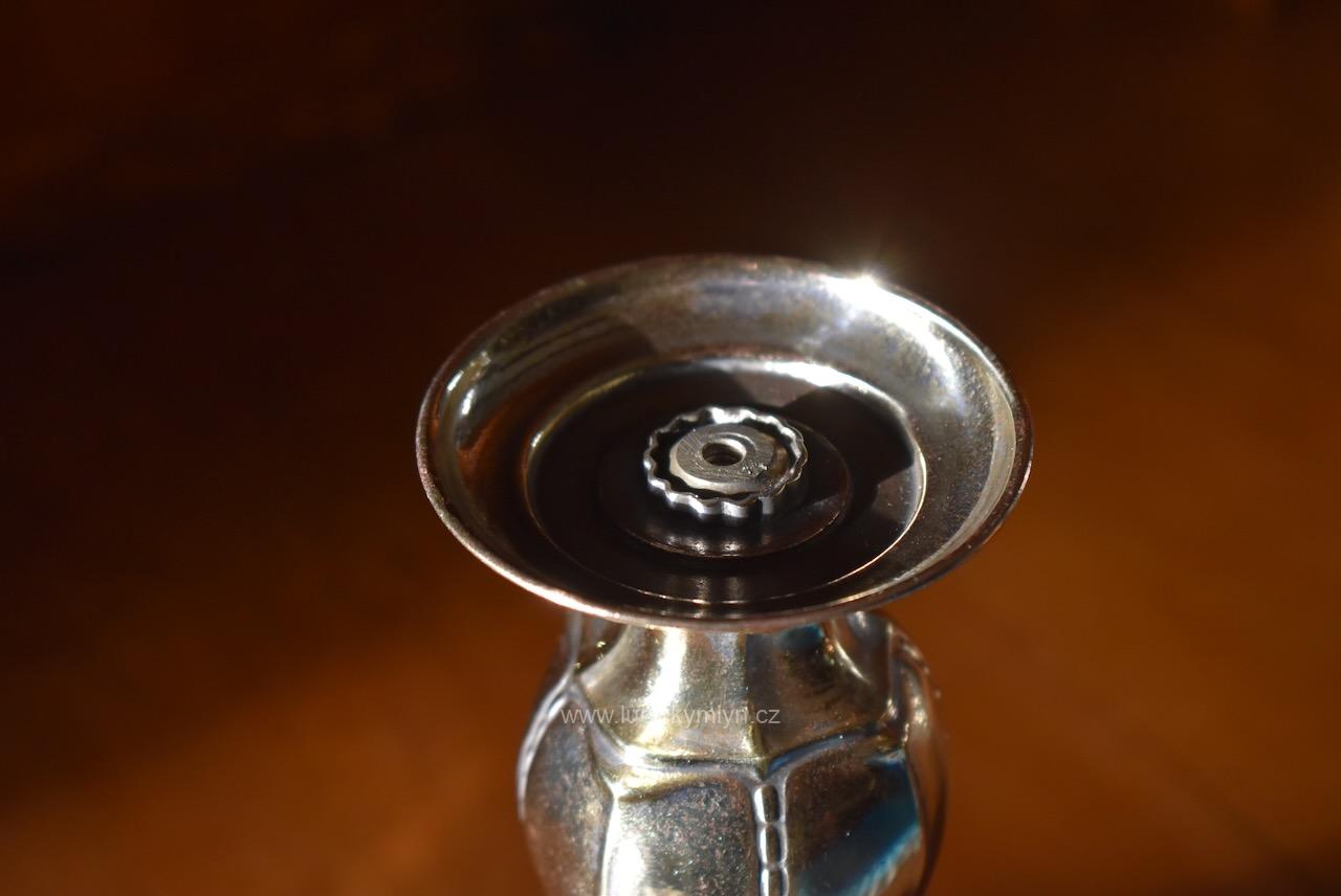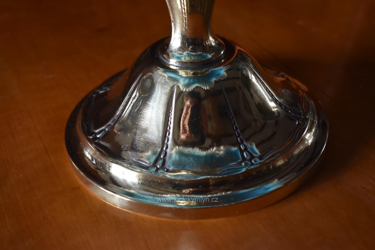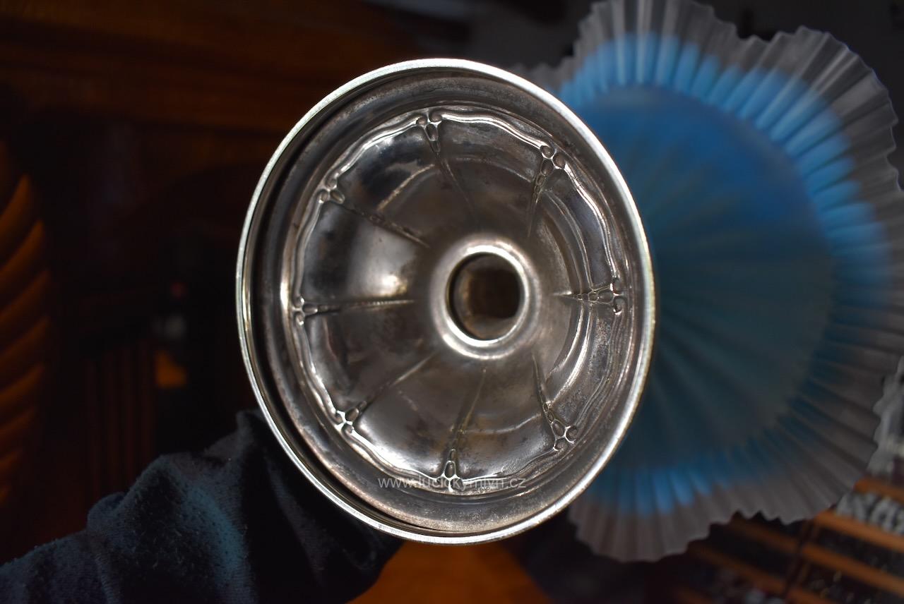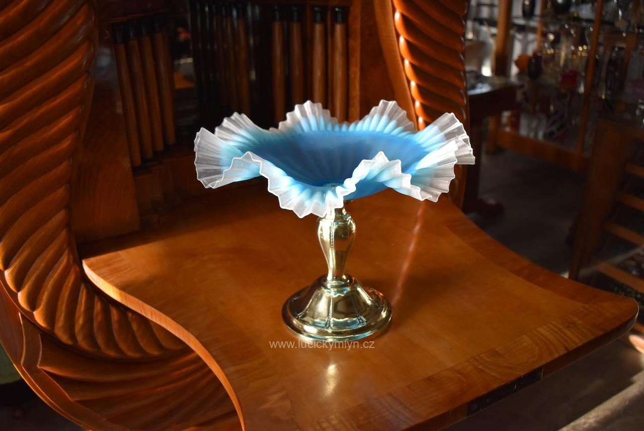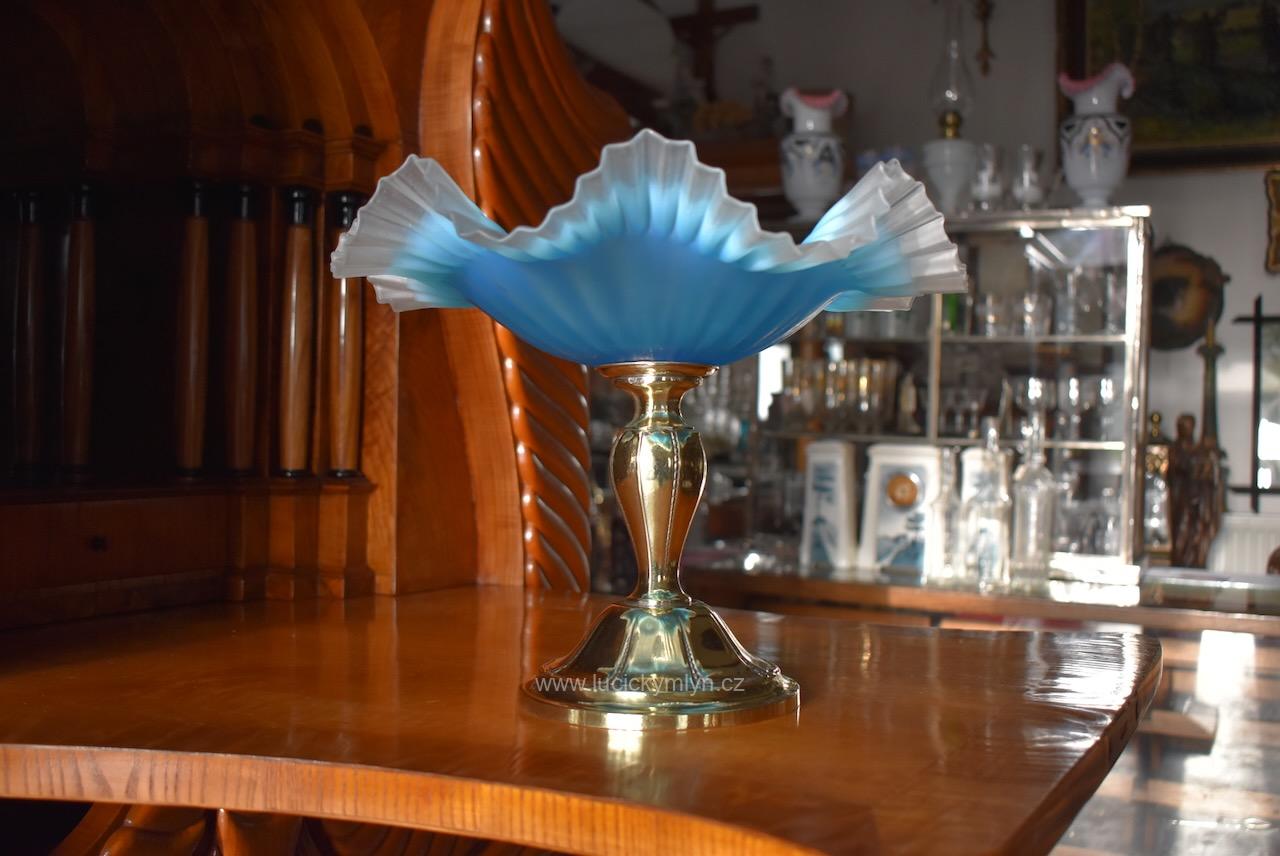 Krásný starožitný měšťanský secesní nástolec s hlubší okrasně ztvárněnou miskou z foukaného a modře tónovaného skla usazený na sloupkové podstavě z tlačené a zlatě leštěné mosazi – počátek 20. stol.