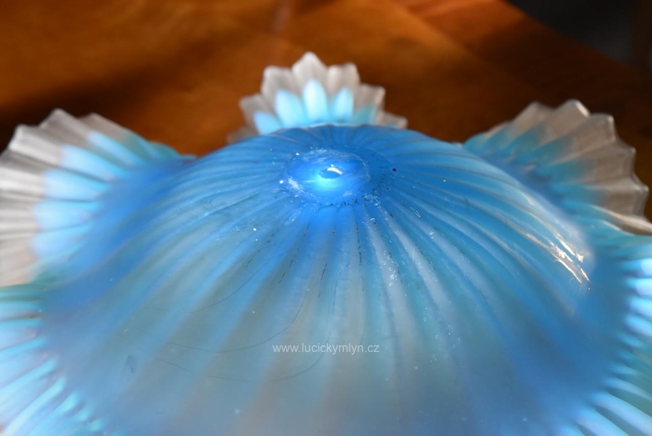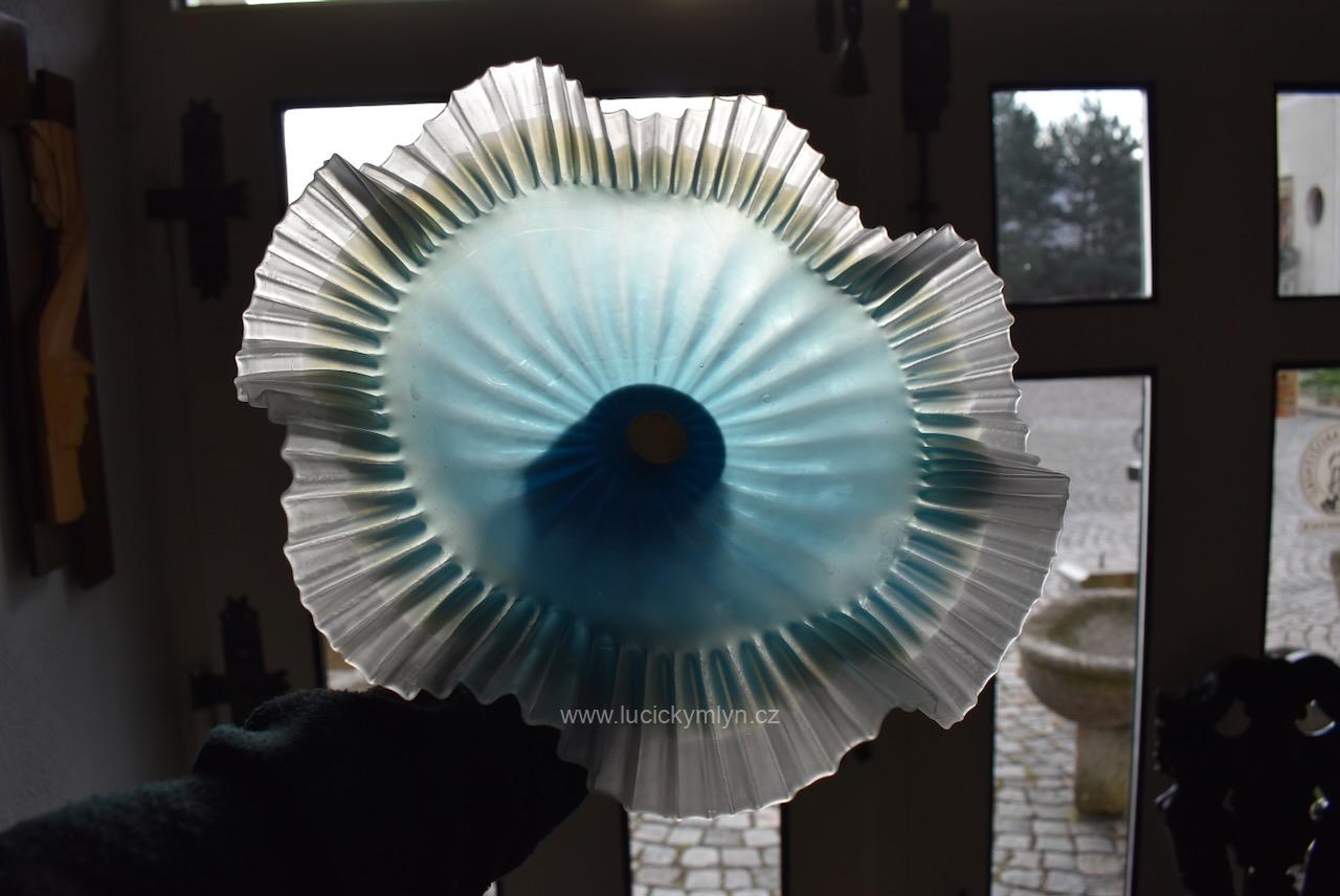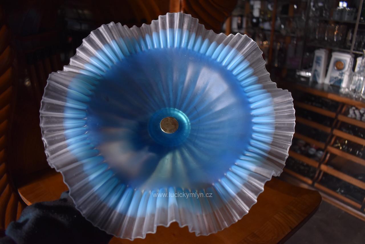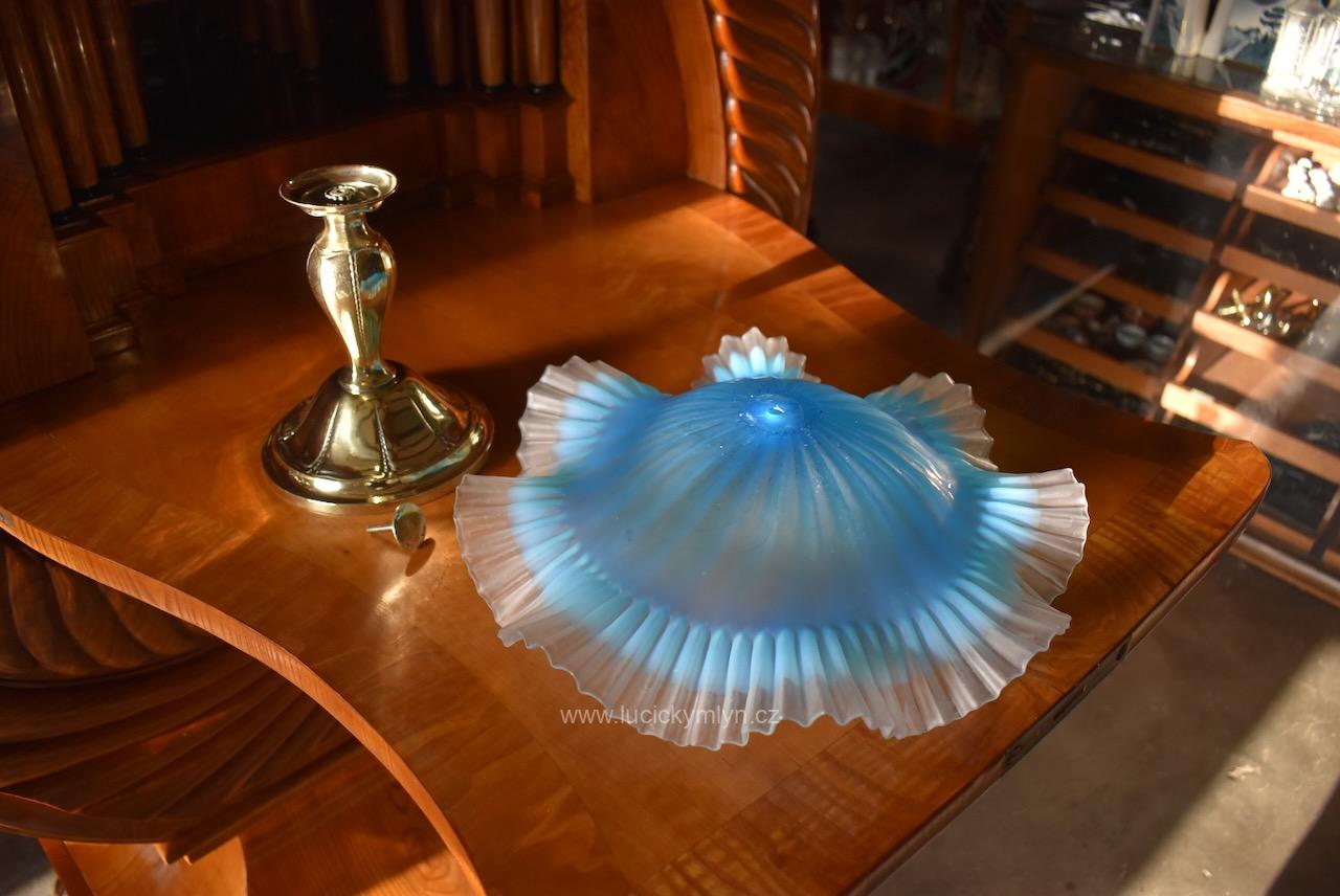 Hlubší talíř blankytně modrého nástolce byl nákladně vyroben z umělecky foukaného skla, jehož profilované ztvárnění ve tvaru květu, působivě rozšiřuje a půvabně zjemňuje, pečlivě a pravidelně skládaný i hluboce zvlněný okraj, typický zvláště pro horácké sklo. Sklo nástolce, tradičně užívá pozvolný přechod jemně tyrkysového středu ke zcela čirému, okrajově řasenému okraji. Náročně ztvárněné profilace i světle modré tónování, dodávají servírovacímu nástolci lehkost a při dopadu světla vytvářejí zajímavé odlesky. Povrch skla je z vnitřní strany jemně matovaný, z vnější pak hladší, takže barva působí sametově a zdůrazňuje plastické členění. Okrasný skleněný talíř je centrálně fixován na elegantní štíhlé nožce z leštěné mosazi, jejíž kulatá a stupňovitě členěná základna má sloupek obvodově skládaný z osmi symetrických částí tzv. kanelur, typických pro nástolce z přelomu 19. a 20. století. Sklo i mosazná podstava jsou v pěkném stavu. Mosazná podstava má nově přeleštěný zlatavý povrch. Secesní měšťanský nástolec již více jak sto let slouží jako stolní či skleníková dekorace. Do starožitného reprezentativního talíře můžeme s úspěchem aranžovat nejen voňavé ovoce, cukroví nebo oříšky, ale poslouží i jako samostatný dekorativní objekt na jídelním stole. Nástolec zaujme i na komodě či v prosklené vitríně, kde vynikne přitažlivá kombinace modře tónovaného a matného skla se zlatavým leskem poctivé mosazi.