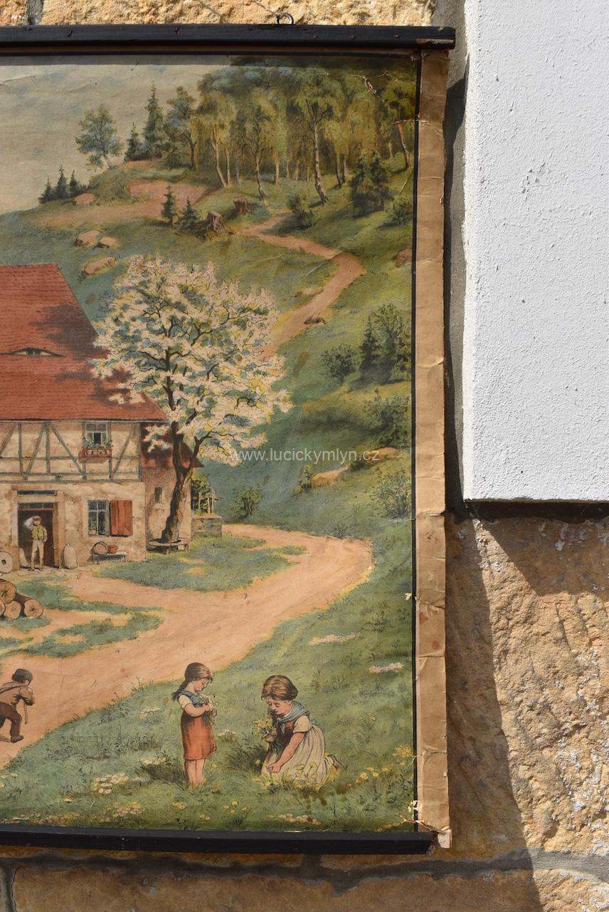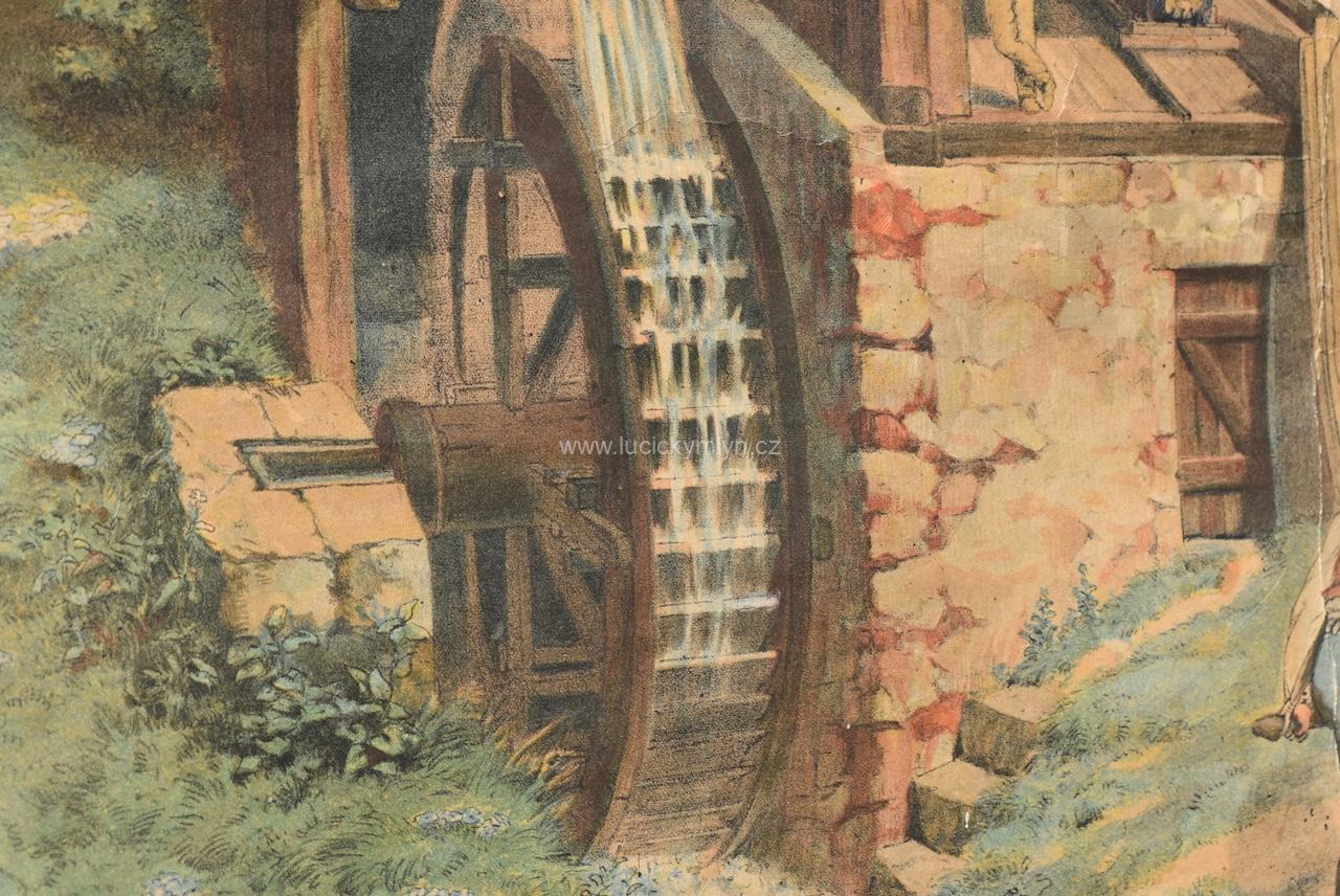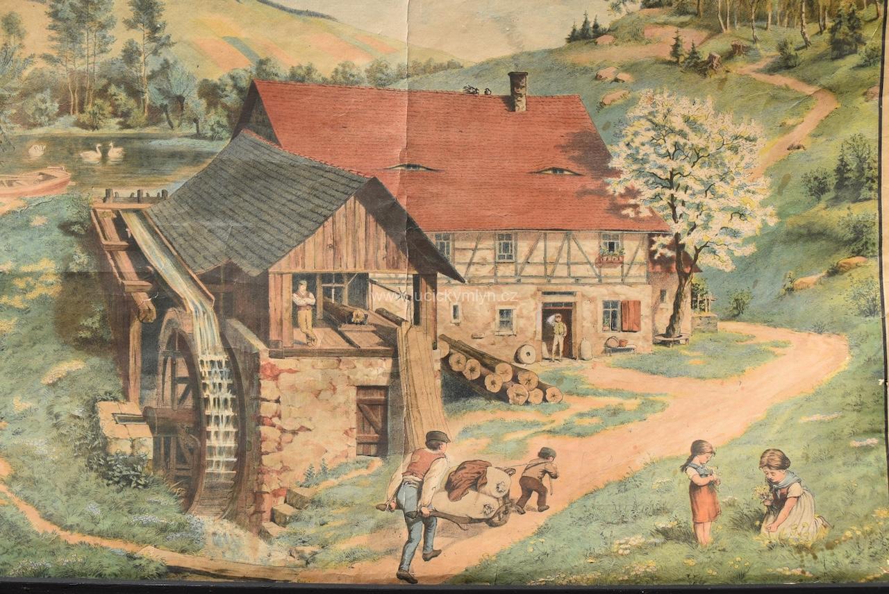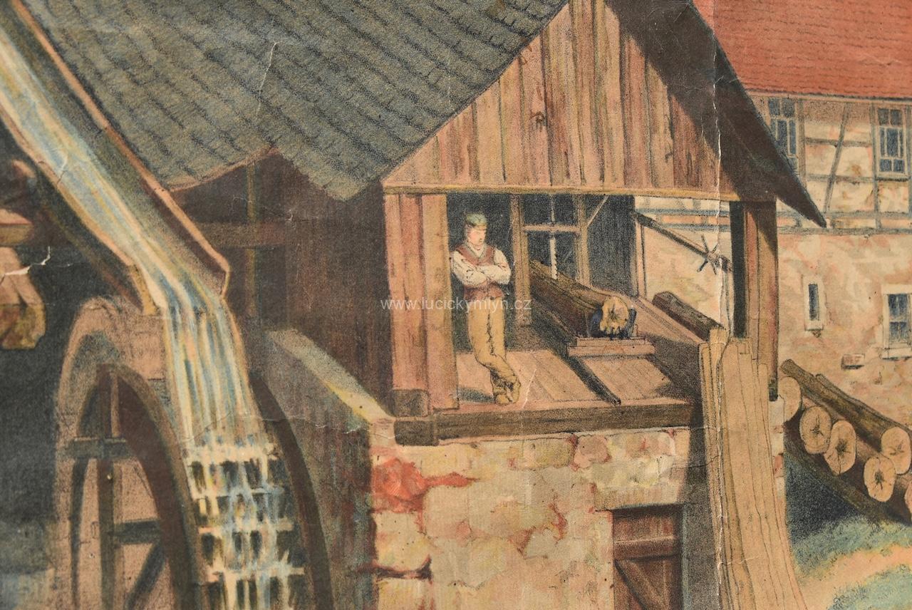 Starožitný tištěný plakát – vodní pila a mlýn – originální názorná učební pomůcka ještě z období starého Rakouska Uherska