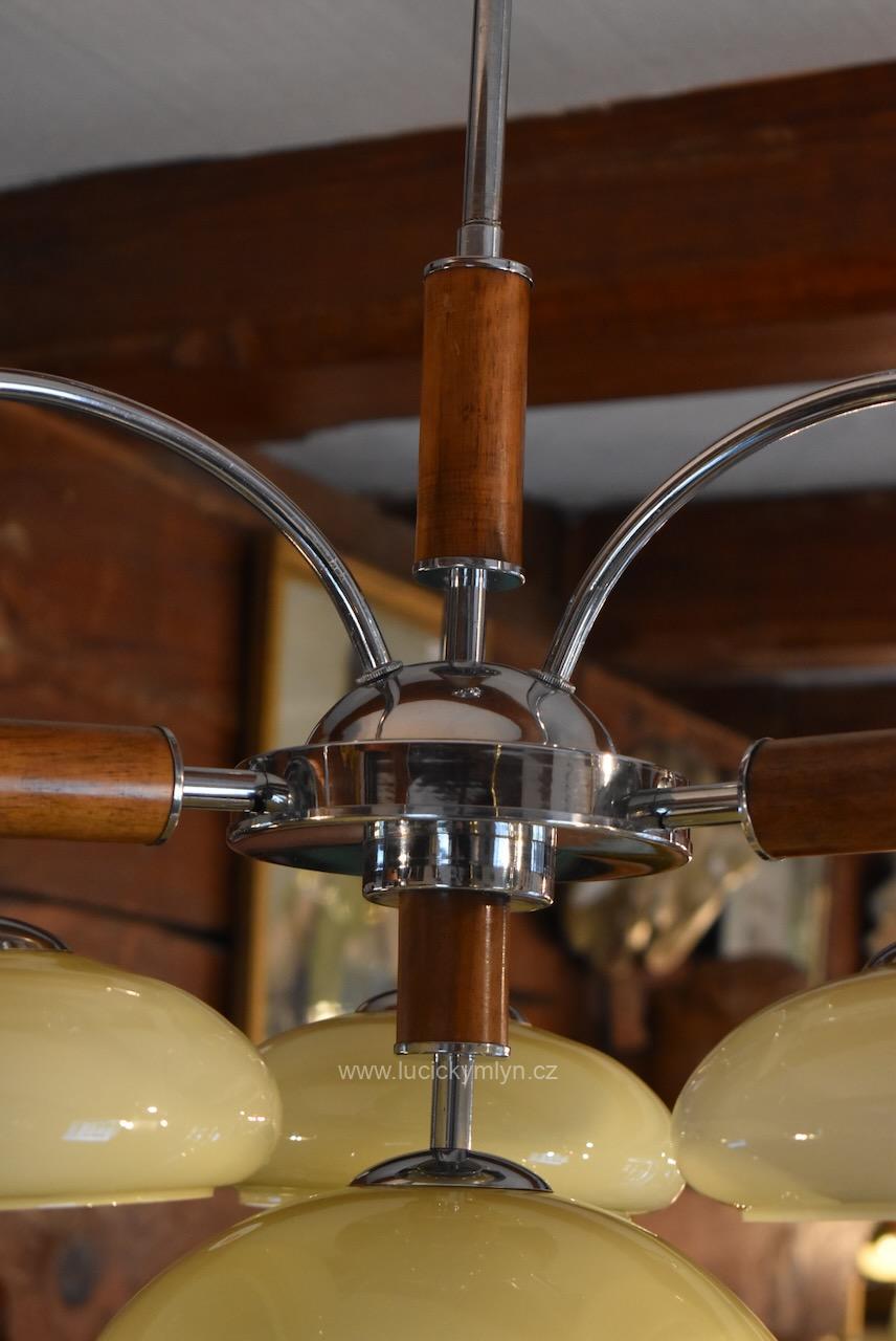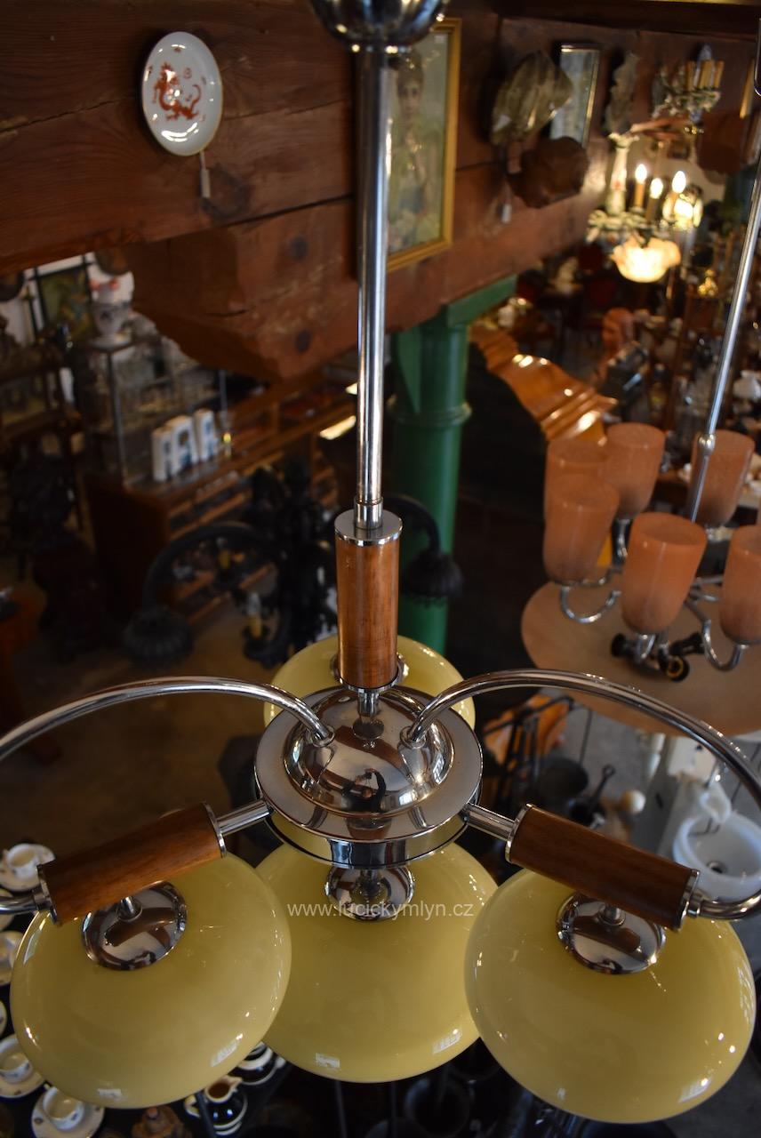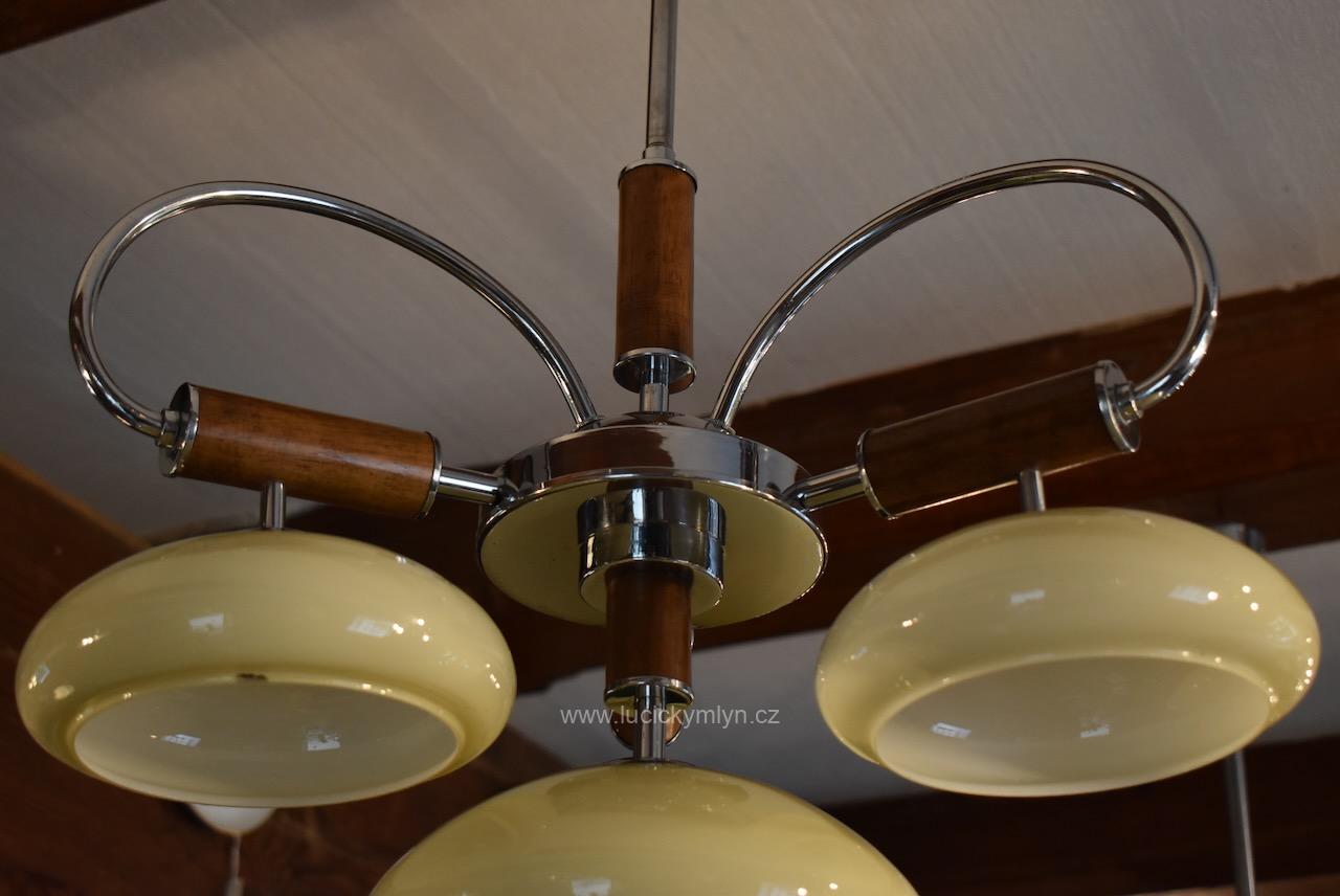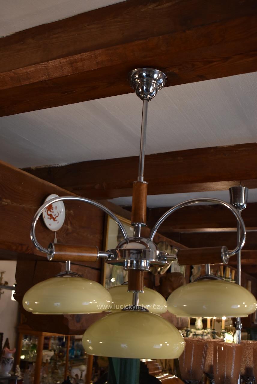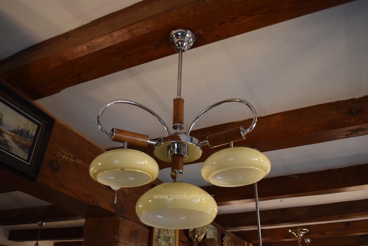 Elegantní lustr kombinuje leskle chromovanou konstrukci s obloukovými rameny a centrálně osazeným světlem s hladce soustruženými prvky z tmavě mořeného dřeva. Ze středového válce vybíhají tři nápadně klenutá ramena, která vynáší nízko posazená misková stínidla z krémově nažloutlého, vrstveného skla. Stínidla směrují světlo především dolů, takže je svítidlo ideální nad jídelní stůl či do obývacího pokoje, kde vytvoří rovnoměrné a příjemně měkké osvětlení. Závěsný prvorepublikový lustr pochází z bohatšího měšťanského prostředí a byl velmi kvalitně vyroben v období kolem 30.–40. let 20. století. Starožitné světlo je po celkové renovaci, včetně nové elektroinstalace, a je připravené k bezpečnému každodennímu používání. Nadčasové spojení chromu, ušlechtilého dřeva a jemně tónovaného skla vždy dobře ladí jak s prvorepublikovým nábytkem ve stylu art-deco, tak s dnešními minimalistickými či skandinávskými interiéry.