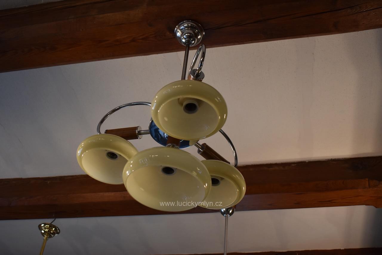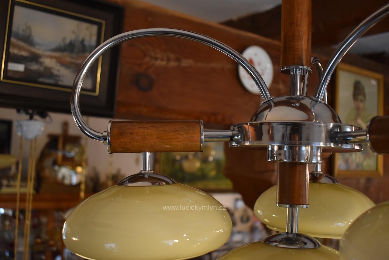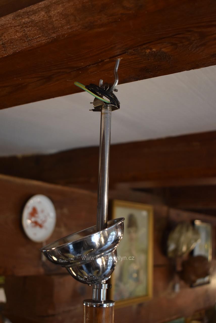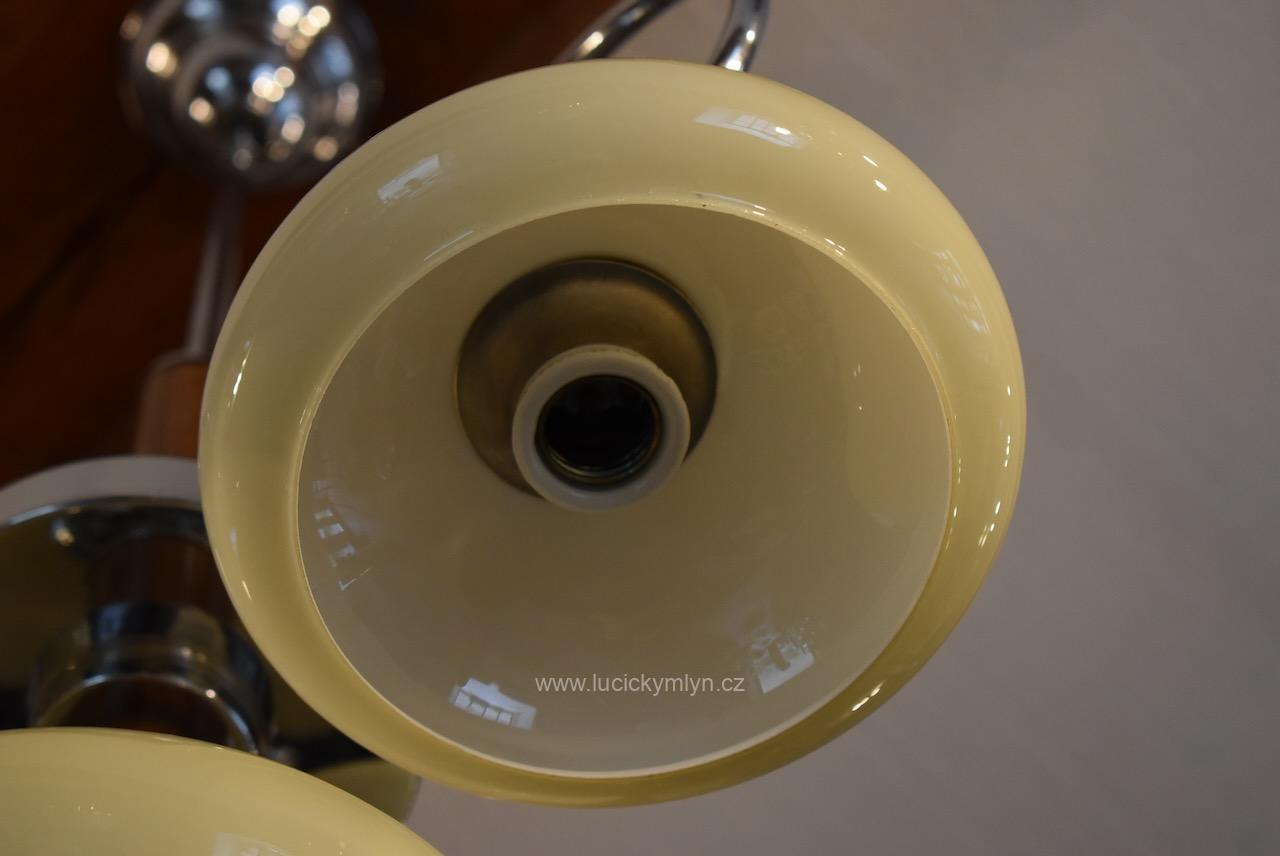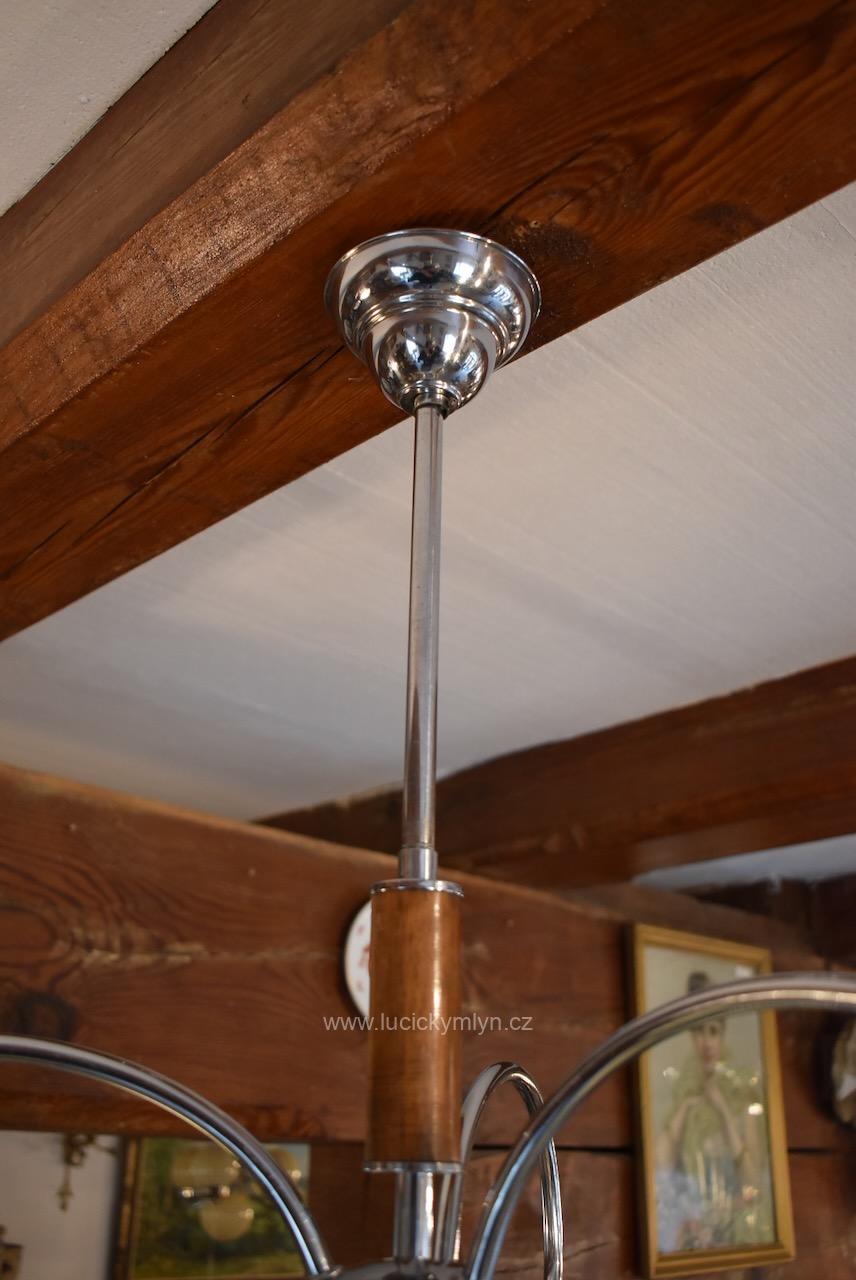 Elegantní lustr kombinuje leskle chromovanou konstrukci s obloukovými rameny a centrálně osazeným světlem s hladce soustruženými prvky z tmavě mořeného dřeva. Ze středového válce vybíhají tři nápadně klenutá ramena, která vynáší nízko posazená misková stínidla z krémově nažloutlého, vrstveného skla. Stínidla směrují světlo především dolů, takže je svítidlo ideální nad jídelní stůl či do obývacího pokoje, kde vytvoří rovnoměrné a příjemně měkké osvětlení. Závěsný prvorepublikový lustr pochází z bohatšího měšťanského prostředí a byl velmi kvalitně vyroben v období kolem 30.–40. let 20. století. Starožitné světlo je po celkové renovaci, včetně nové elektroinstalace, a je připravené k bezpečnému každodennímu používání. Nadčasové spojení chromu, ušlechtilého dřeva a jemně tónovaného skla vždy dobře ladí jak s prvorepublikovým nábytkem ve stylu art-deco, tak s dnešními minimalistickými či skandinávskými interiéry.