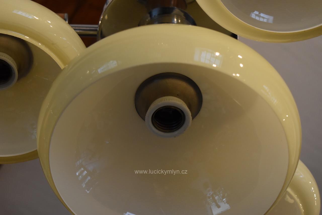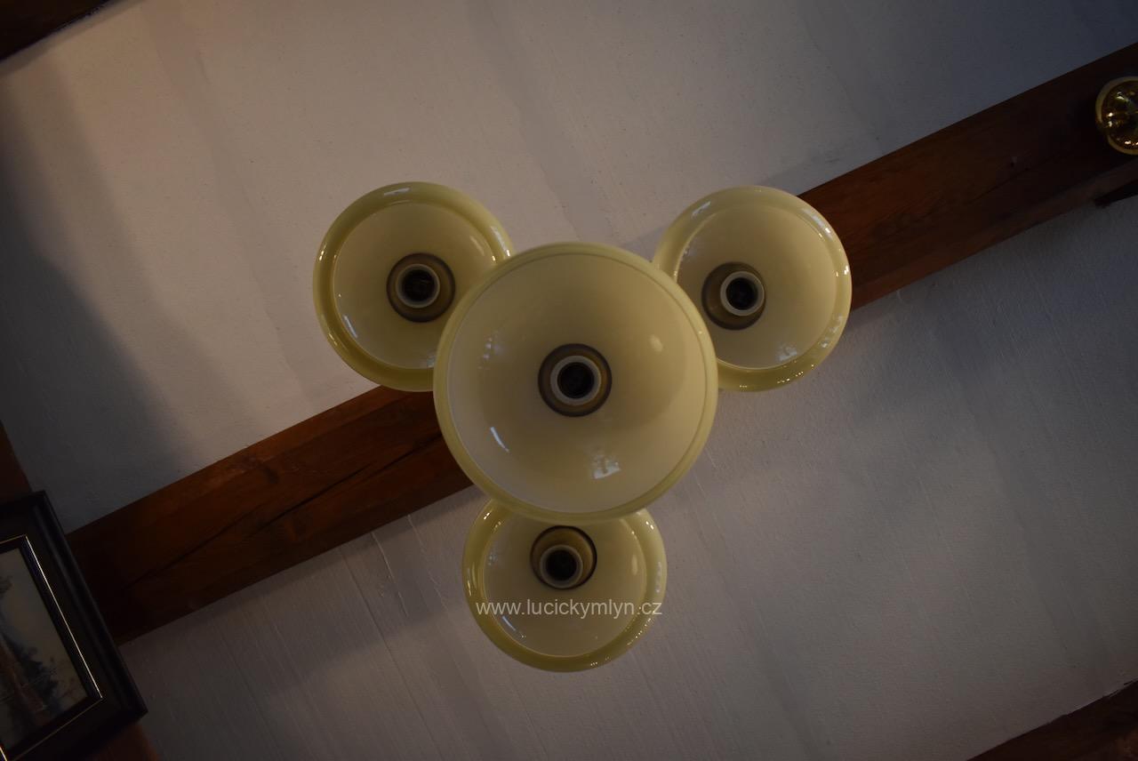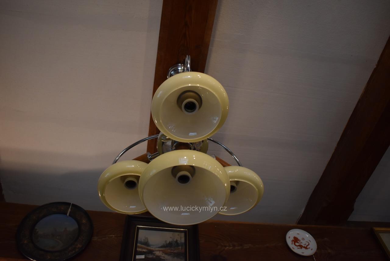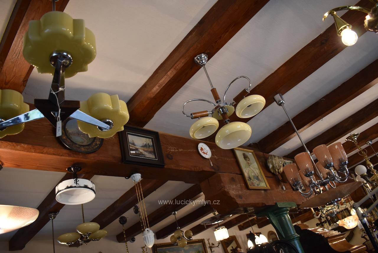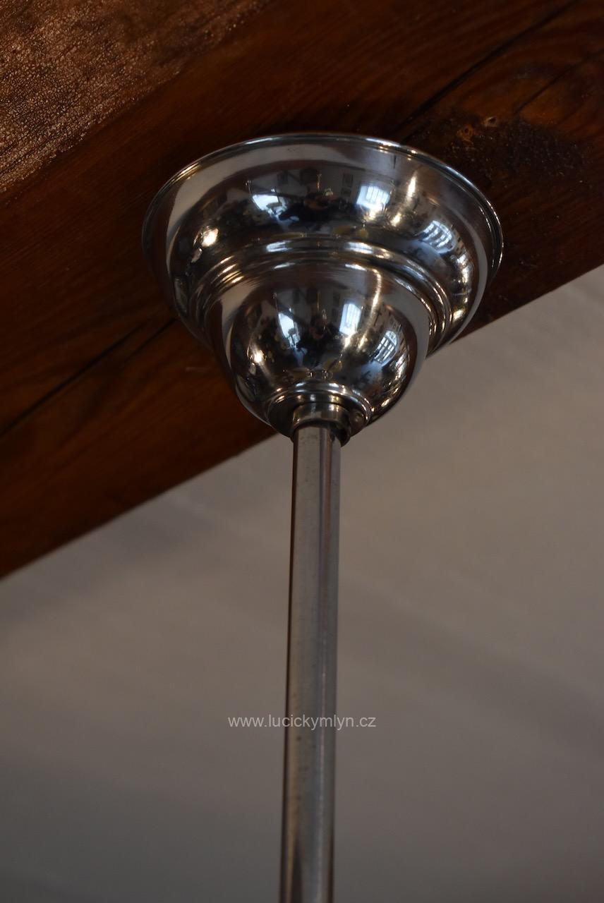 Elegantní lustr kombinuje leskle chromovanou konstrukci s obloukovými rameny a centrálně osazeným světlem s hladce soustruženými prvky z tmavě mořeného dřeva. Ze středového válce vybíhají tři nápadně klenutá ramena, která vynáší nízko posazená misková stínidla z krémově nažloutlého, vrstveného skla. Stínidla směrují světlo především dolů, takže je svítidlo ideální nad jídelní stůl či do obývacího pokoje, kde vytvoří rovnoměrné a příjemně měkké osvětlení. Závěsný prvorepublikový lustr pochází z bohatšího měšťanského prostředí a byl velmi kvalitně vyroben v období kolem 30.–40. let 20. století. Starožitné světlo je po celkové renovaci, včetně nové elektroinstalace, a je připravené k bezpečnému každodennímu používání. Nadčasové spojení chromu, ušlechtilého dřeva a jemně tónovaného skla vždy dobře ladí jak s prvorepublikovým nábytkem ve stylu art-deco, tak s dnešními minimalistickými či skandinávskými interiéry.