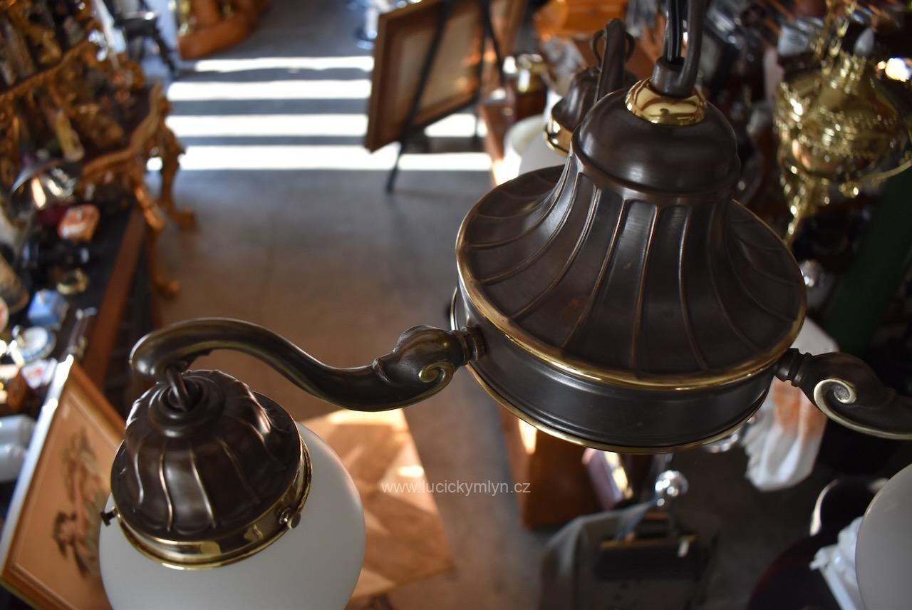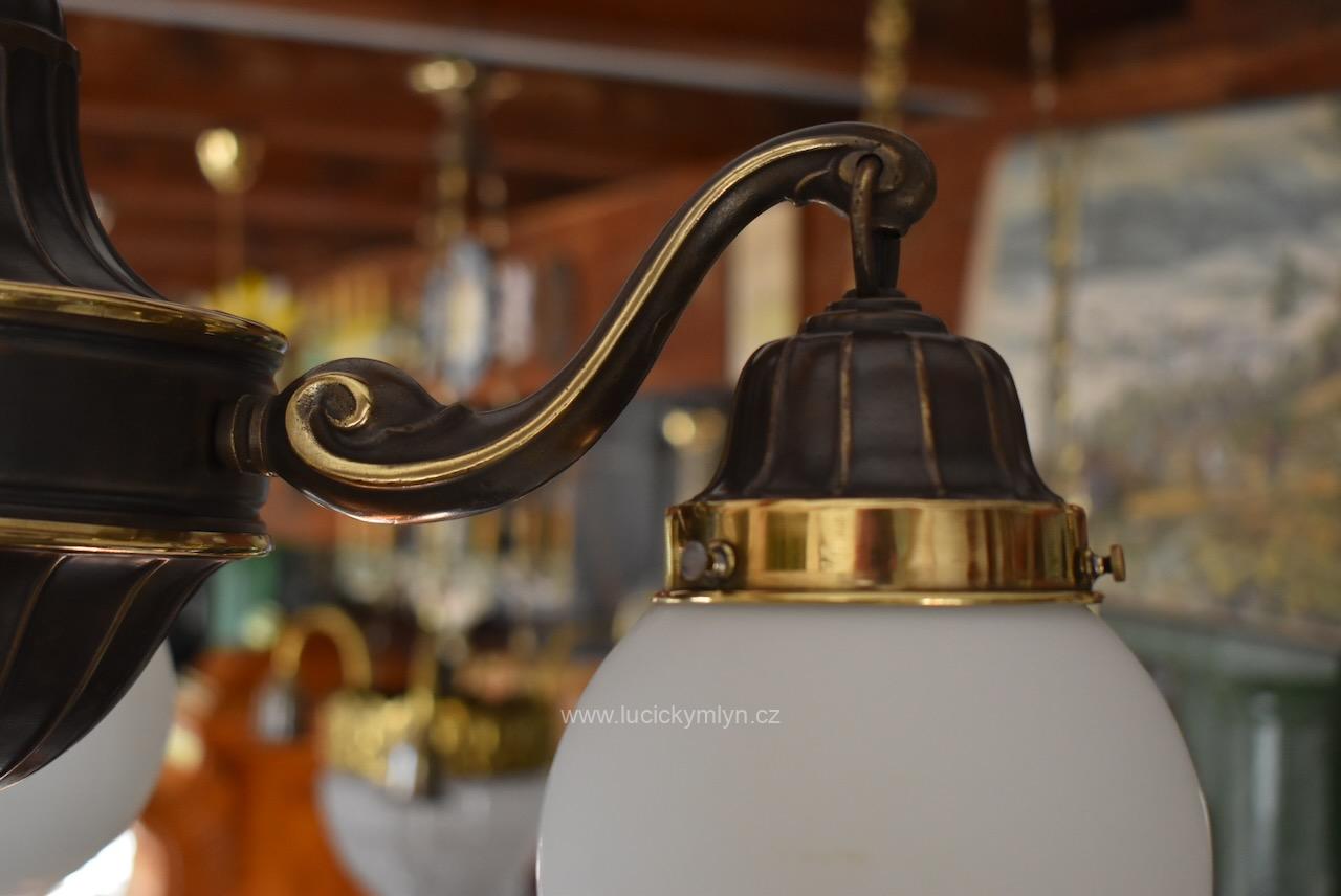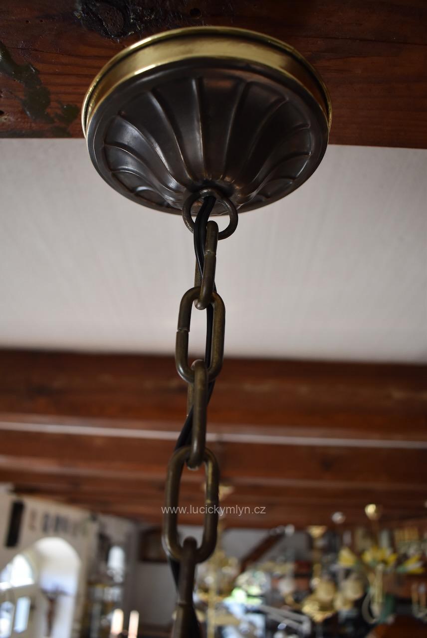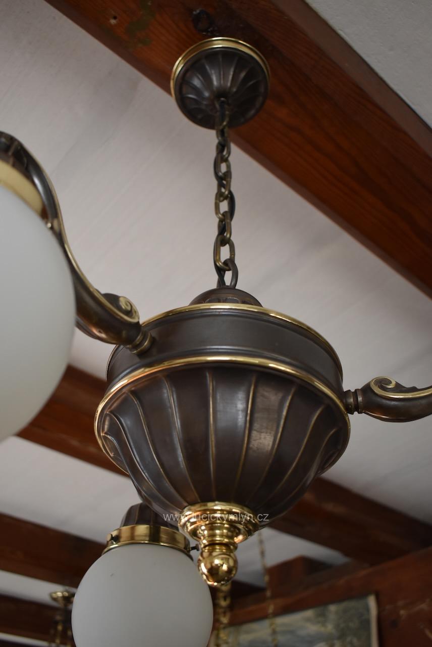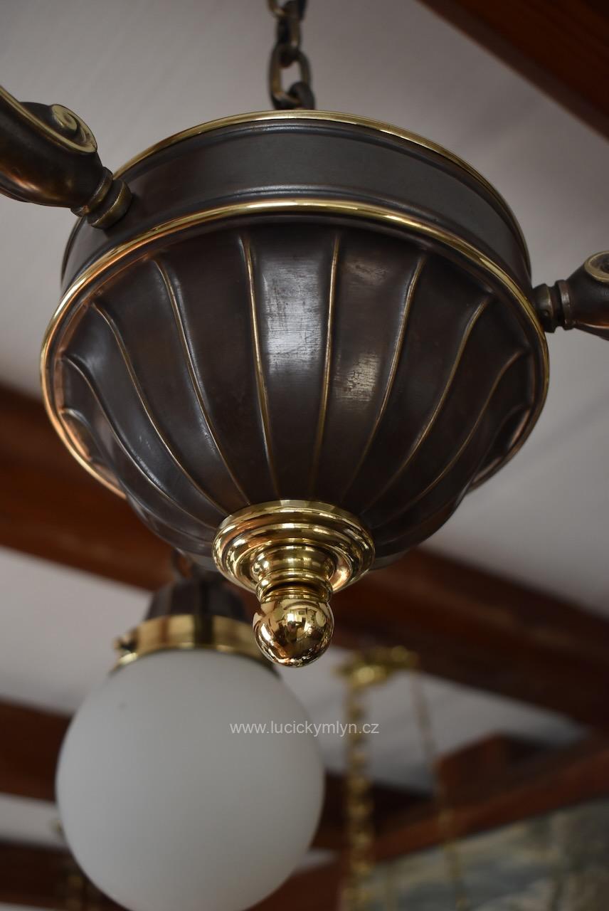 Prvorepublikový měšťanský lustr má plášť okrášlený pravidelně členěným kanelovaným vzorem. Závěsný lustr s delším mosazným řetězem má nahoře osazenou misku z tlačené a profilované mosazi, která slouží k zakrytí závěsného háku a el. přívodu. Lustr byl nákladně zhotovený z ozdobně tlačeného a místy proleštěného mosazného plechu a osazený stínícími koulemi z mléčného skla s matným povrchem. Mosazný povrch svítidla byl patinován na vzhled starého bronzu. Originální světlo pochází z Čech a bylo pasířsky vyrobeno okolo r. 1920. Plasticky vystouplá výzdoba patinovaného lustru, byla citlivě umocněna zlatým proleštěním. Klasicky tvarovaná esovitá ramena s motivem rozviliny, elegantně vynášejí zavěšené stínící koule. Svítidlo je zavěšeno na pevném mosazném řetězu. Lustr je po celkové renovaci včetně nově provedené elektroinstalace.
