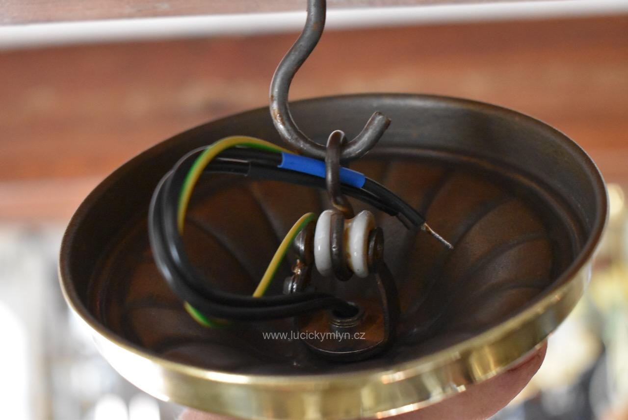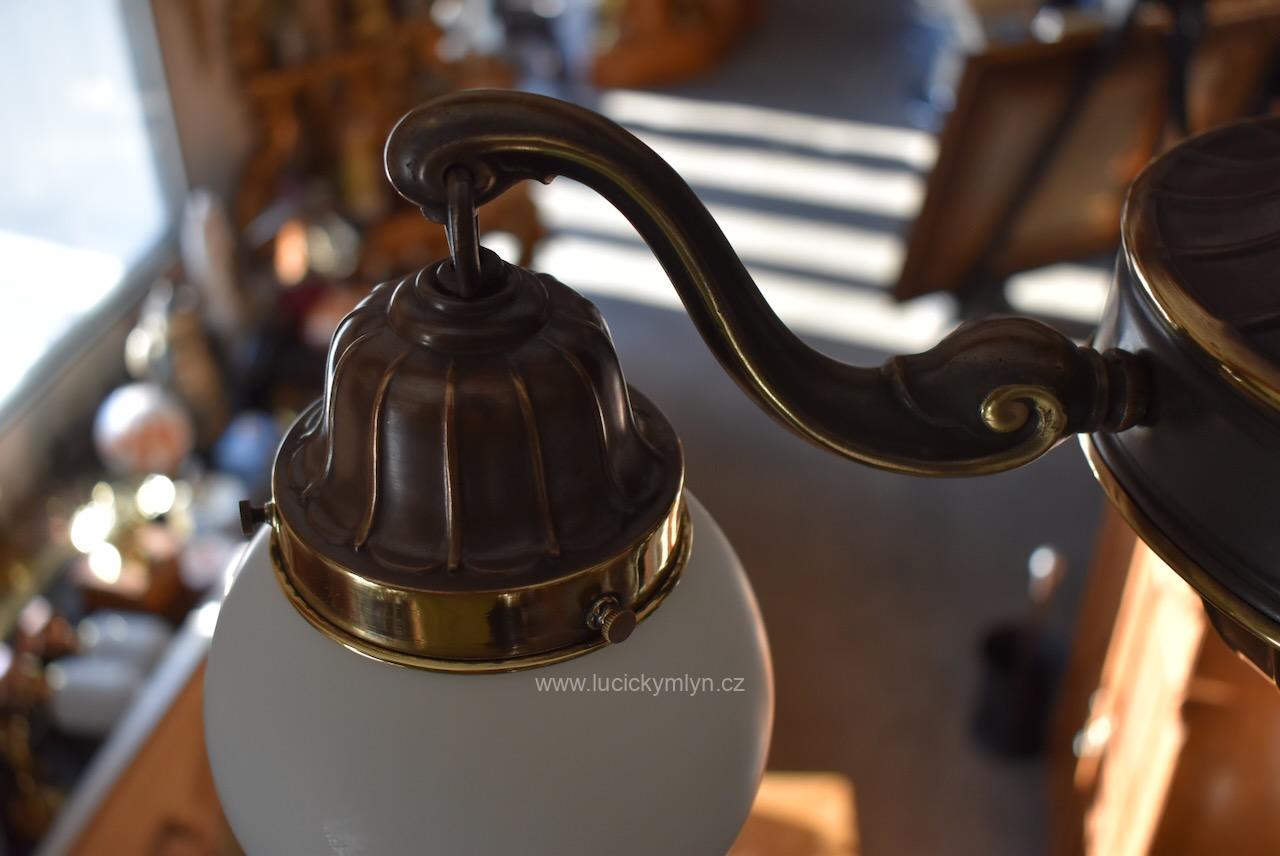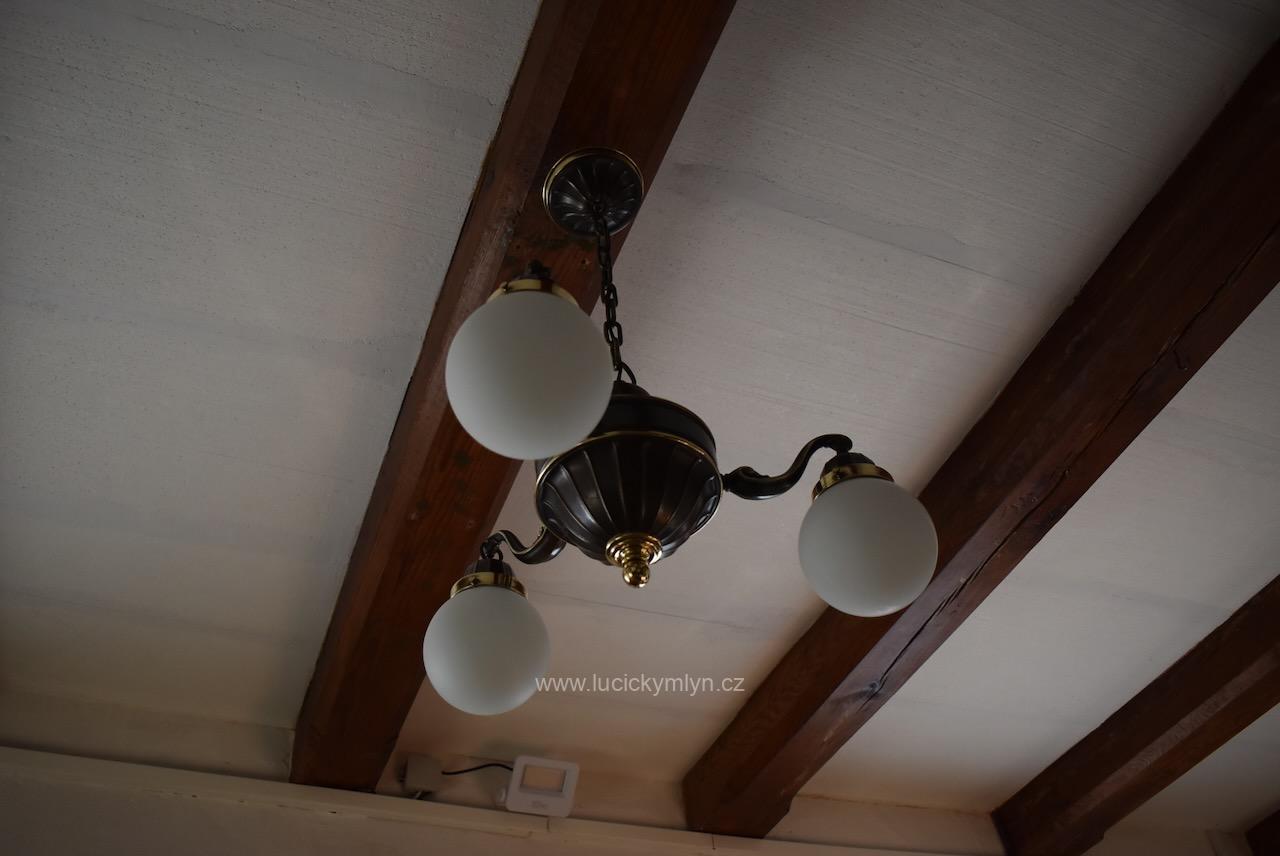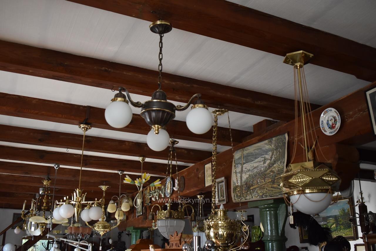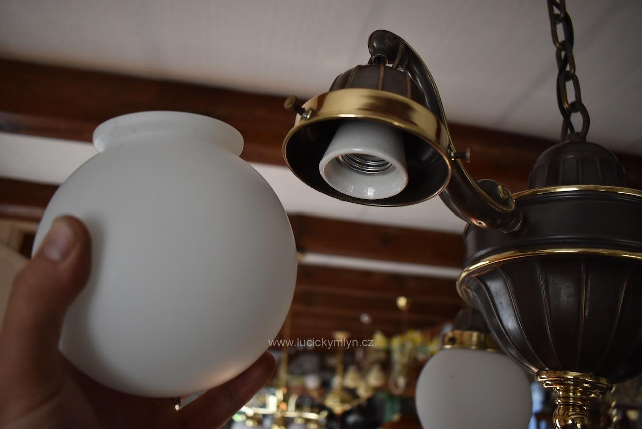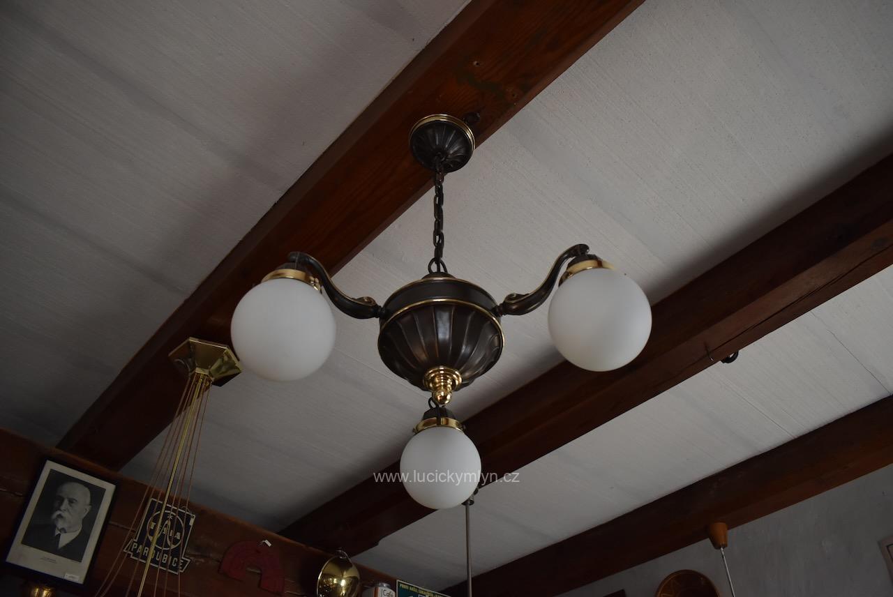 Prvorepublikový měšťanský lustr má plášť okrášlený pravidelně členěným kanelovaným vzorem. Závěsný lustr s delším mosazným řetězem má nahoře osazenou misku z tlačené a profilované mosazi, která slouží k zakrytí závěsného háku a el. přívodu. Lustr byl nákladně zhotovený z ozdobně tlačeného a místy proleštěného mosazného plechu a osazený stínícími koulemi z mléčného skla s matným povrchem. Mosazný povrch svítidla byl patinován na vzhled starého bronzu. Originální světlo pochází z Čech a bylo pasířsky vyrobeno okolo r. 1920. Plasticky vystouplá výzdoba patinovaného lustru, byla citlivě umocněna zlatým proleštěním. Klasicky tvarovaná esovitá ramena s motivem rozviliny, elegantně vynášejí zavěšené stínící koule. Svítidlo je zavěšeno na pevném mosazném řetězu. Lustr je po celkové renovaci včetně nově provedené elektroinstalace.