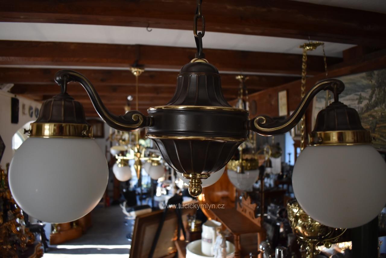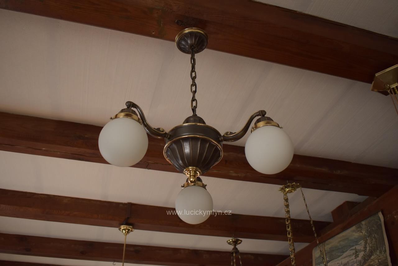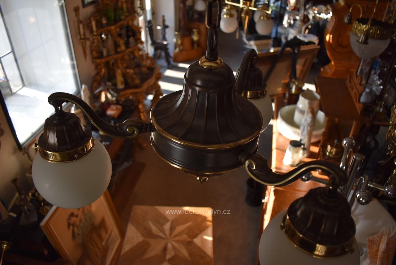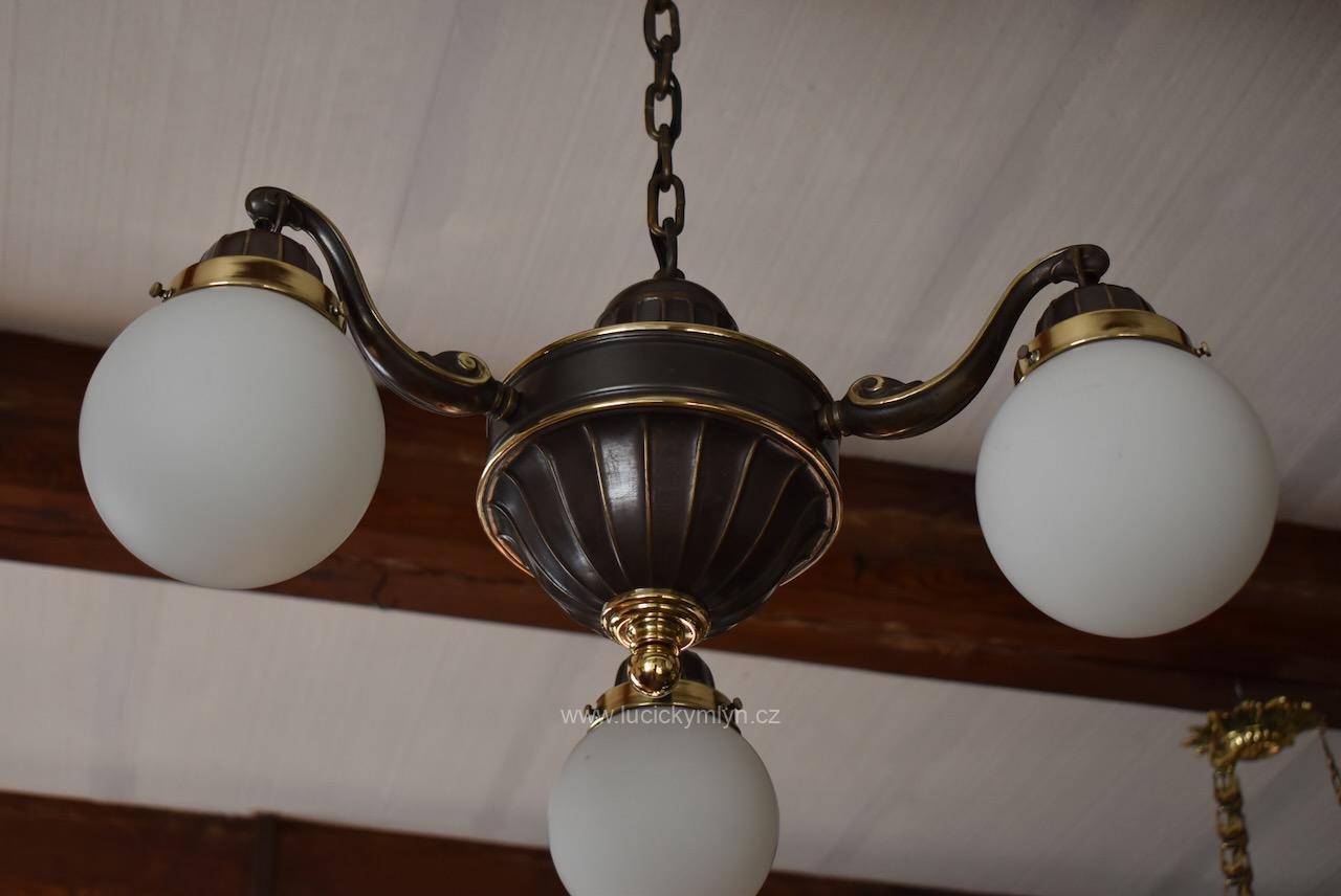 Středně velký starožitný měšťanský tří-ramenný lustr pasířsky vyrobený z tlačené a na tmavý bronz patinované, jen místy zlatě proleštěné mosazi – ztvárněno v historizujícím stylu po roce 1920