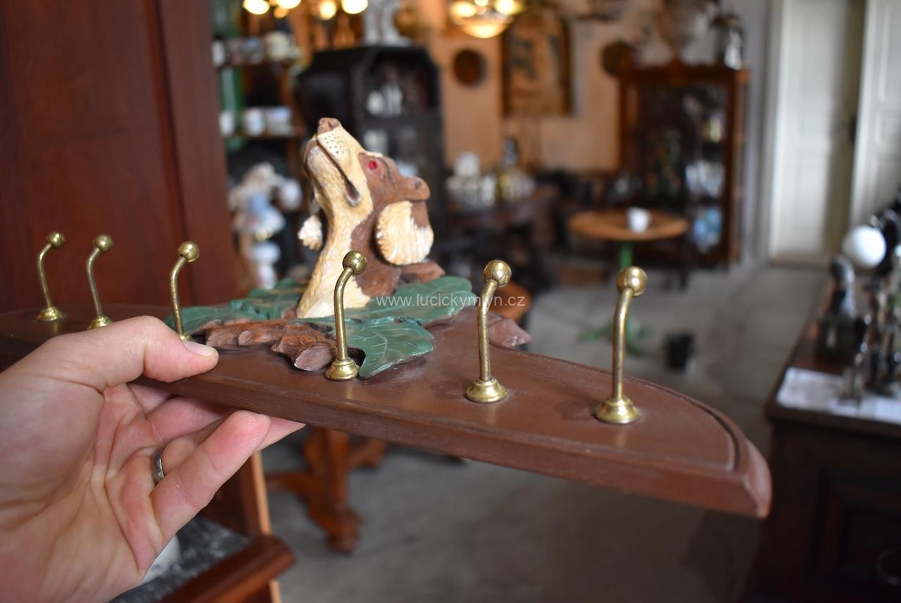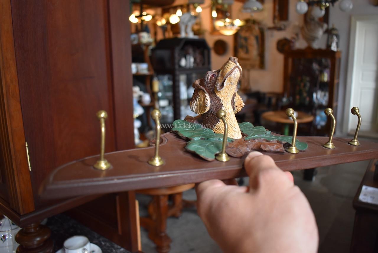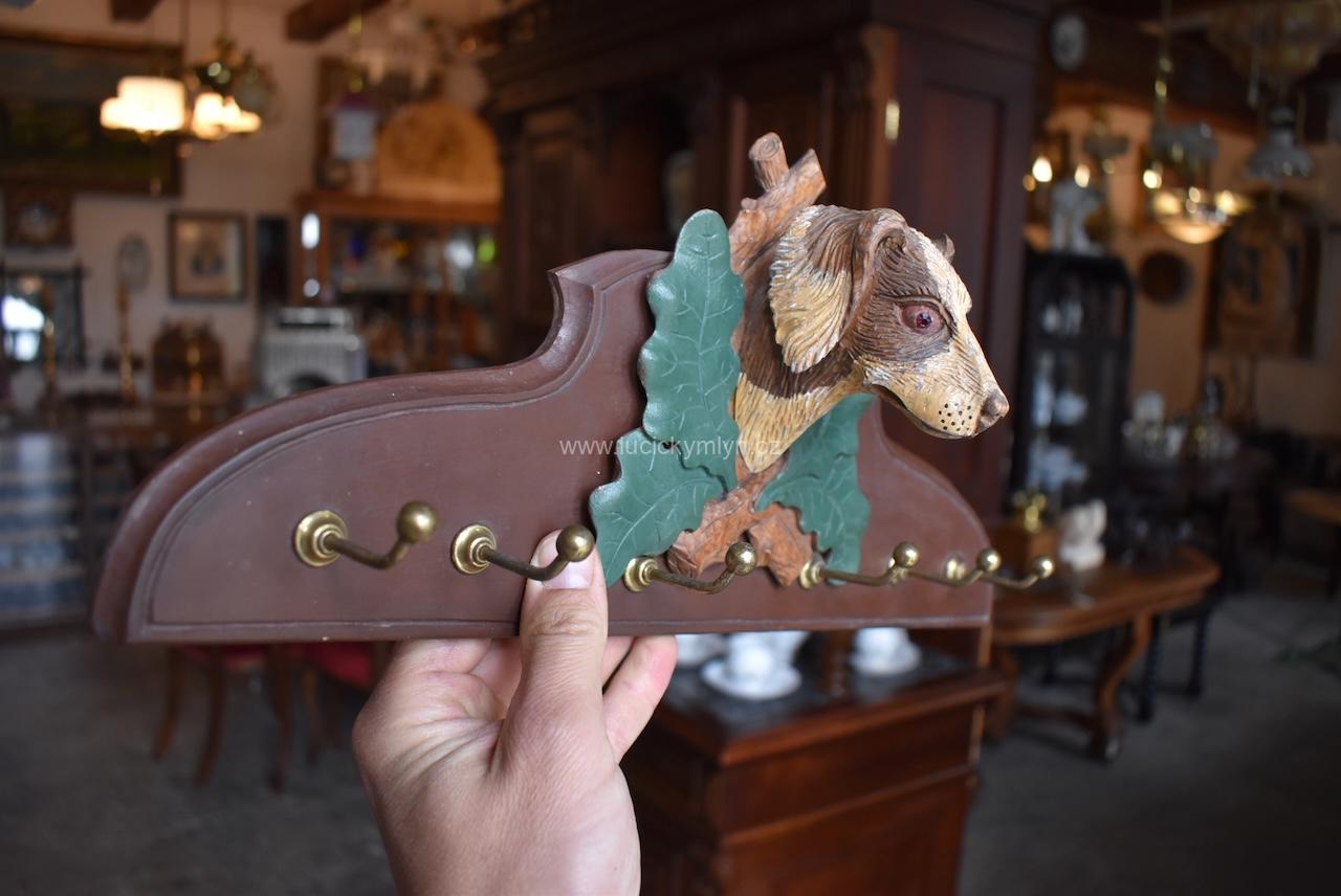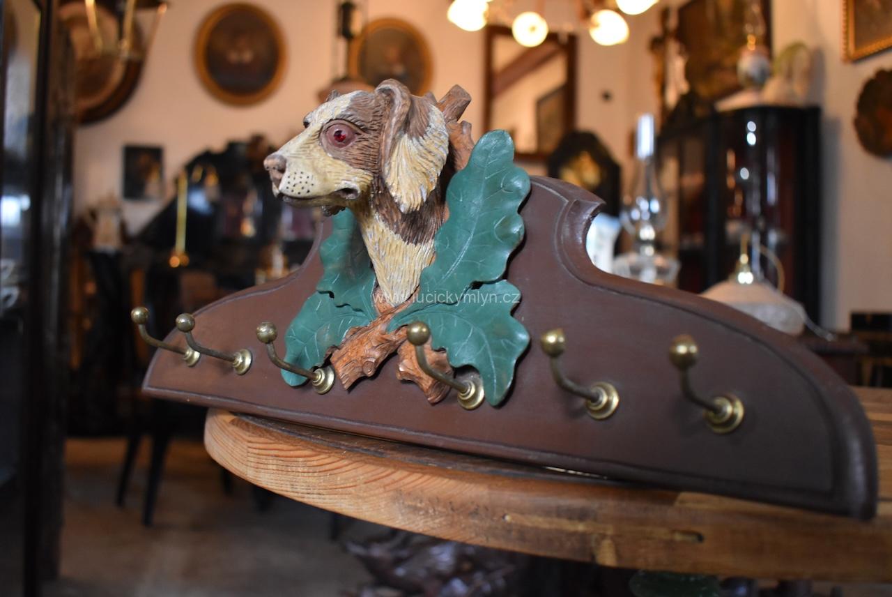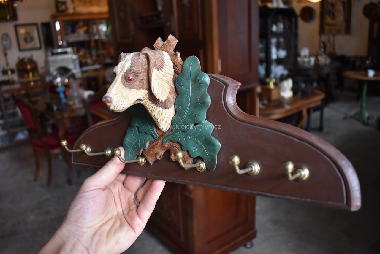 Nástěnný věšáček se základnou vykrojenou z masivního prkénka, má pevně zašroubované mosazné věšáčky. Dále je osazen řezbářsky ztvárněnou ozdobou se psí hlavičkou na trofejně stylizované podložce z dubových větviček a listů. Menší, ale velmi zdařilý nástěnný věšák ze staré panské hájovny, má vzadu upevněné dva závěsné plíšky. Je vhodný např. pro přehledné zavěšení klíčů, nebo jiných ne příliš těžkých předmětů či šatstva. Starožitný věšáček v loveckém stylu je po menší celkové renovaci a připraven k užívání.