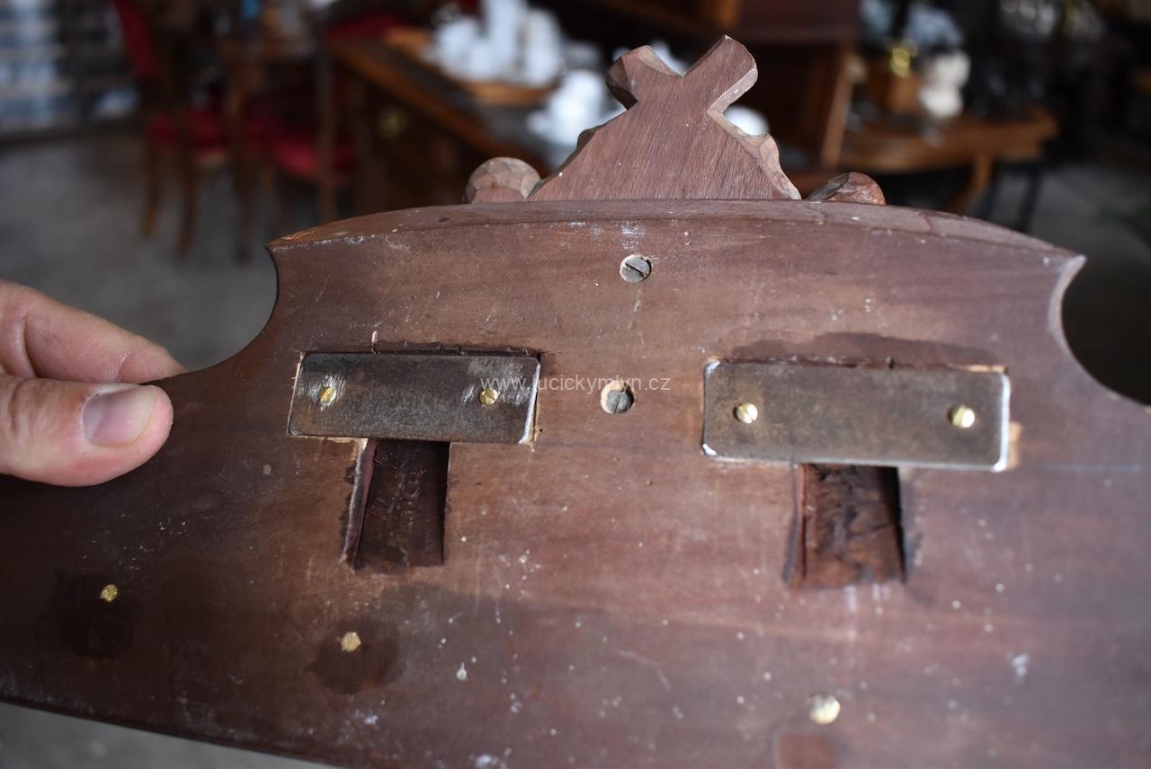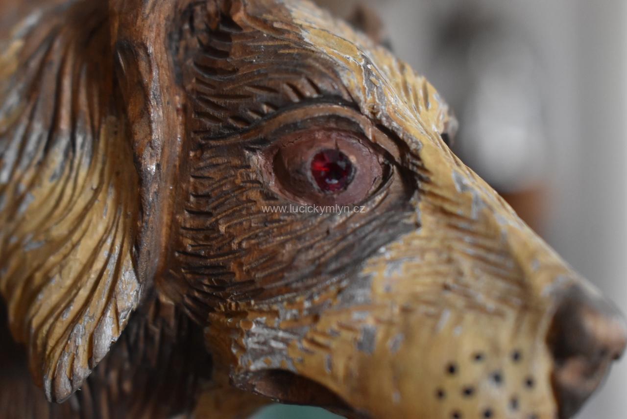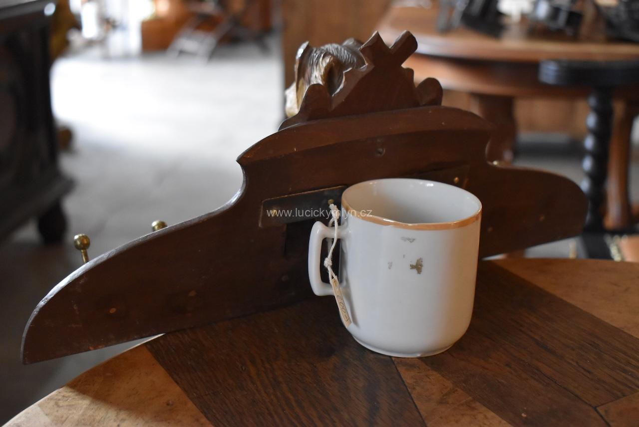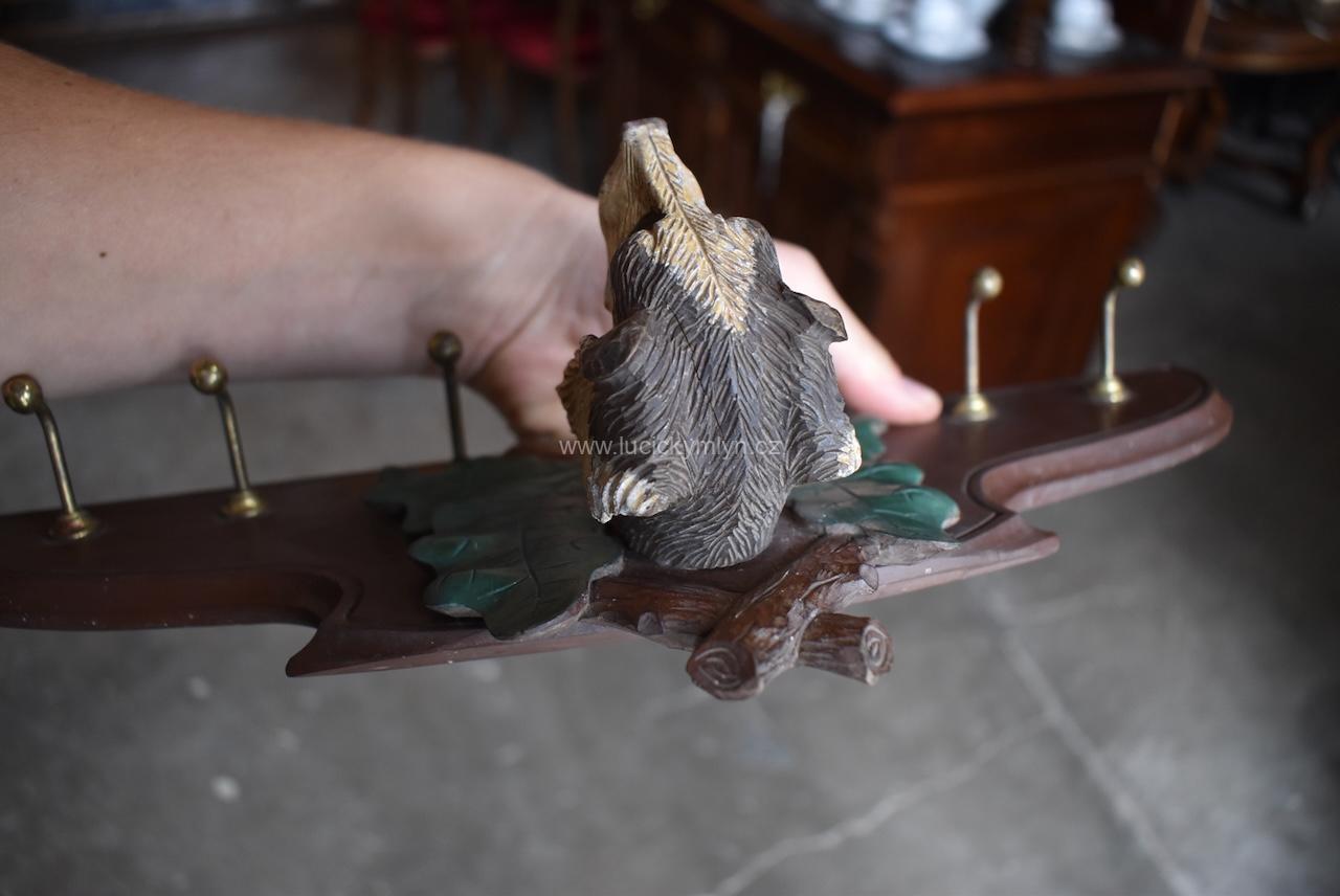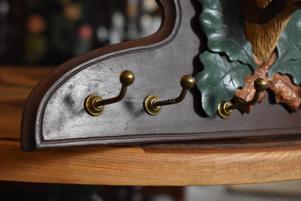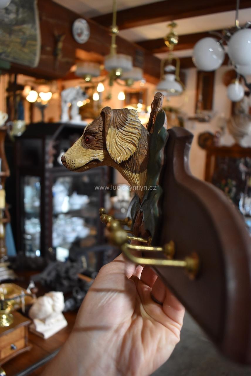 Nástěnný věšáček se základnou vykrojenou z masivního prkénka, má pevně zašroubované mosazné věšáčky. Dále je osazen řezbářsky ztvárněnou ozdobou se psí hlavičkou na trofejně stylizované podložce z dubových větviček a listů. Menší, ale velmi zdařilý nástěnný věšák ze staré panské hájovny, má vzadu upevněné dva závěsné plíšky. Je vhodný např. pro přehledné zavěšení klíčů, nebo jiných ne příliš těžkých předmětů či šatstva. Starožitný věšáček v loveckém stylu je po menší celkové renovaci a připraven k užívání.