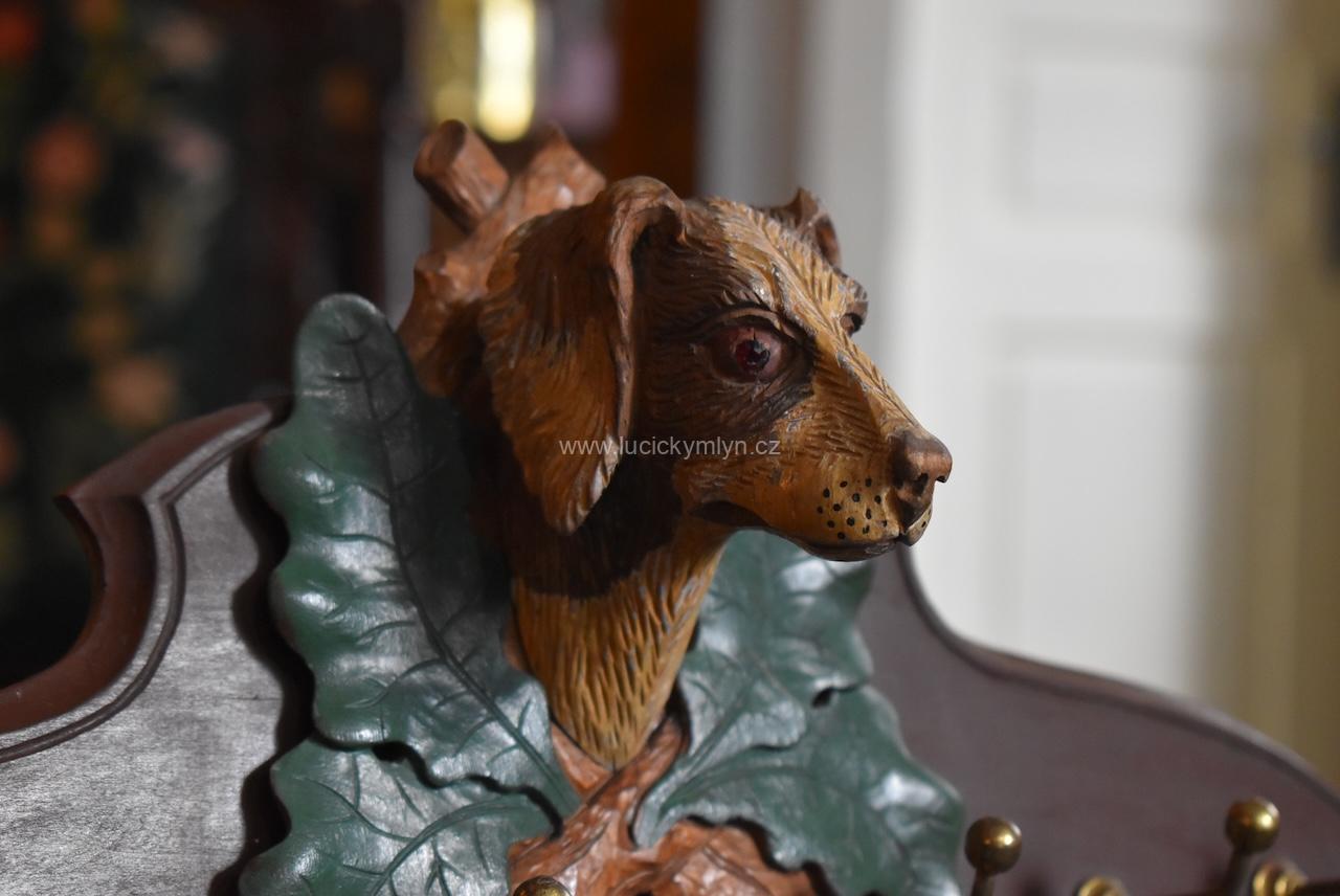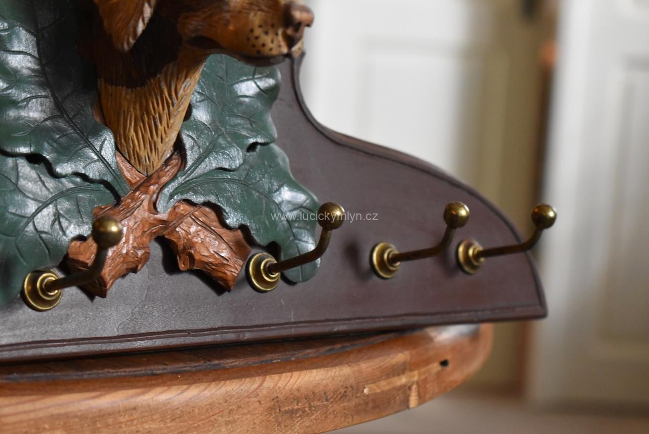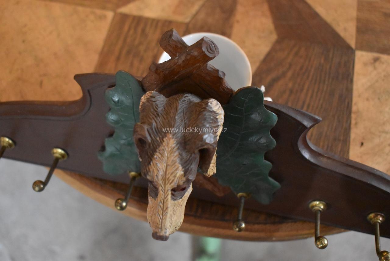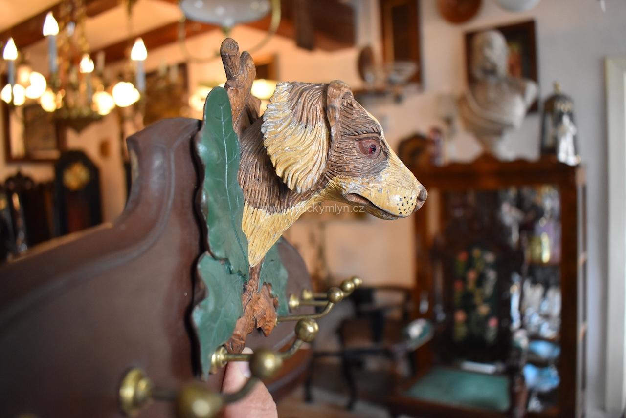 Starožitný věšáček v mysliveckém stylu působivě okrášlený ruční řezbou s dubovými listy a hlavičkou loveckého psa