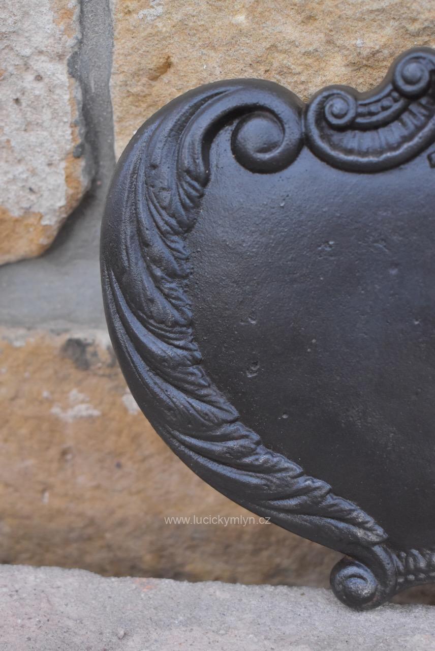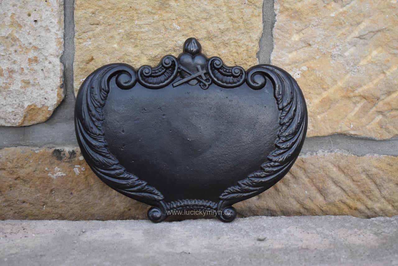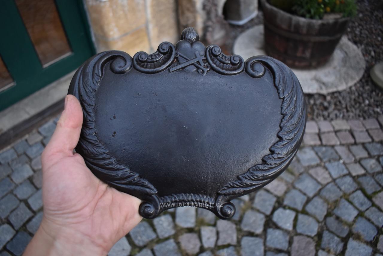 Originální dílec, který sloužil jako příslušenství k ozdobným litinovým křížům se dnes s oblibou používá jako dekorativní štítek pro číslo popisné. Na této kdysi přišroubované cedulce bývalo napsáno jméno pochovaného nebo i jméno konkrétního svatého k jehož slávě byl pomník vystavěn. Někdy se na takovéto cedulce vyskytuje i jméno mecenáše, nebo rodu, který drobnou sakrální stavbičku nechal na své náklady vystavět, nebo ji opravil. Dílec z umělecké litiny, pochází ze 3. 1/3 19. století. Pro očištění od slabé koroze i zbytku nevhodných nátěrů jsme starožitný dílec s širokým využitím mechanicky vyčistili a přeleštili.