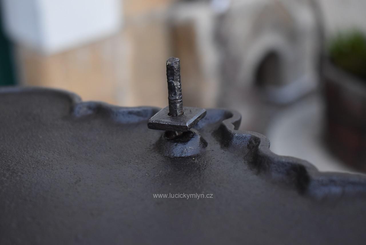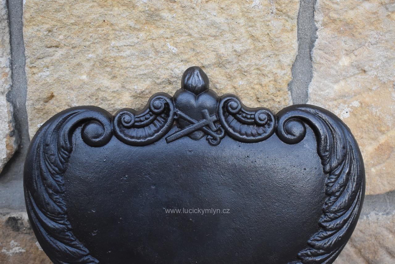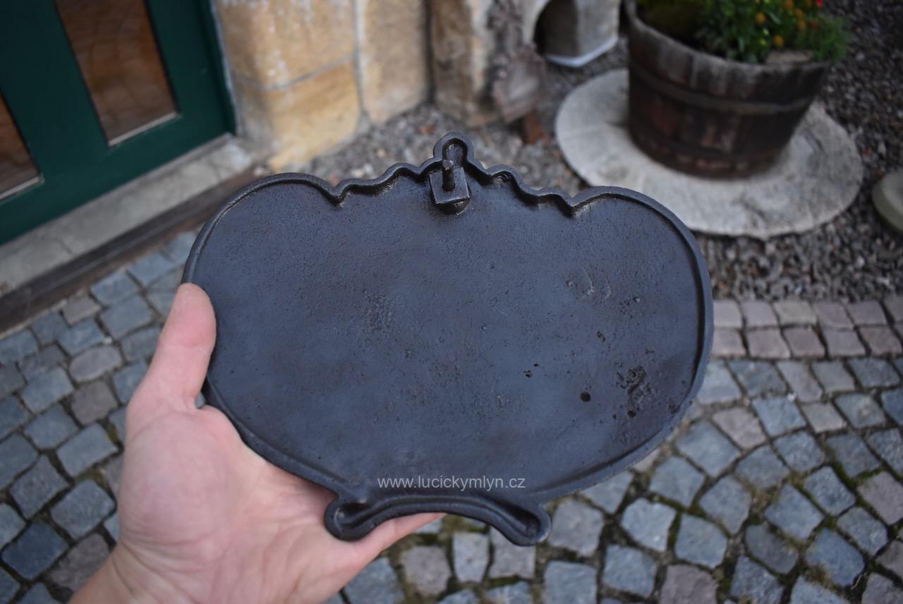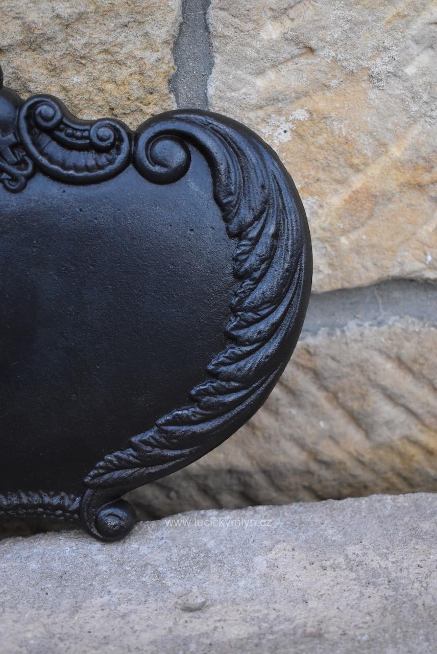 Originální dílec, který sloužil jako příslušenství k ozdobným litinovým křížům se dnes s oblibou používá jako dekorativní štítek pro číslo popisné. Na této kdysi přišroubované cedulce bývalo napsáno jméno pochovaného nebo i jméno konkrétního svatého k jehož slávě byl pomník vystavěn. Někdy se na takovéto cedulce vyskytuje i jméno mecenáše, nebo rodu, který drobnou sakrální stavbičku nechal na své náklady vystavět, nebo ji opravil. Dílec z umělecké litiny, pochází ze 3. 1/3 19. století. Pro očištění od slabé koroze i zbytku nevhodných nátěrů jsme starožitný dílec s širokým využitím mechanicky vyčistili a přeleštili.