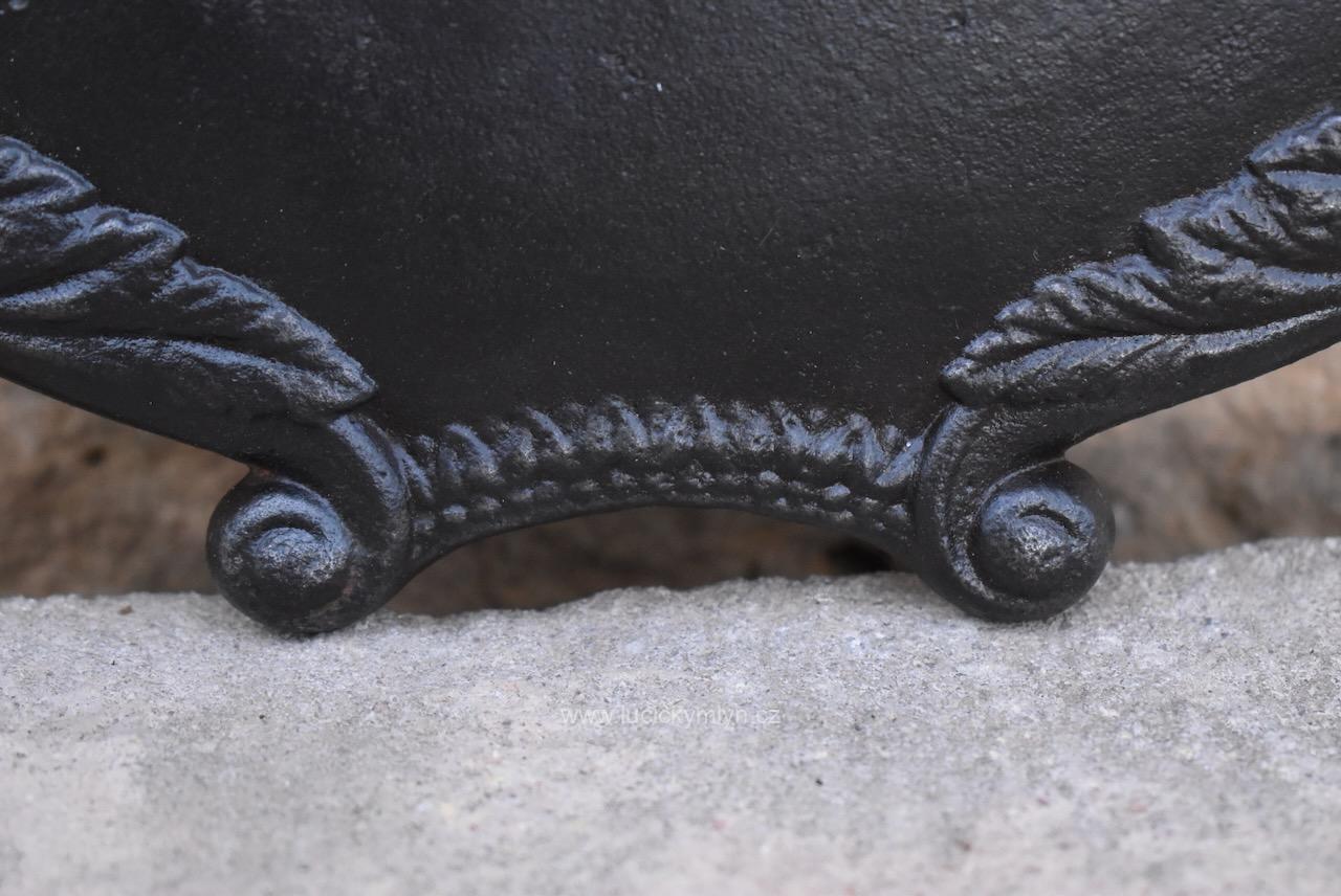 Středně velký, starožitný, téměř oválný a lehce vypouklý medailon z umělecké litiny po obvodu lemovaný stylizovaným věncem z listů