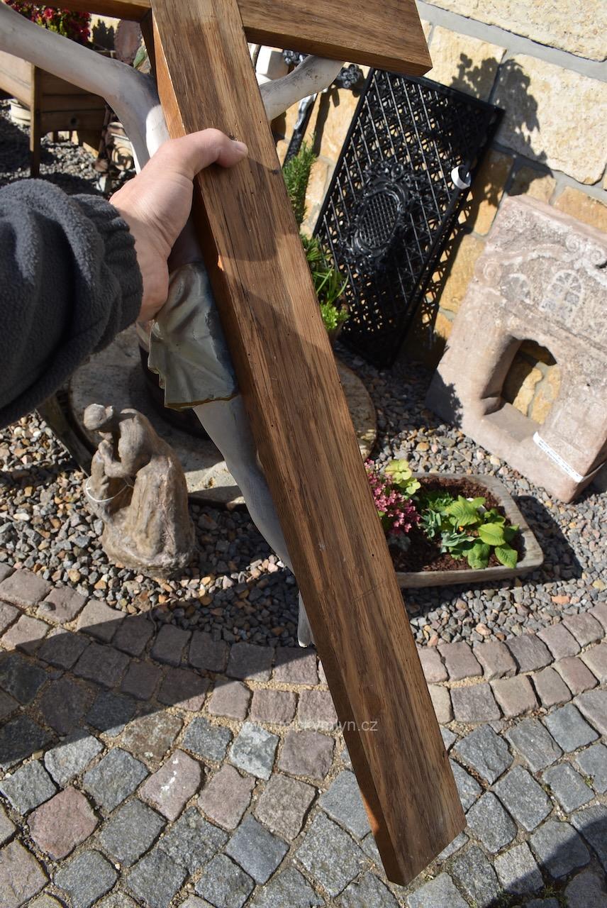 Středně větší a kvalitnější starožitná dřevořezba – Ježíš Kristus ze 2. pol. 19. stol. se zachovalou polychromní malbou, upevněný na mořeném dubovém kříži