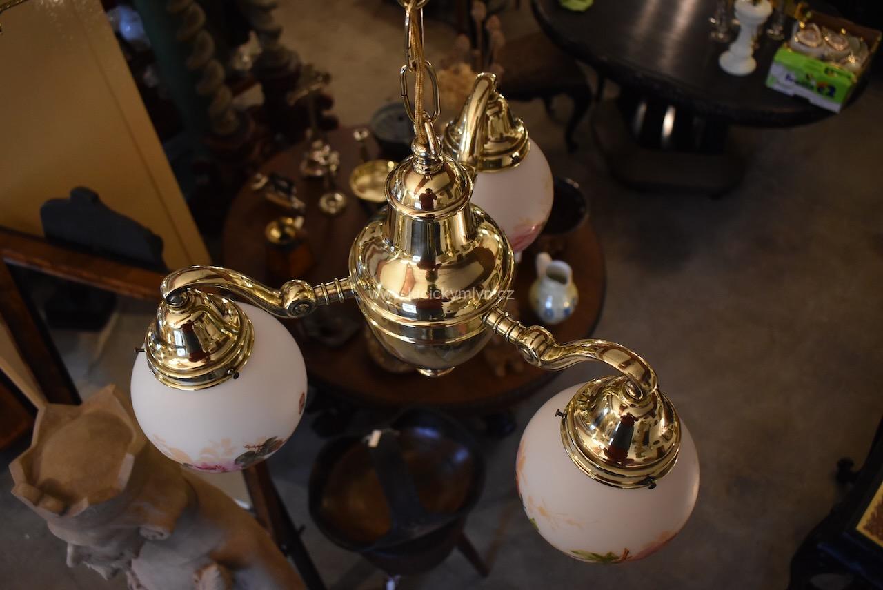 Kvalitní a hezký měšťanský lustr byl pasířsky zhotoven z ozdobně tlačeného mosazného plechu. Na nevšedních, esovitě ztvárněných ramenech, jsou spodně upevněné kloboučky osazené mléčně bílými koulemi. Tato stínidla jsou vkusně okrášlena ruční malbou s kvetoucími růžemi. Měšťanský lustr, který pochází z Čech má široké hladce soustružené tělo, vyrobené též z tlačeného mosazného plechu. Světlo je zavěšeno na pevném a delším mosazném řetězu. Na jeho vrcholu je osazena hlubší stropní mistička ze stupňovitě tlačeného mosazného plechu. Tento dekorativní dílec, klasicky kryje zavěšení a elektrické připojení. Starožitný lustr je po celkové renovaci, včetně nové elektroinstalace. Jsou zde zachovány původní a kvalitní mosazné objímky se závitem na běžné žárovky.