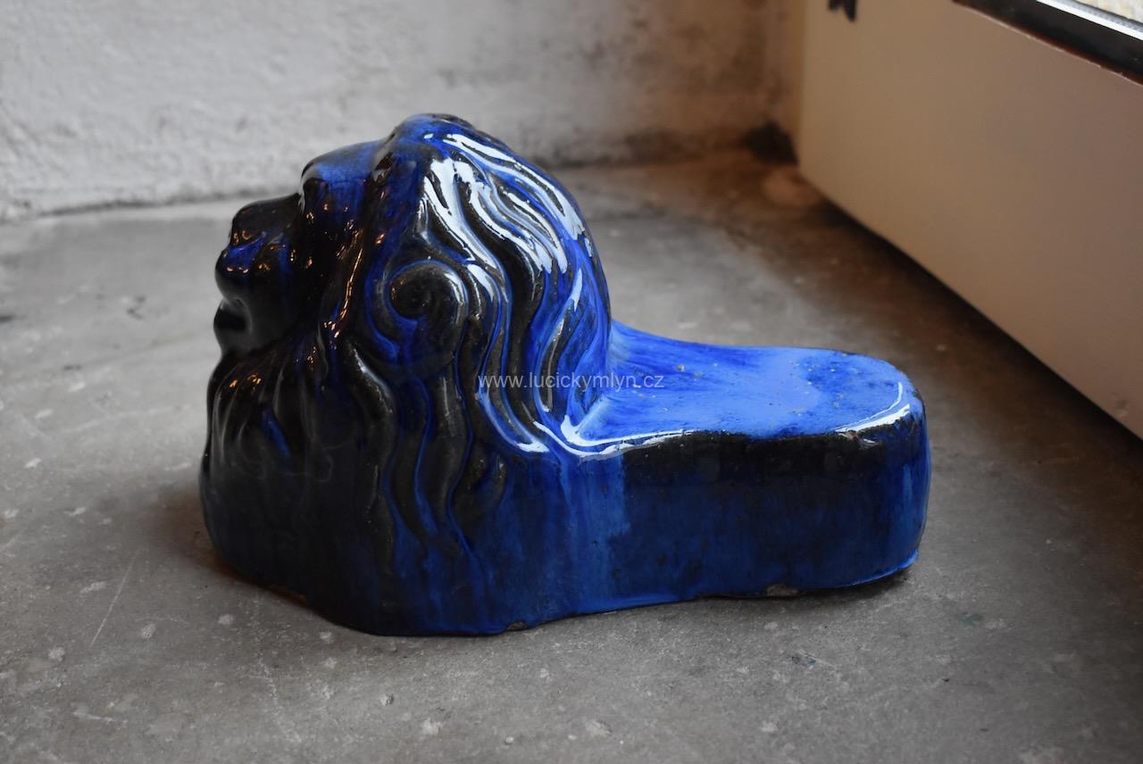 Těžší a pevná starožitná dveřní zarážka z ostře pálené hlíny opatřená rubínově modrou a lesklou glazurou – 1. pol. 20. stol.