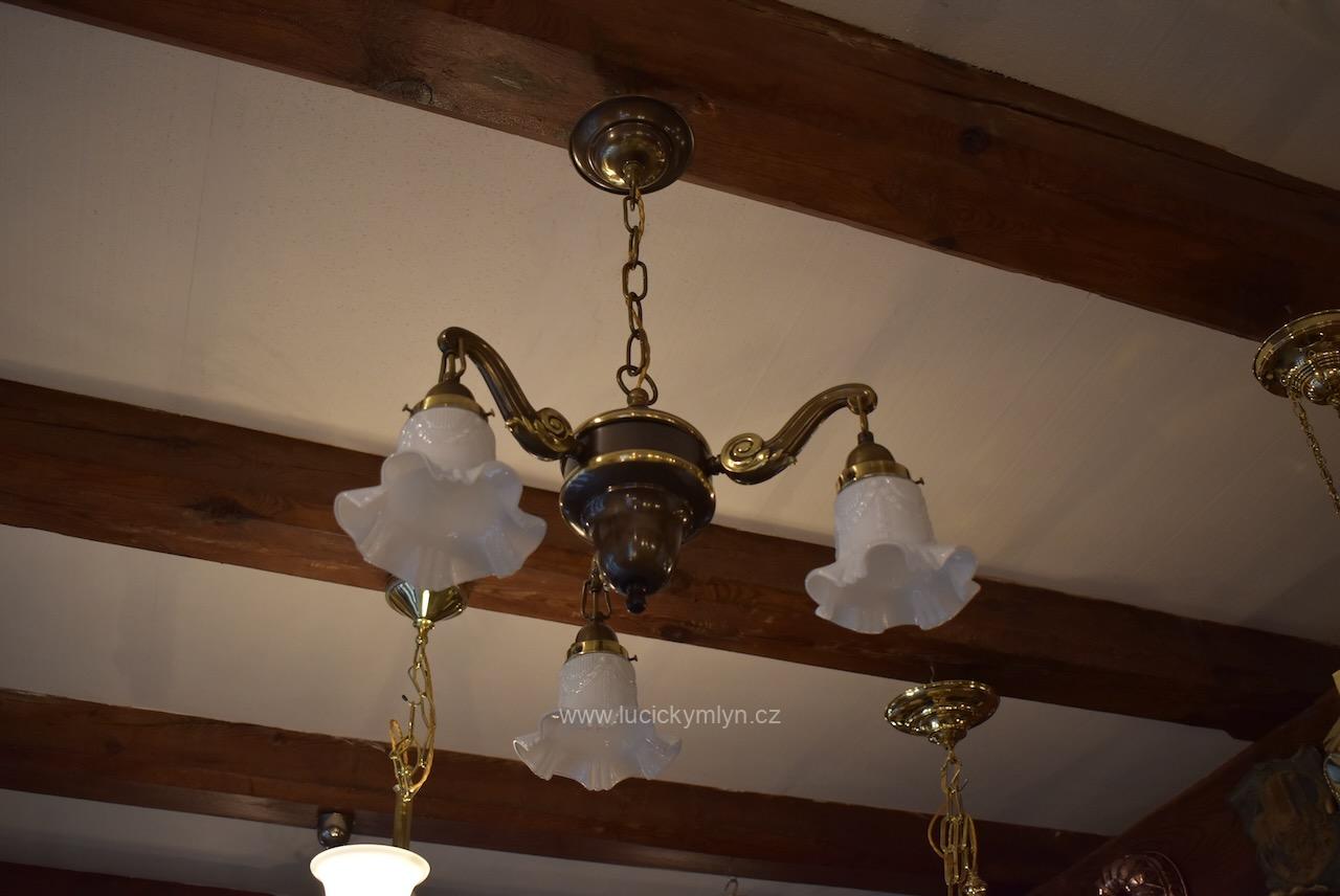 Mosazný, tmavě patinovaný, tří-ramenný lustr v historizujícím romantickém stylu vkusně osazený mléčně bílými stínidly ve tvaru klasicky stylizovaného květu