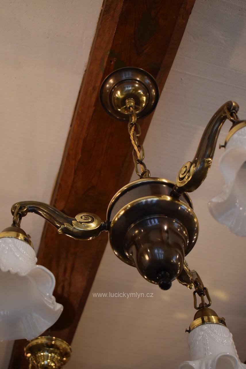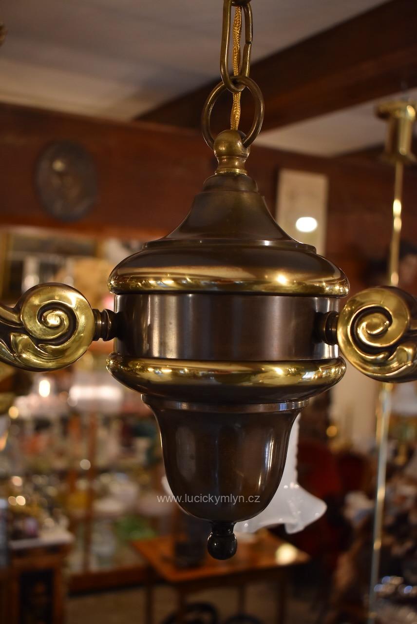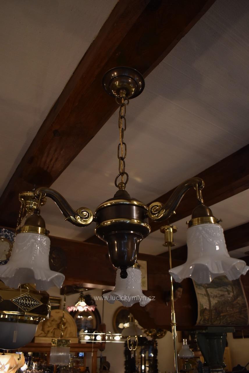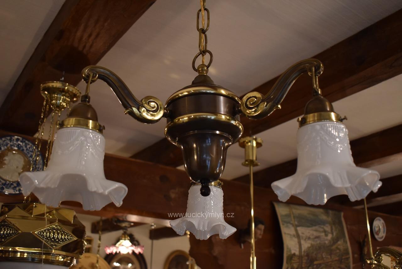 Středně velké, měšťanské, závěsné, prvorepublikové světlo bylo zhotoveno z tlačeného mosazného plechu a místy decentně oživeno proleštěným povrchem. Lustr pochází z Čech a byl vyroben po r. 1920. Světlo má hezky tvarovaná esovitá ramena, ozdobená klasickými rozvilinami. Na nich jsou v upínacích kloboučcích zavěšeny stínící skla z mléčného skla. Celkově renovované svítidlo je zavěšeno na původním mosazném řetězu. Oprava byla provedena včetně nové elektroinstalace. Hezký tří-ramenný měšťanský lustr má objímky se závitem na běžné žárovky.