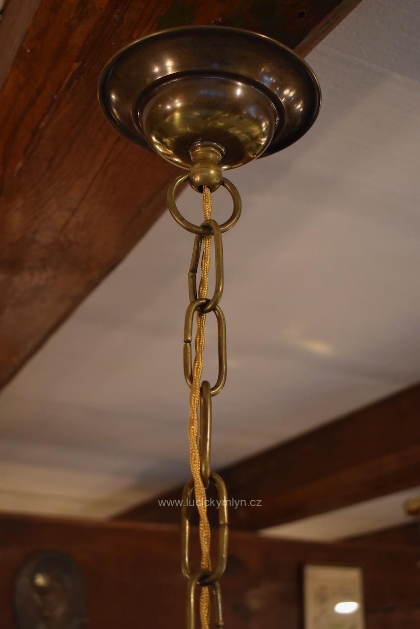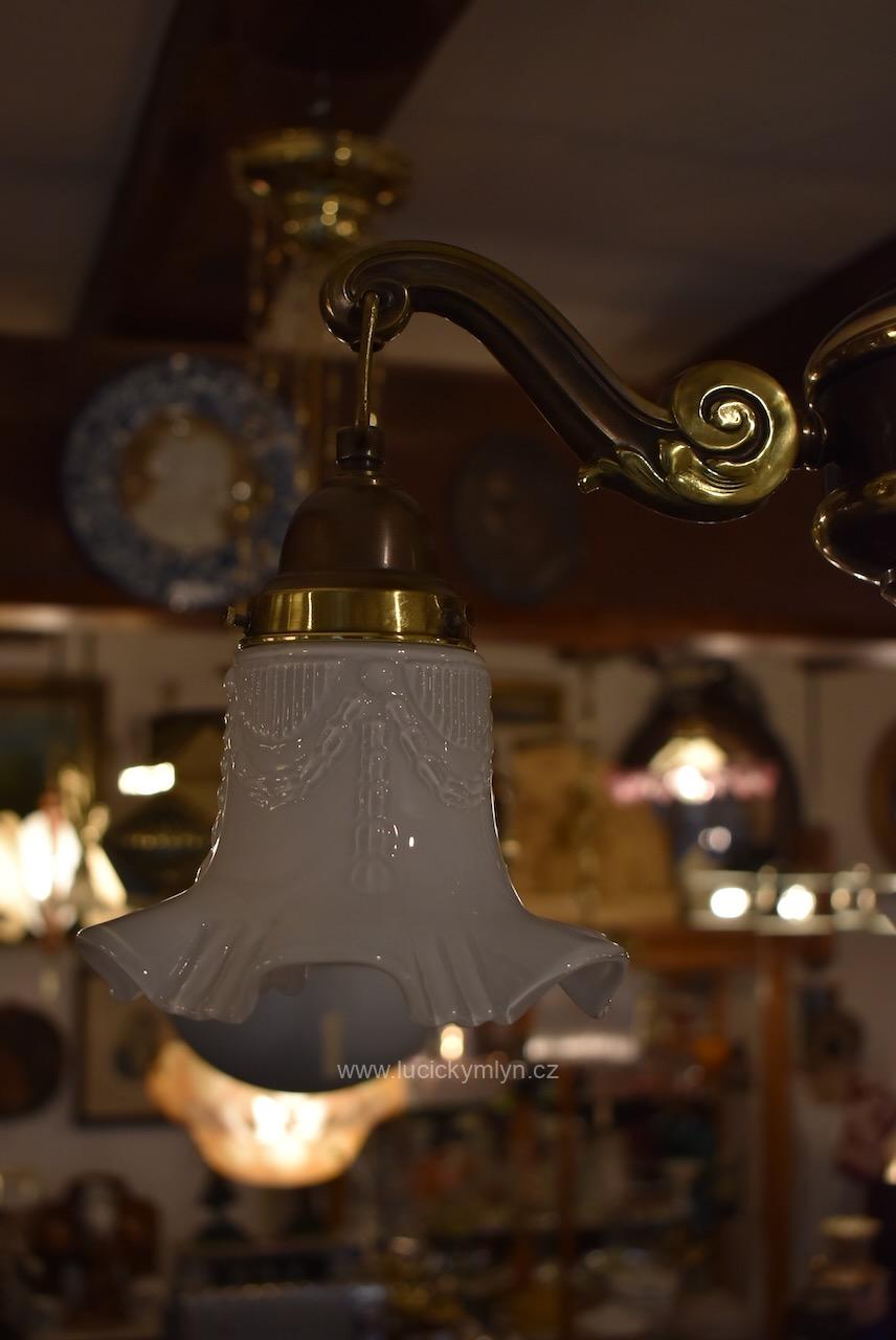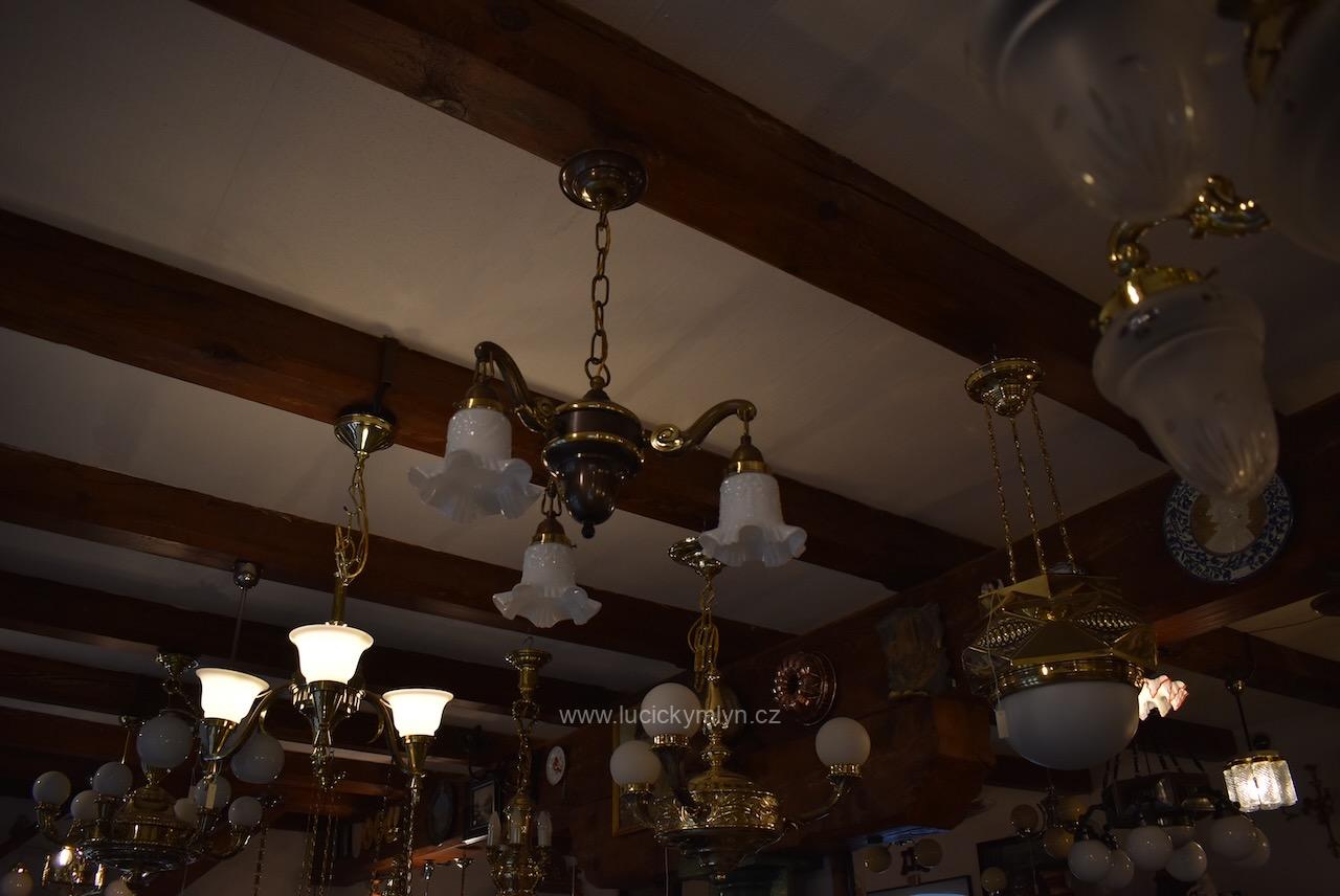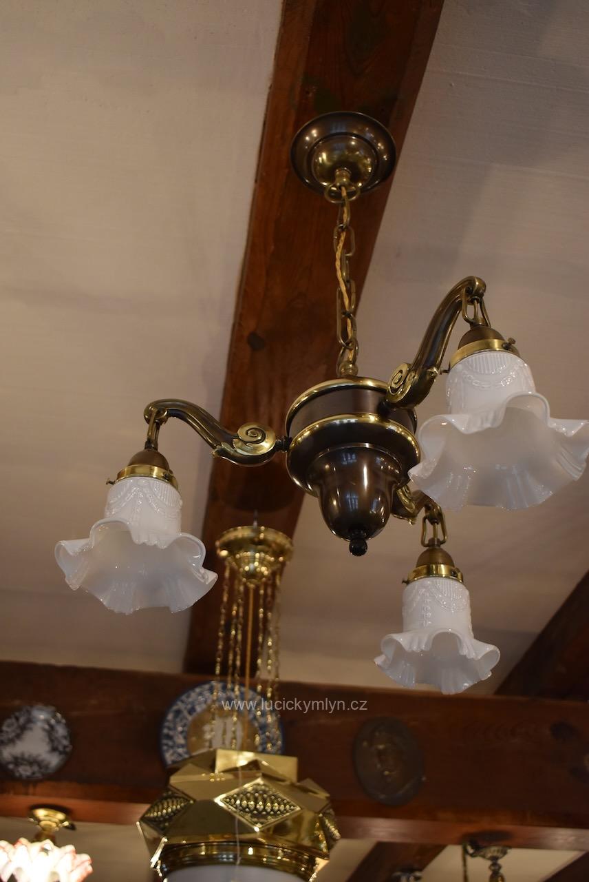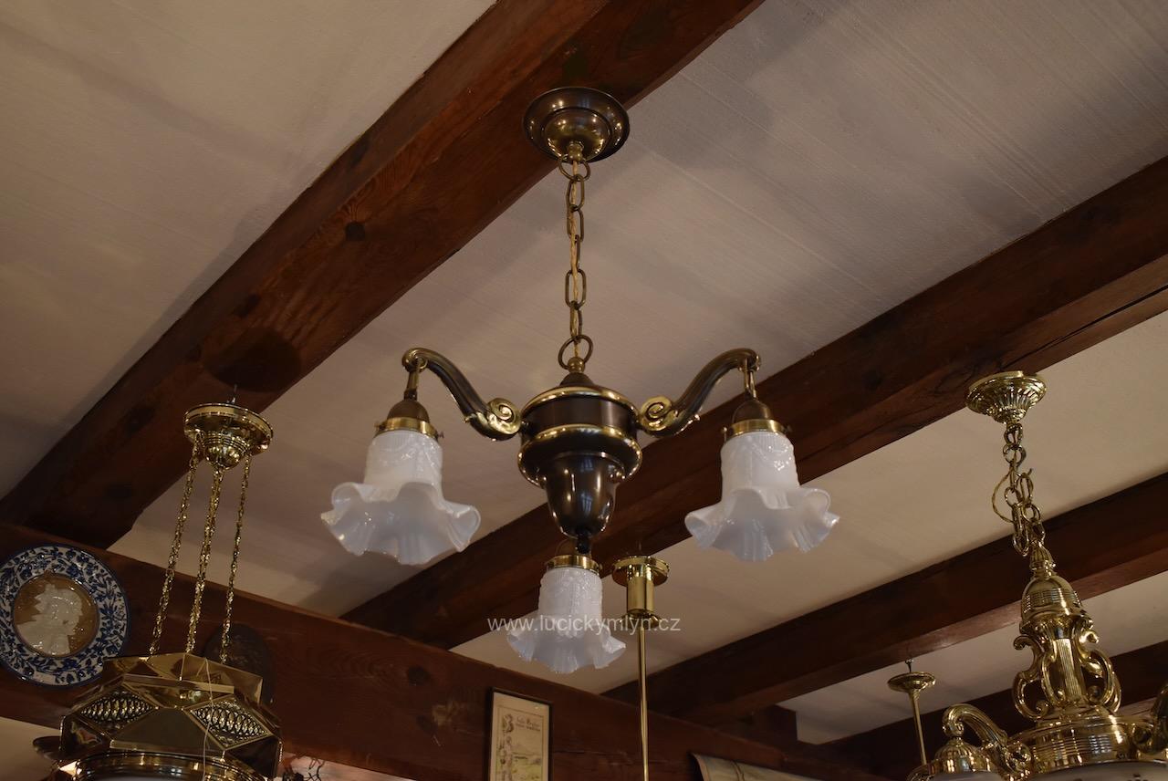 Středně velké, měšťanské, závěsné, prvorepublikové světlo bylo zhotoveno z tlačeného mosazného plechu a místy decentně oživeno proleštěným povrchem. Lustr pochází z Čech a byl vyroben po r. 1920. Světlo má hezky tvarovaná esovitá ramena, ozdobená klasickými rozvilinami. Na nich jsou v upínacích kloboučcích zavěšeny stínící skla z mléčného skla. Celkově renovované svítidlo je zavěšeno na původním mosazném řetězu. Oprava byla provedena včetně nové elektroinstalace. Hezký tří-ramenný měšťanský lustr má objímky se závitem na běžné žárovky.
