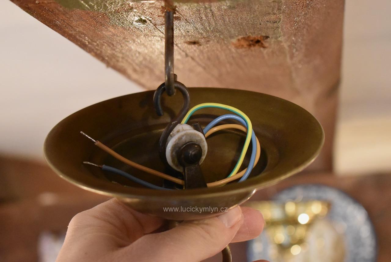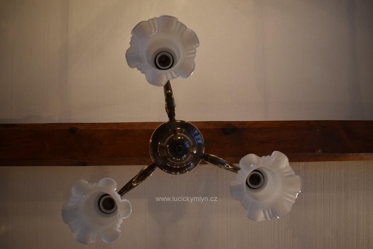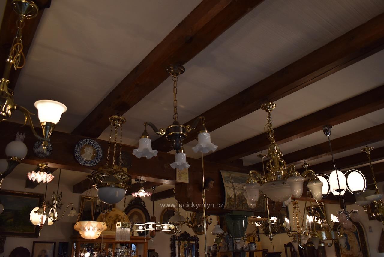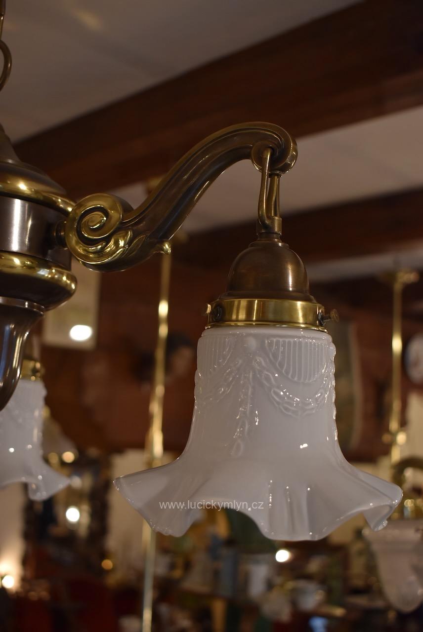 Středně velké, měšťanské, závěsné, prvorepublikové světlo bylo zhotoveno z tlačeného mosazného plechu a místy decentně oživeno proleštěným povrchem. Lustr pochází z Čech a byl vyroben po r. 1920. Světlo má hezky tvarovaná esovitá ramena, ozdobená klasickými rozvilinami. Na nich jsou v upínacích kloboučcích zavěšeny stínící skla z mléčného skla. Celkově renovované svítidlo je zavěšeno na původním mosazném řetězu. Oprava byla provedena včetně nové elektroinstalace. Hezký tří-ramenný měšťanský lustr má objímky se závitem na běžné žárovky.