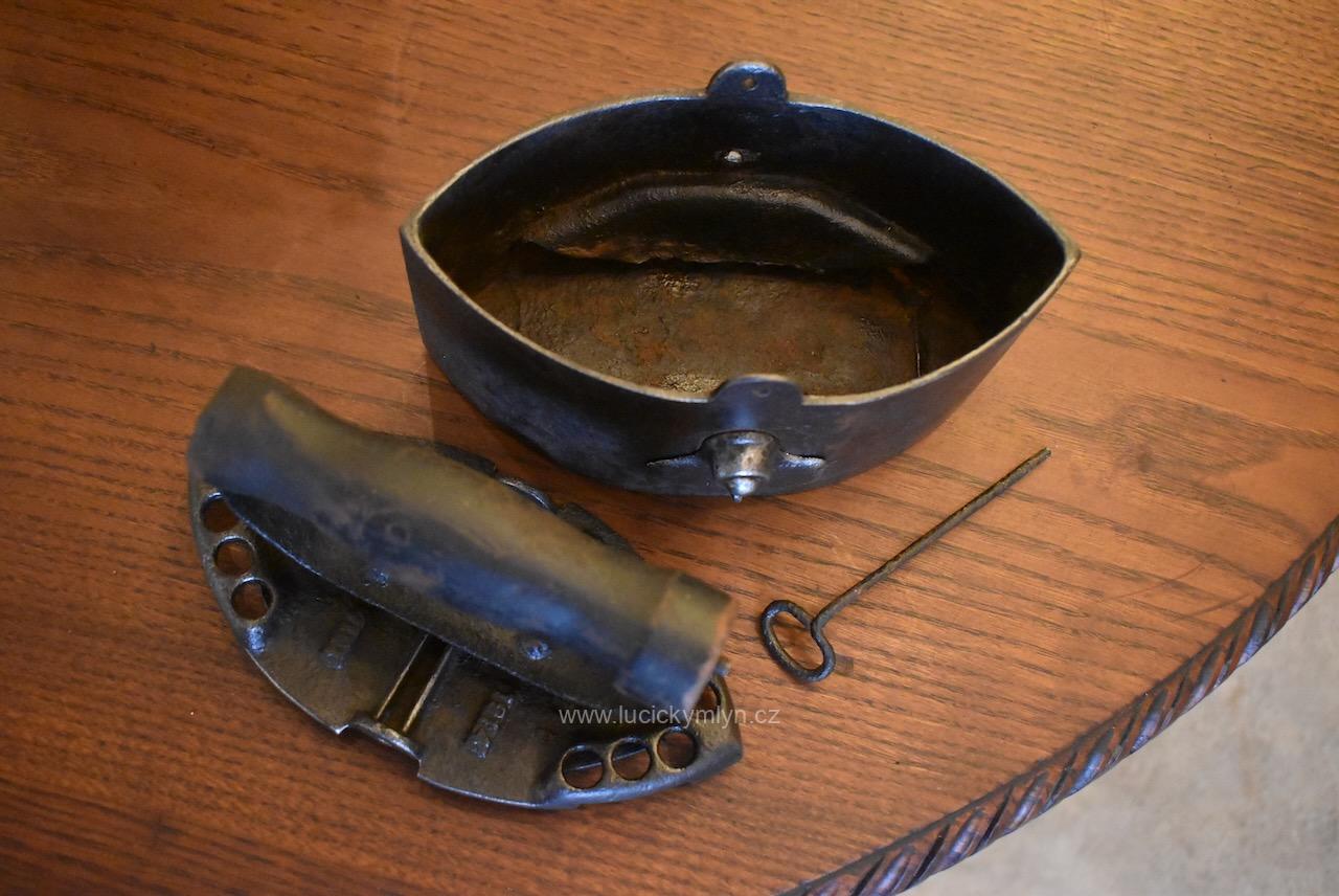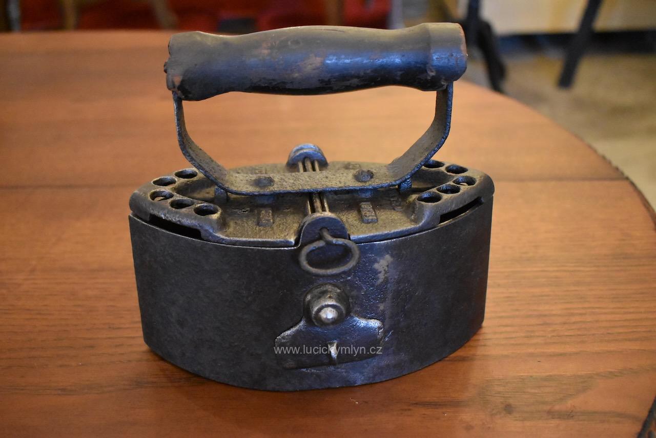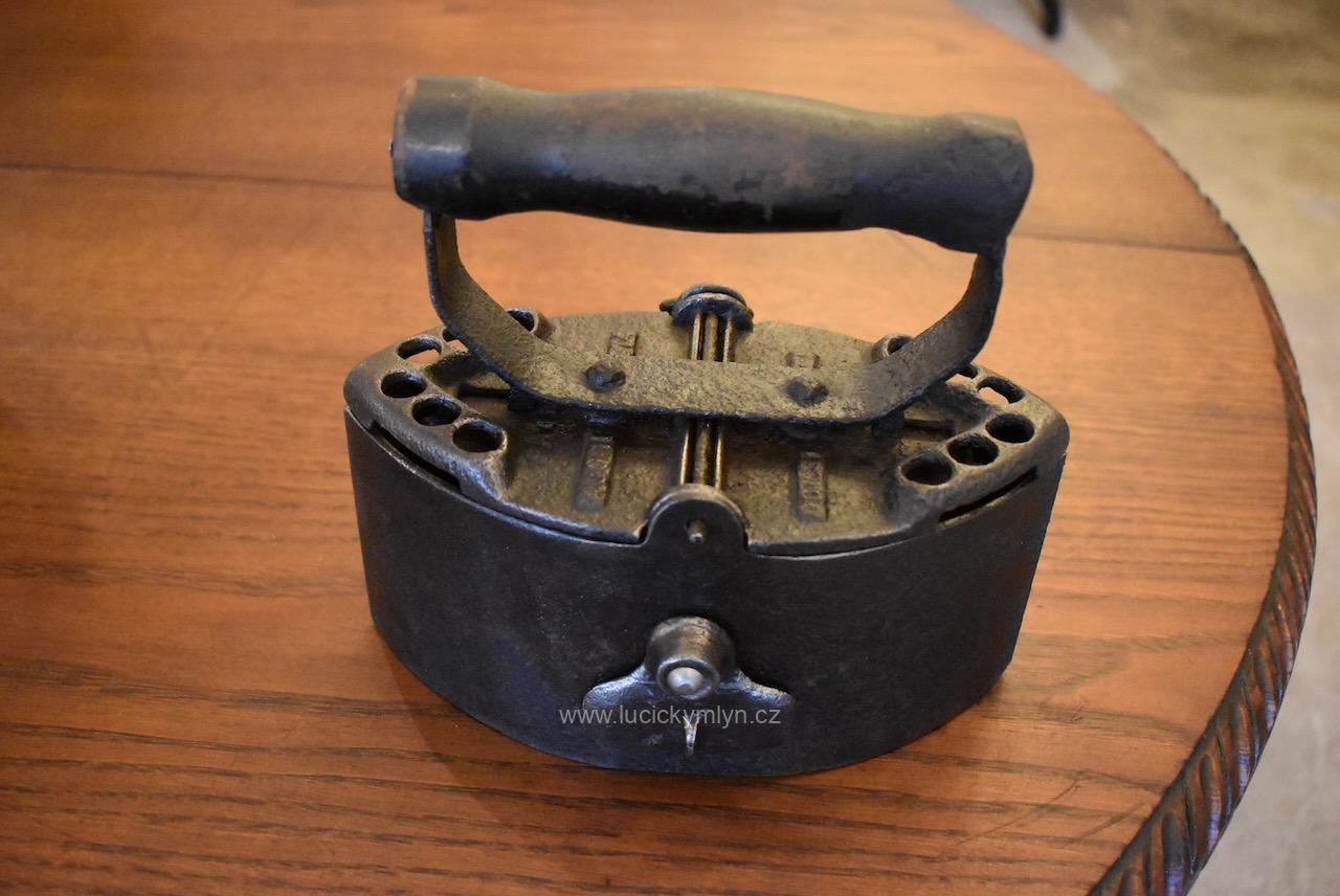 Tuto těžší, celo-litinovou žehličku si nechal vášnivý sběratel dovést z neznámé země, dálného východu. Žehlička ve tvaru symetrické loďky má snadno demontovatelný vrchní dílec, chytře opatřený na obou stranách lehce vyvýšenými průduchy. Díky těmto komínkům s horními kulatými otvory, mohly odcházet horké spaliny z vysoce výhřevného, dřevěného uhlí. Pod výrazně soustruženým držadlem z tvrdého cizokrajného dřeva se nachází snížená centrální plocha s reliéfně vystouplým značením výrobce. Tuto sběratelsky zajímavou žehličku z počátku 20. stol., jsme pouze důkladně očistili a téměř neleštili. Je zcela původní a ve velmi dobrém stavu. Žehlička má uvnitř, přímo nade dnem, zasazený velmi jednoduchý a účinný, oboustranný, provzdušňovací systém, který má za úkol přivádět ke žhnoucímu dřevěnému uhlí okysličený vzduch. Přívod se reguloval dle potřeby, jednoduchými otočnými uzávěry na obou bocích. Mezi starožitnými žehličkami se jedná o zajímavost a ojedinělý předmět, který může být ozdobou i Vaší sbírky. Velmi dobrý původní stav po vyčištění a konzervaci.