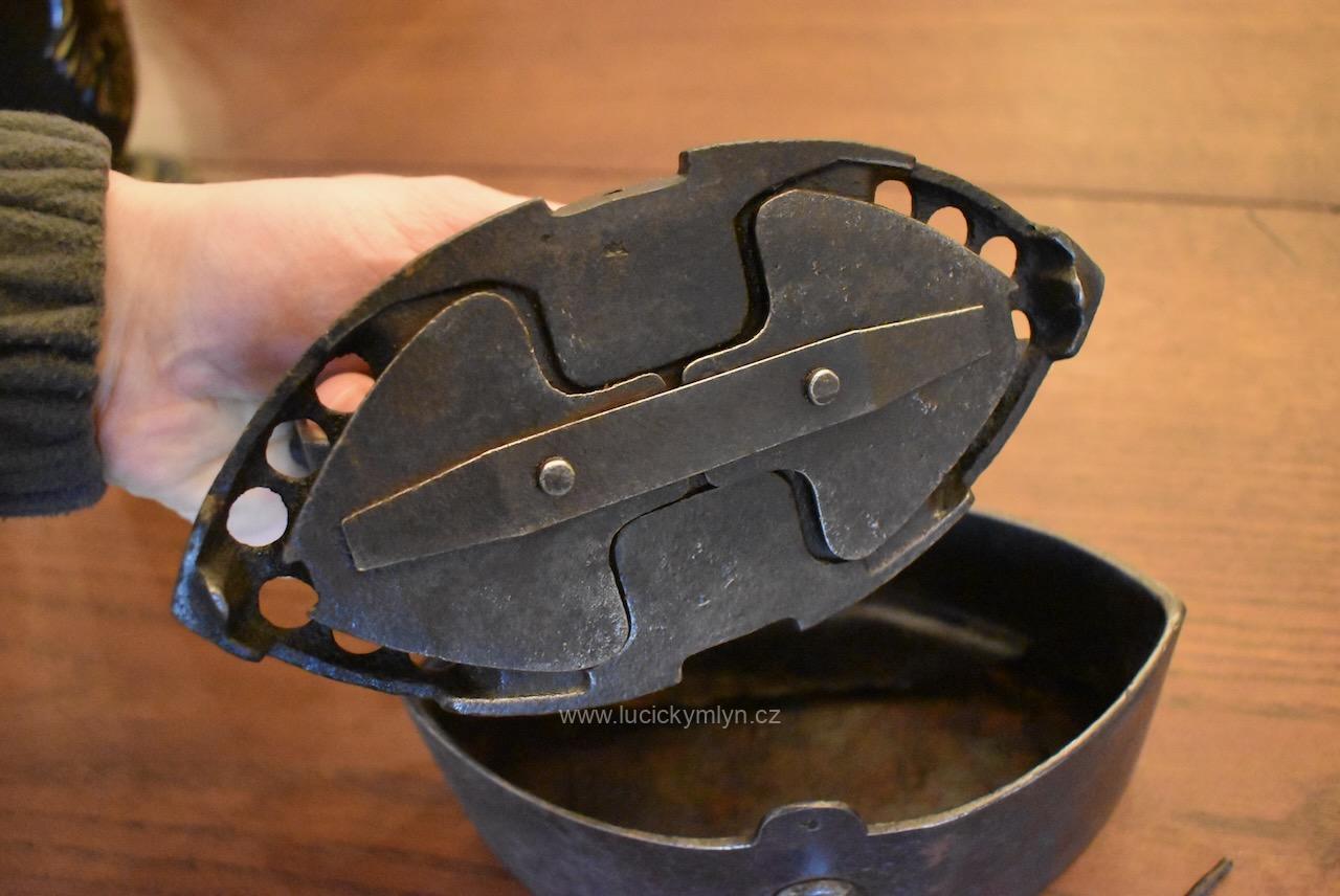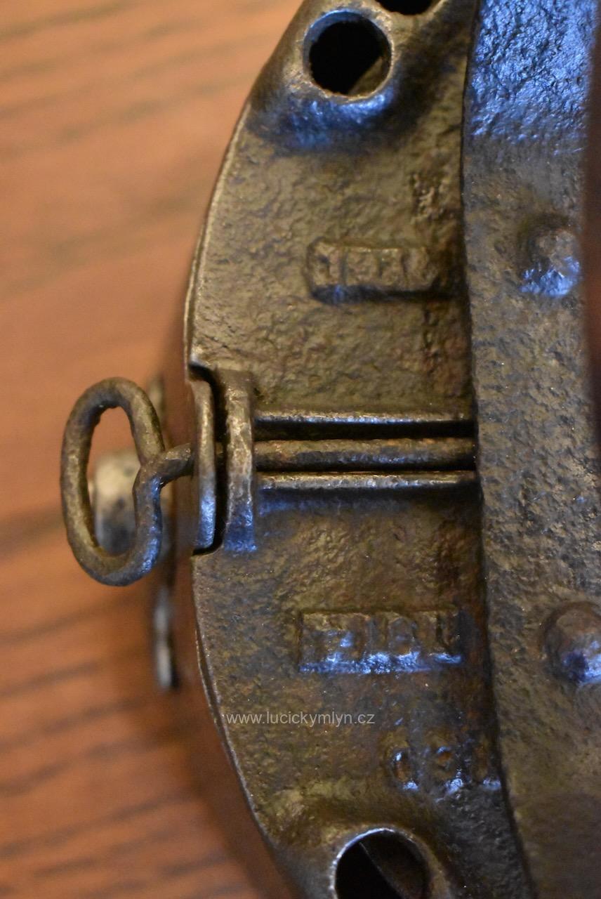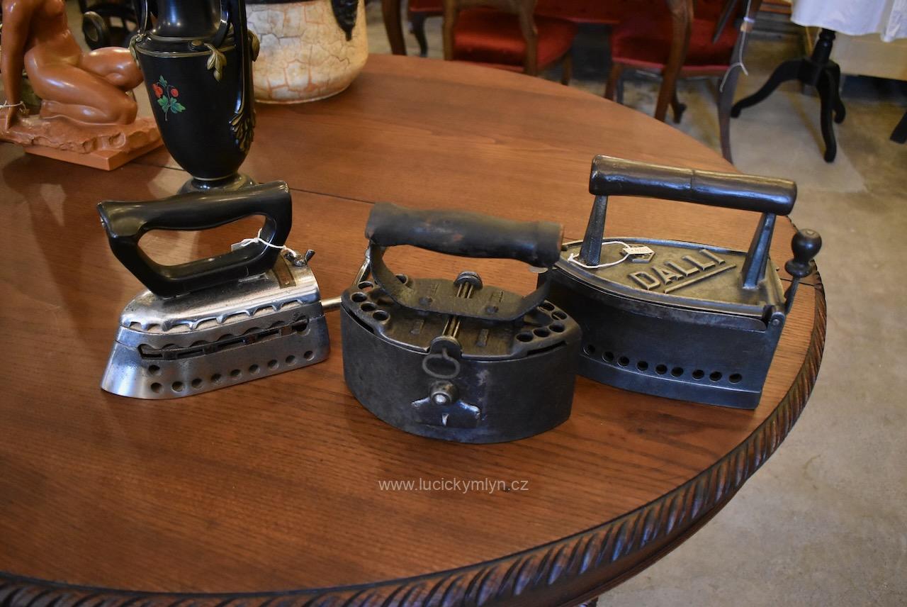 Tuto těžší, celo-litinovou žehličku si nechal vášnivý sběratel dovést z neznámé země, dálného východu. Žehlička ve tvaru symetrické loďky má snadno demontovatelný vrchní dílec, chytře opatřený na obou stranách lehce vyvýšenými průduchy. Díky těmto komínkům s horními kulatými otvory, mohly odcházet horké spaliny z vysoce výhřevného, dřevěného uhlí. Pod výrazně soustruženým držadlem z tvrdého cizokrajného dřeva se nachází snížená centrální plocha s reliéfně vystouplým značením výrobce. Tuto sběratelsky zajímavou žehličku z počátku 20. stol., jsme pouze důkladně očistili a téměř neleštili. Je zcela původní a ve velmi dobrém stavu. Žehlička má uvnitř, přímo nade dnem, zasazený velmi jednoduchý a účinný, oboustranný, provzdušňovací systém, který má za úkol přivádět ke žhnoucímu dřevěnému uhlí okysličený vzduch. Přívod se reguloval dle potřeby, jednoduchými otočnými uzávěry na obou bocích. Mezi starožitnými žehličkami se jedná o zajímavost a ojedinělý předmět, který může být ozdobou i Vaší sbírky. Velmi dobrý původní stav po vyčištění a konzervaci.