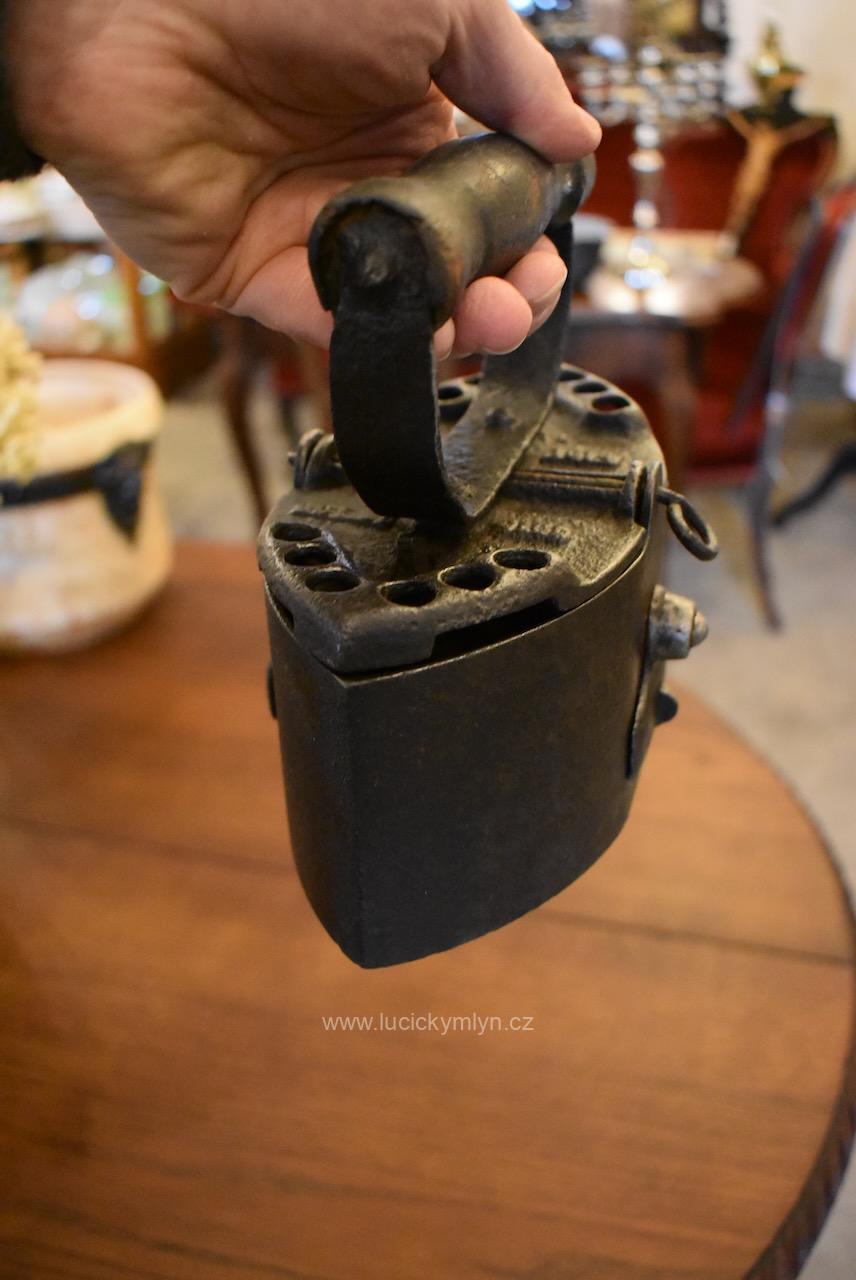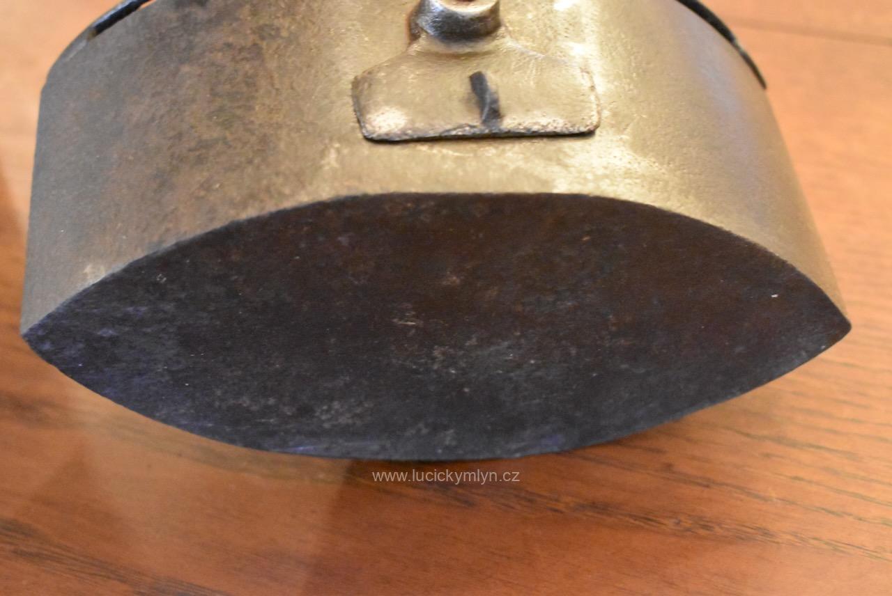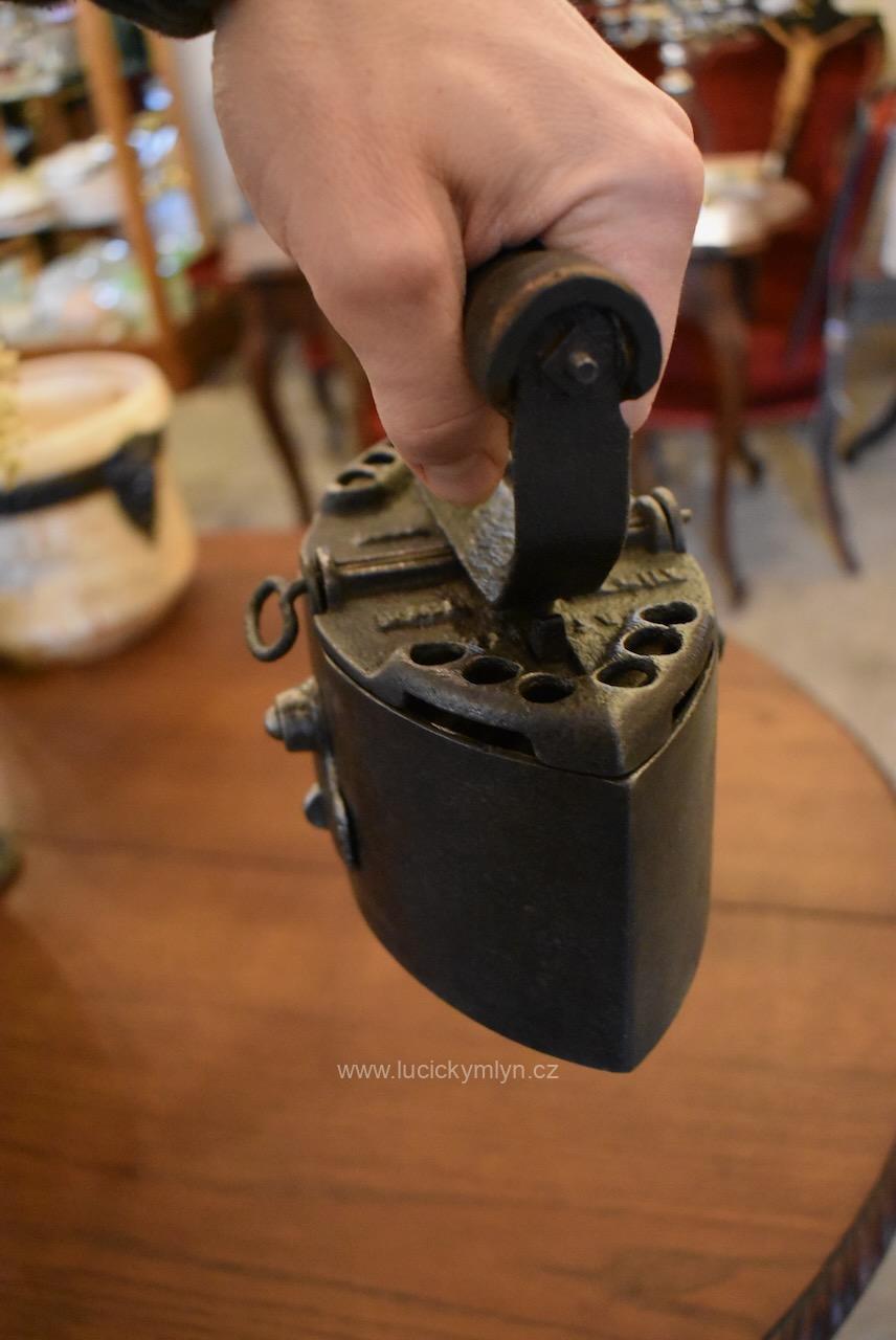 Typově zajímavá, starožitná, sběratelsky ojedinělá žehlička archaického typu se soustruženým držadlem na ohýbané konzoli z ocelové pásoviny