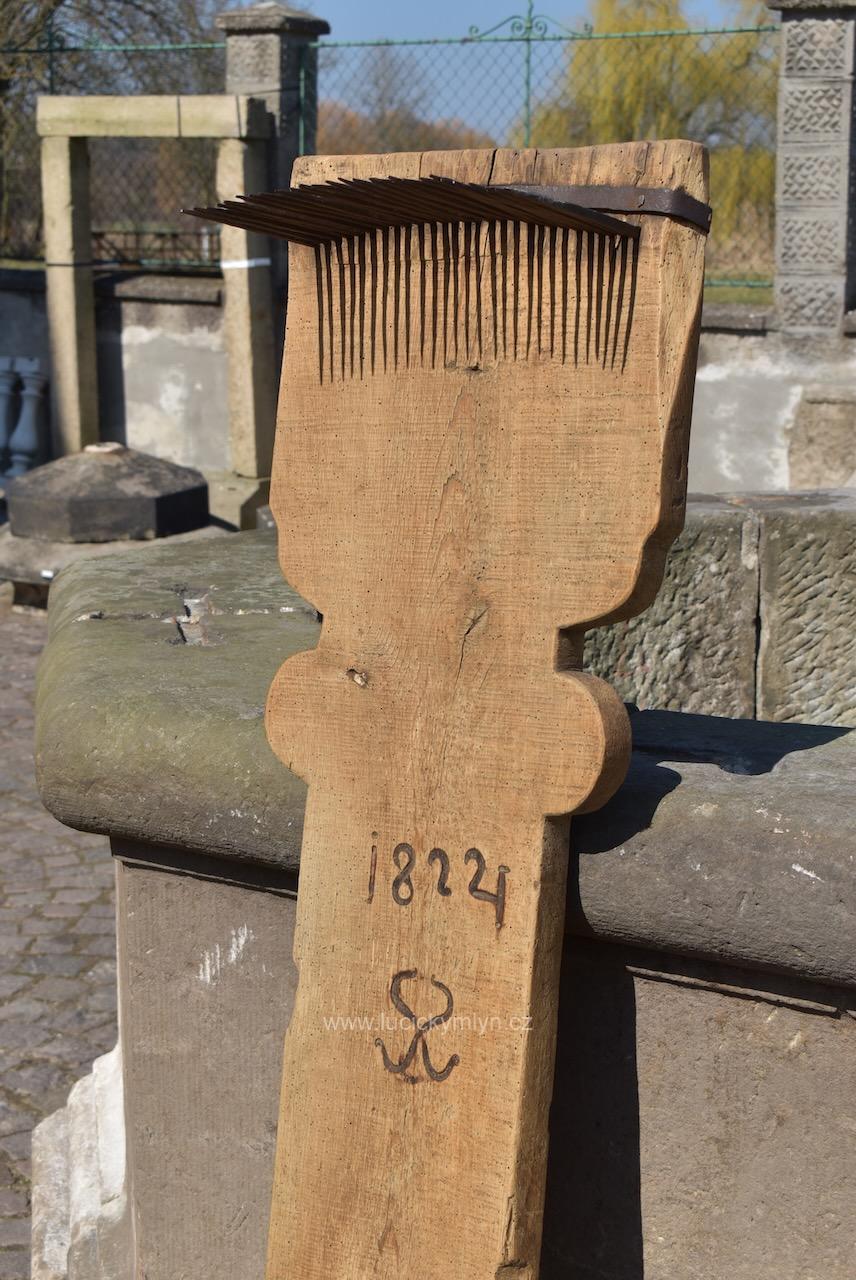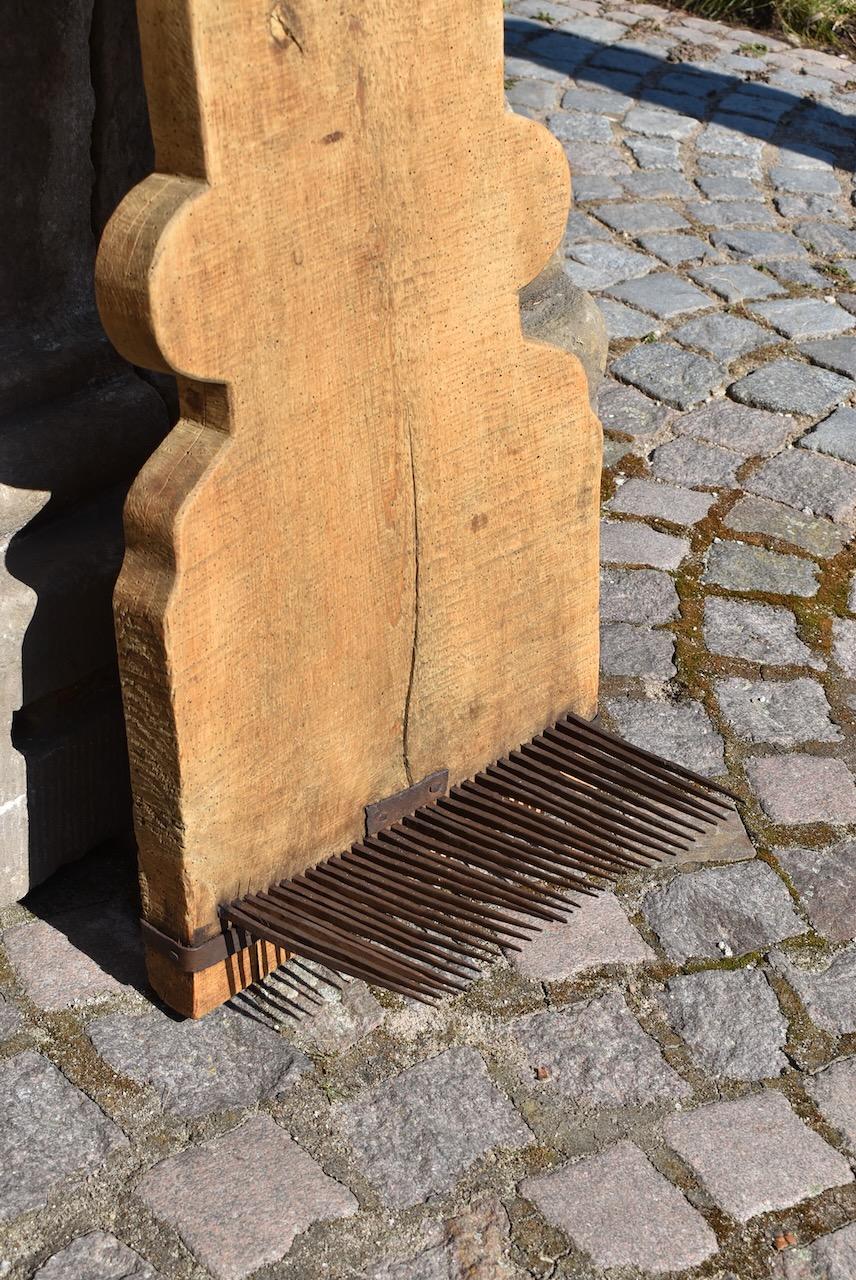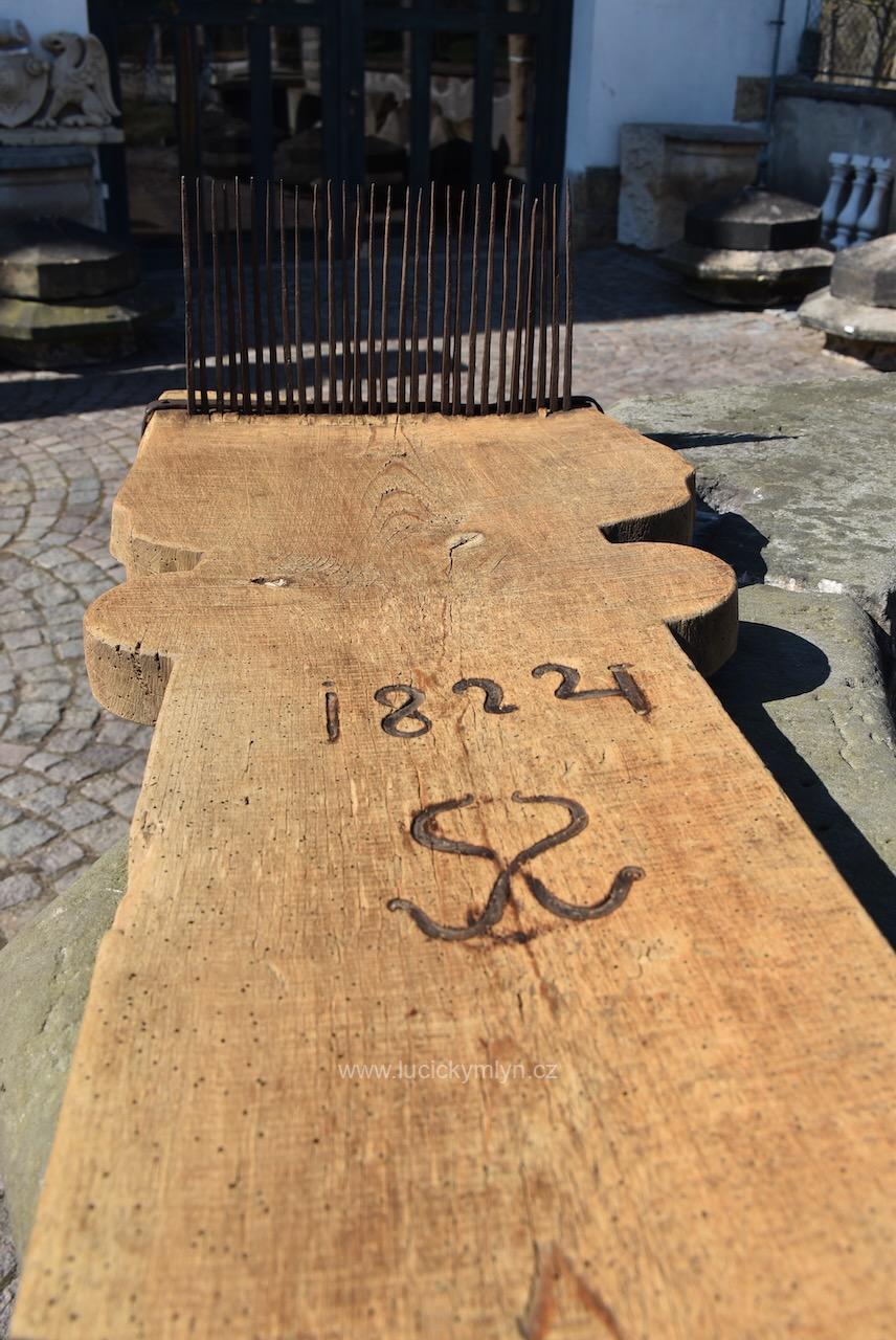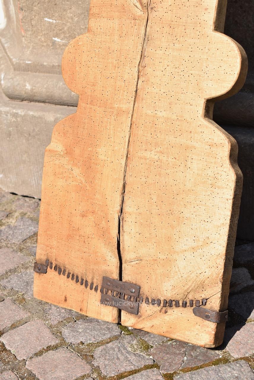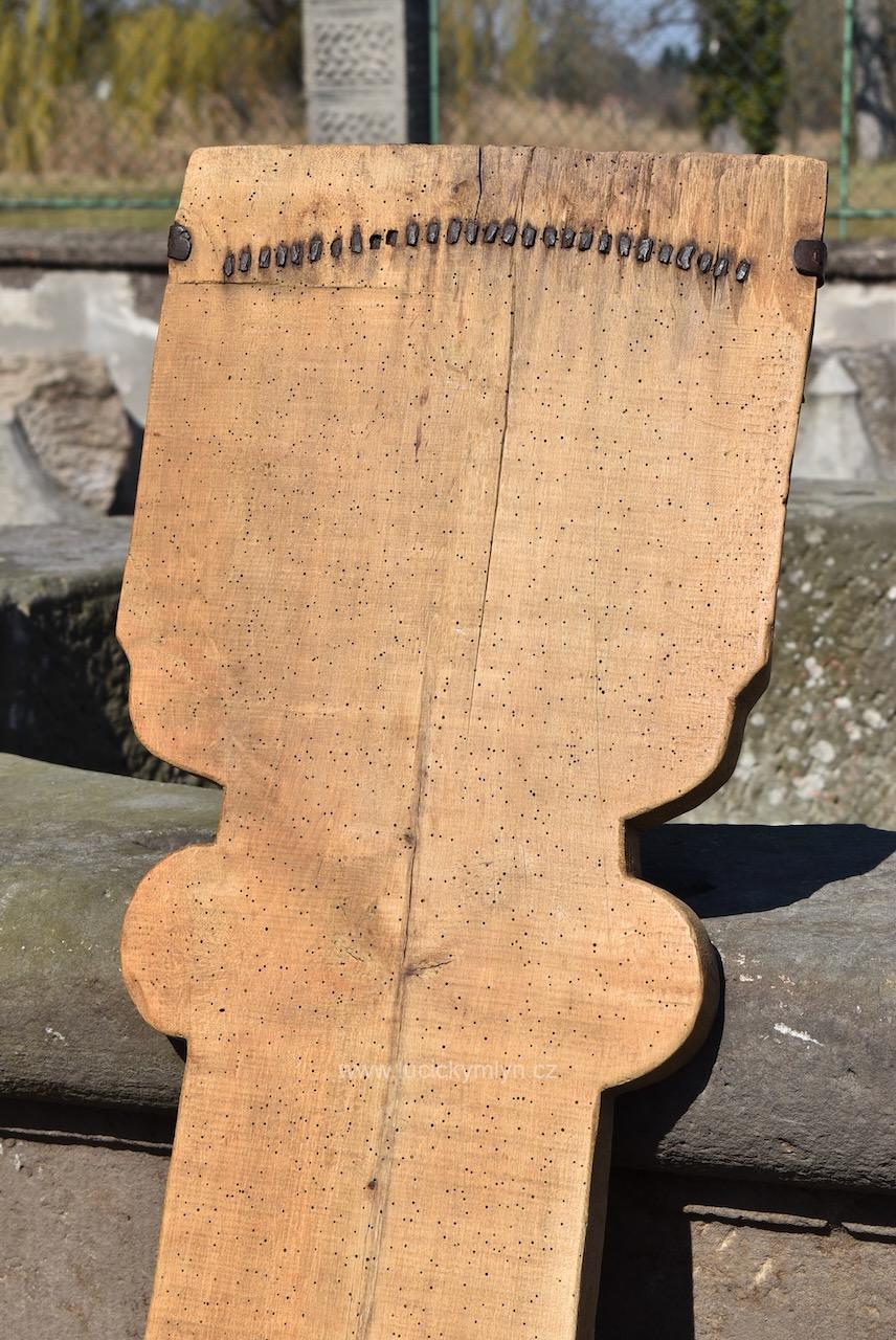 Unikátní starožitný dvouhlavý drhlen s vypálenou datací 1824, ojediněle vyrobený z masivní barokně vykrojené fošny, která je hustě osazena dlouhými a hraněnými, ručně kovanými hřeby